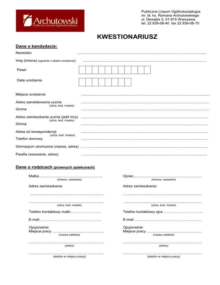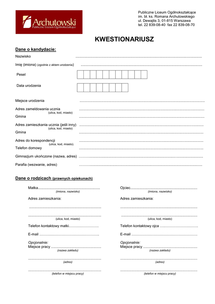 Publiczne Liceum Ogólnokształcące im. bł. ks. Romana Archutowskiego ul. Dewajtis 3, 01-815 Warszawa tel. 22 839-08-40 fax 22 839-08-70 KWESTIONARIUSZ Dane o kandydacie: Nazwisko .............................................................................................................................. Imię (imiona) (zgodnie z aktem urodzenia) ......................................................................................................................... Pesel Data urodzenia Miejsce urodzenia ............................................................................................................................. Adres zameldowania ucznia ............................................................................................................................. (ulica, kod, miasto) Gmina ............................................................................................................................. Adres zamieszkania ucznia (jeśli inny) ............................................................................................................................ (ulica, kod, miasto) Gmina ............................................................................................................................ Adres do korespondencji ............................................................................................................................ (ulica, kod, miasto). Telefon domowy ............................................................................................................................ Gimnazjum ukończone (nazwa, adres) ………................................................................................................................. ………................................................................................................................ Parafia (wezwanie, adres) Dane o rodzicach (prawnych opiekunach) Matka.............................................................. (imiona, nazwisko) Ojciec................................................................... (imiona, nazwisko) Adres zamieszkania: Adres zamieszkania: ........................................................................ ............................................................................. ......................................................................... ............................................................................ (ulica, kod, miasto) (ulica, kod, miasto) Telefon kontaktowy matki……………………. Telefon kontaktowy ojca ….………………………. E-mail ………………………………………….. E-mail ………………………………………………. Opcjonalnie: Miejsce pracy .................................................. Opcjonalnie: Miejsce pracy ...................................................... (nazwa zakładu) ......................................................................... (adres) ......................................................................... (telefon w miejscu pracy) (nazwa zakładu) ............................................................................. (adres) ............................................................................. (telefon w miejscu pracy) Zainteresowania przyrodnicze ekonomiczne geografia języki obce nauki ścisłe polonistyka społeczne historia artystyczne, jakie .................................................................................................................................. gra na instrumencie (jeśli tak to jakim) ……………………………………………………………………… sport, jaki .............................................................................................................................................. działalność w organizacjach i zajęciach pozalekcyjnych ...................................................................... ............................................................................................................................................................... nagrody i wyróżnienia, udział w olimpiadach i konkursach ................................................................... ............................................................................................................................................................... ministrant (lektor) schola parafialna wspólnota parafialna (jaka?) …………………………………………………… Dysleksja Czy u ucznia stwierdzono dysleksję? nie tak w roku ............................ Czy posiada aktualne zaświadczenie z poradni? nie tak Data wydania ostatniego zaświadczenia z Poradni Psychologiczno – Pedagogicznej …………………….. Czy uczęszcza na zajęcia reedukacyjne? ............................... nie tak w Dane dotyczące zdrowia kandydata 1. Moje dziecko JEST / NIE JEST uczulone na leki przeciwbólowe zawierające PARACETAMOL. W związku z tym WYRAŻAM ZGODĘ / NIE WYRAŻAM ZGODY* na podanie, w razie potrzeby, mojemu dziecku środków przeciwbólowych lub przeciwgorączkowych z zawartością paracetamolu. 2. Mojemu dziecku NIE WOLNO podawać następujących leków: .................................................................................................................................………………………… 3. Moje dziecko jest pod stałą opieką Poradni: .................................................................................................................................…………………………… 4. Moje dziecko regularnie przyjmuje następujące lekarstwa: ........................................................................................................................................................................ ........................................ (data) …………………............................................................. (podpis rodzica / opiekuna prawnego) 