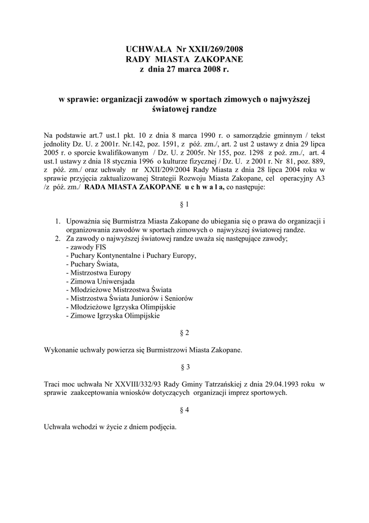 UCHWAŁA Nr XXII/269/2008 RADY MIASTA ZAKOPANE z dnia 27 marca 2008 r. w sprawie: organizacji zawodów w sportach zimowych o najwyŜszej światowej randze Na podstawie art.7 ust.1 pkt. 10 z dnia 8 marca 1990 r. o samorządzie gminnym / tekst jednolity Dz. U. z 2001r. Nr.142, poz. 1591, z póź. zm./, art. 2 ust 2 ustawy z dnia 29 lipca 2005 r. o sporcie kwalifikowanym / Dz. U. z 2005r. Nr 155, poz. 1298 z poź. zm./, art. 4 ust.1 ustawy z dnia 18 stycznia 1996 o kulturze fizycznej / Dz. U. z 2001 r. Nr 81, poz. 889, z póź. zm./ oraz uchwały nr XXII/209/2004 Rady Miasta z dnia 28 lipca 2004 roku w sprawie przyjęcia zaktualizowanej Strategii Rozwoju Miasta Zakopane, cel operacyjny A3 /z póź. zm./ RADA MIASTA ZAKOPANE u c h w a l a, co następuje: §1 1. UpowaŜnia się Burmistrza Miasta Zakopane do ubiegania się o prawa do organizacji i organizowania zawodów w sportach zimowych o najwyŜszej światowej randze. 2. Za zawody o najwyŜszej światowej randze uwaŜa się następujące zawody; - zawody FIS - Puchary Kontynentalne i Puchary Europy, - Puchary Świata, - Mistrzostwa Europy - Zimowa Uniwersjada - MłodzieŜowe Mistrzostwa Świata - Mistrzostwa Świata Juniorów i Seniorów - MłodzieŜowe Igrzyska Olimpijskie - Zimowe Igrzyska Olimpijskie §2 Wykonanie uchwały powierza się Burmistrzowi Miasta Zakopane. §3 Traci moc uchwała Nr XXVIII/332/93 Rady Gminy Tatrzańskiej z dnia 29.04.1993 roku w sprawie zaakceptowania wniosków dotyczących organizacji imprez sportowych. §4 Uchwała wchodzi w Ŝycie z dniem podjęcia.