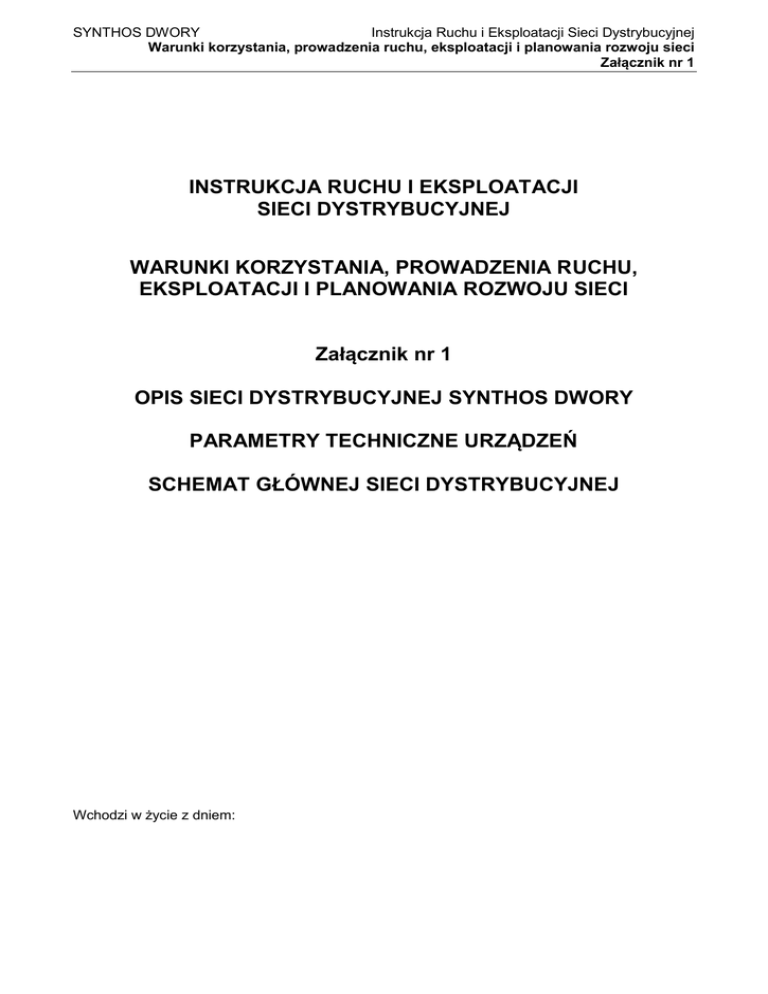SYNTHOS DWORY Instrukcja Ruchu i Eksploatacji Sieci Dystrybucyjnej Warunki korzystania, prowadzenia ruchu, eksploatacji i planowania rozwoju sieci Załącznik nr 1 INSTRUKCJA RUCHU I EKSPLOATACJI SIECI DYSTRYBUCYJNEJ WARUNKI KORZYSTANIA, PROWADZENIA RUCHU, EKSPLOATACJI I PLANOWANIA ROZWOJU SIECI Załącznik nr 1 OPIS SIECI DYSTRYBUCYJNEJ SYNTHOS DWORY PARAMETRY TECHNICZNE URZĄDZEŃ SCHEMAT GŁÓWNEJ SIECI DYSTRYBUCYJNEJ Wchodzi w życie z dniem: SYNTHOS DWORY Instrukcja Ruchu i Eksploatacji Sieci Dystrybucyjnej Warunki korzystania, prowadzenia ruchu, eksploatacji i planowania rozwoju sieci Załącznik nr 1 S P I S T R E Ś C I OPIS SIECI WYKORZYSTYWANYCH DO PROWADZENIA DZIAŁALNOŚCI OBJĘTEJ KONCESJĄ NA DYSTRYBUCJĘ ENERGII ELEKTRYCZNEJ ............................ 3 I.1. Informacje ogólne. ..................................................................................................... 3 I.2. Układ elektroenergetyczny. ........................................................................................ 4 II. PARAMETRY TECHNICZNE URZĄDZEŃ ............................................................................ 5 II.1. Wykaz jednostek wytwórczych przyłączonych do sieci 30 kV. .................................... 5 III. SCHEMAT GŁÓWNEJ SIECI DYSTRYBUCYJNEJ .............................................................. 6 III.1. Podstawowa struktura połączeń wraz z oznaczeniami głównych stacji elektroenergetycznych SYNTHOS DWORY. .............................................................. 6 Oznaczenia połączeń pomiędzy poszczególnymi stacjami el.en.: ............................................... 6 III.2. Schemat połączeń sieci SYNTHOS DWORY z siecią ENION SA .............................. 7 I. SYNTHOS DWORY Instrukcja Ruchu i Eksploatacji Sieci Dystrybucyjnej Warunki korzystania, prowadzenia ruchu, eksploatacji i planowania rozwoju sieci Załącznik nr 1 I. OPIS SIECI WYKORZYSTYWANYCH DO PROWADZENIA DZIAŁALNOŚCI OBJĘTEJ KONCESJĄ NA DYSTRYBUCJĘ ENERGII ELEKTRYCZNEJ I.1. Informacje ogólne. I.1.1. Głównymi stacjami zasilającymi sieć dystrybucyjną SYNTHOS DWORY są: 1) Stacja elektroenergetyczna sprzęgłowa 110/30 kV (Głównym Punktem Zasilającym GPZ-1) – oznaczona symbolem – numerem obiektu: A-141 - zasilana trzema transformatorami 110/30 kV, o mocach odpowiednio: a) transformator nr 2: 40 MVA; b) transformator nr 3: 60 MVA; c) transformator nr 4: 31,5 MVA; połączonymi liniami napowietrznymi 110 kV (łącznie ok. 1 km długości) z GPZ-tem 110 kV DWORY należącym do ENION SA Oddział w Bielsku-Białej. 2) Stacja rozdzielcza 30 kV kompleksu elektrociepłowni (Głównym Punktem Zasilającym GPZ-2) – oznaczona symbolem – numerem obiektu: B-107-B115 – do której przyłączone są obecnie trzy czynne (będące w eksploatacji) turbogeneratory 6 kV z transformatorami blokowymi 6/30 kV, o mocach odpowiednio: a) transformator turbogeneratora TG-8 – TB-8: 25 MVA; b) transformator turbogeneratora TG-10 – TB-10: 25 MVA; c) transformator turbogeneratora TG-12 – TB-12: 16 MVA; połączonymi z ww. rozdzielnią liniami kablowymi 30 kV. I.1.2. Stacje: A-141 oraz B-107-B-115 zlokalizowane są w dwu oddzielnych budynkach oddalonych od siebie około 400 metrów. Są to rozdzielnie wnętrzowe dwusekcyjne, trójsystemowe. Transformatory mocy wymienione w pkt. I.1.1.1) wyposażone są w podobciążeniowe przełączniki zaczepów – sterowane zdalnie z głównej nastawni elektrycznej usytuowanej w budynku B-111, natomiast transformatory blokowe wymienione w pkt. I.1.1.2) wyposażone są w bezobciążeniowe przełączniki zaczepów przełączane miejscowo. Do stacji sprzęgłowej A-141 przyłączone są dwie sekcje baterii kondensatorów 30 kV do centralnej kompensacji mocy biernej (zabudowane w budynku S-156). Stacja sprzęgłowa A-141 jest połączona pięcioma trasami kablowymi (ułożonymi w ziemi) 30 kV ze stacją rozdzielczą B-107-B-115 kompleksu elektrociepłowni. Cztery z tych tras pracują z dławikami zwarciowymi w celu ograniczenia skutków działania ewentualnych prądów zwarciowych. Ze stacji elektroenergetycznych A-141 oraz B-107-B-115 zasilane są stacje elektroenergetyczne transformatorowo-rozdzielcze 30/6 kV (Główne Punkty Rozdzielcze - GPR) oznaczone symbolami - numerami obiektów: C-88, E-117, C-142 oraz D-200. Stacje te zasilają bezpośrednio lub pośrednio pozostałe rozdzielnie SN pracujące w systemie elektroenergetycznym SYNTHOS DWORY. Wszystkie stacje elektroenergetyczne odbiorcze wymienione w pkt. I.1.6 wyposażone są w rozdzielnice 6 kV o przynajmniej podwójnym systemie szyn zbiorczych. W normalnym układzie pracy zasilane są one z dwóch różnych układów napięć wzajemnie rezerwowanych. Rozdzielnie C-88, C-142, E-117, D-200 oraz ‘Pompownia Soła’ wyposażone są w automatykę SZR. Wszystkie GPR-y wyposażone są w transformatory mocy 30/6 kV oraz, dla celów zasilania potrzeb własnych poszczególnych stacji i odbiorców nN, w transformatory 6/0,4 kV. Sieć 30 kV pracuje jako sieć skompensowana (za pomocą dławików Petersena), natomiast sieć 6 kV pracuje w układzie z izolowanymi punktami zerowymi transformatorów 30/6 kV. Sieć niskiego napięcia 500 V pracuje w układzie sieciowym IT, natomiast sieć 400 V w układzie sieciowym TN. I.1.3. I.1.4. I.1.5. I.1.6. I.1.7. I.1.8. I.1.9. I.1.10. SYNTHOS DWORY Instrukcja Ruchu i Eksploatacji Sieci Dystrybucyjnej Warunki korzystania, prowadzenia ruchu, eksploatacji i planowania rozwoju sieci Załącznik nr 1 I.2. Układ elektroenergetyczny. I.2.1. I.2.2. I.2.3. I.2.4. I.2.5. I.2.6. I.2.7. I.2.8. I.2.9. I.2.10. I.2.11. I.2.12. Operacyjnie układ elektroenergetyczny SYNTHOS DWORY składa się z dwóch równorzędnych układów napięć nazywanych: UKŁAD I i UKŁAD II. W normalnych warunkach pracy UKŁAD I i UKŁAD II są niezależne od siebie i połączone poprzez dowolnie wybrane transformatory 110/30 kV współpracują z niezależnymi układami stacji 1