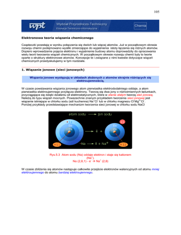105 Elektronowa teoria wiązania chemicznego Cząsteczki powstają w wyniku połączenia się dwóch lub więcej atomów. Już w początkowym okresie rozwoju chemii podejmowano wysiłki zmierzające do wyjaśnienia istoty łączenia się różnych atomów. Dopiero wprowadzenie pojęcia elektronu i wyjaśnienie budowy atomu doprowadziły do opracowania wielu teorii tworzenia wiązań chemicznych. W początkowym okresie rozwoju chemii były to teorie oparte o struktury elektronowe atomów. Koncepcje te i związane z nimi kwestie dotyczące wiązań chemicznych przedyskutujemy w tym rozdziale. 1. Wiązanie jonowe (sieci jonowych) Wiązania jonowe występują w układach złożonych z atomów skrajnie różniących się elektroujemnością. W czasie powstawania wiązania jonowego atom pierwiastka elektrododatniego oddaje, a atom pierwiastka elektroujemnego przyłącza elektrony. Tworzą się dwa jony o różnoimiennych ładunkach, przyciągające się dzięki działaniu sił elektrostatycznych, które w stanie stałym tworzą sieć jonową. Należą do typu wiązań mocnych. Powszechnie znanym przykładem tworzenia sieci jonowej jest wiązanie istniejące w chlorku sodu (sól kuchenna) Na+Cl- lub w chlorku magnezu Cl-Mg2+Cl-. Poniżej przykłady przedstawiające mechanizm tworzenia sieci jonowej w chlorku sodu NaCl Rys.5.3 Atom sodu (Na) oddaje elektron i staje się kationem + (Na ). Na (2,8,1) - e Na+ (2,8) W czasie zbliżenia się atomów następuje całkowite przejście elektronów walencyjnych od atomu mniej elektroujemnego do atomu bardziej elektroujemnego. 106 Rys.5.4 Atom chloru (Cl) przyjmuje elektron i staje się anionem (Cl-). Cl (2,8,7) + e- Cl- (2,8,8) Rys.5.5 Siły elektrostatycznego przyciągania zbliżają do siebie jony. Powstają jony, które przyciągają się siłami elektrostatycznego przyciągania. Każdy z jonów jest w stanie przechwycić z otoczenia jony o przeciwnym znaku. Jeżeli nie wystąpi oddziaływanie czynników zewnętrznych i jony nie mogą przemieszczać się tworzą sieć krystaliczną. W takiej sieci krystalicznej nie ma cząsteczek a są rozmieszczone w przestrzeni jony. Związki tworzące sieci jonowe składają się zatem z dodatnich i ujemnych jonów rozmieszczonych na przemian w przestrzeni a siły oddziaływania elektrostatycznego pomiędzy jonami są równomiernie rozłożone we wszystkich kierunkach uprzywilejowanych. 107 Rysunek 5.6 przedstawia strukturę chlorku sodowego w którym każdy jon sodu jest otoczony sześcioma jonami chlorkowymi, a z kolei każdy jon chlorkowy sześcioma jonami sodowymi i nie można rozróżnić, który z jonów sodu do którego z jonów chloru należy i na odwrót. Cały kryształ można tu traktować jako jedną makrocząsteczkę. Siły działające w układach o wiązaniu jonowym są znaczne, toteż temperatura topnienia i wrzenia tych związków jest stosunkowo wysoka. „Całkowita” wymiana elektronów jest możliwa tylko między atomami znacznie różniącymi się elektroujemnościami. Rys.5.6 Struktura kryształu NaCl. Podobny przebieg ma reakcja tworzenia cząsteczki tlenku magnezu MgO. 2Mg + O2 ----> 2 MgO W podanych przykładach konfigurację oktetową osiąga się przez przesunięcie elektronu(ów) od mniej do bardziej elektroujemnego atomu. Przykładowo w NaCl jon sodu osiąga konfigurację helowca występującego przed nim w układzie okresowym neonu, a jon chloru - konfigurację helowca występującego po nim w układzie okresowym argonu. Podobnie w cząsteczce MgO. Typowymi związkami jonowymi są halogenki, tlenki oraz siarczki litowców i berylowców. Z wiązaniem jonowym spotykamy się również w cząsteczkach soli kwasów tlenowych, które występuje między kationem metalu a anionem reszty kwasowej. Charakterystyczne dla związków chemicznych o budowie jonowej jest przewodzenie prądu elektrycznego po stopieniu lub rozpuszczeniu w wodzie. 2. Wiązanie atomowe (kowalencyjne) Wiązania atomowe (kowalencyjne) powstają, gdy łączą się z sobą atomy pierwiastków elektroujemnych o takich samych wartościach elektroujemnością Podobnie jak w wiązaniu jonowym, wiążące się atomy dążą do osiągnięcia struktury oktetowej najbliższego gazu szlachetnego. Osiągnięcie korzystnej struktury oktetowej (dubletu) osiągane jest w wyniku uwspólnienia jednej lub kilku par elektronów walencyjnych pochodzących od różnych atomów. Wiązania tego typu występują w cząsteczkach H2, Cl2, O2, N2 itp. Przykładem jest wodór, którego pojedyńczy atom ma jeden elektron a strukturę najbliższego gazu szlachetnego (He) może osiągnąć przyjmując jeden elektron. Gdy dwa atomy wodoru tworzą cząsteczkę (rys. 5.7), oddają do wspólnego „użytkowania” po jednym elektronie, które rozmieszczają się symetrycznie wokół obydwu jąder, tworząc parę elektronową. 108 Rys.5.7 Mechanizm powstawania wiązania kowalencyjnego w cząsteczce wodoru. Każdy atom wodoru "wykorzystuje" wspólnie dwa elektrony i z tego powodu cząsteczka wodoru jest uboższa energetycznie niż dwa oddzielne atomy a konfiguracja elektronowa staje się podobna do konfiguracji helu; toteż, aby rozbić cząsteczkę wodoru na atomy, należy doprowadzić do niej pewną ilość energii. W podobny sposób powstają cząsteczki chloru, bromu, jodu i innych. Poniżej na rysunku 5.8 przedstawiono mechanizm tworzenia wiązania kowalencyjnego w cząsteczce chloru. Rys.5.8 Mechanizm powstawania wiązania kowalencyjnego w cząsteczce chloru. Pary elektronowe można oznaczać również kreskami. Otrzymuje się wówczas klasyczne wzory strukturalne cząsteczek, np.: H2 H--H, Cl2 Cl--Cl 109 Pary elektronów walencyjnych nie biorących udziału w wiązaniu noszą nazwę wolnych elektronów. Jeżeli utworzenie jednej wiążącej pary elektronowej nie wystarcza do utworzenia oktetu, atom może wykorzystać dwa lub trzy elektrony tworząc wiązania podwójne (rys. 5.10) lub potrójne (rys. 5.9). Rys.5.9 Mechanizm powstawania wiązania kowalen