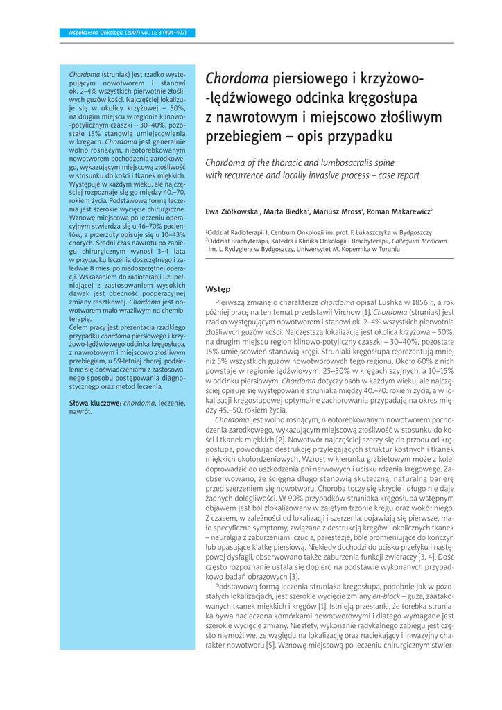 Współczesna Onkologia (2007) vol. 11; 8 (404–407) Chordoma (struniak) jest rzadko występującym nowotworem i stanowi ok. 2–4% wszystkich pierwotnie złośliwych guzów kości. Najczęściej lokalizuje się w okolicy krzyżowej – 50%, na drugim miejscu w regionie klinowo-potylicznym czaszki – 30–40%, pozostałe 15% stanowią umiejscowienia w kręgach. Chordoma jest generalnie wolno rosnącym, nieotorebkowanym nowotworem pochodzenia zarodkowego, wykazującym miejscową złośliwość w stosunku do kości i tkanek miękkich. Występuje w każdym wieku, ale najczęściej rozpoznaje się go między 40.–70. rokiem życia. Podstawową formą leczenia jest szerokie wycięcie chirurgiczne. Wznowę miejscową po leczeniu operacyjnym stwierdza się u 46–70% pacjentów, a przerzuty opisuje się u 10–43% chorych. Średni czas nawrotu po zabiegu chirurgicznym wynosi 3–4 lata w przypadku leczenia doszczętnego i zaledwie 8 mies. po niedoszczętnej operacji. Wskazaniem do radioterapii uzupełniającej z zastosowaniem wysokich dawek jest obecność pooperacyjnej zmiany resztkowej. Chordoma jest nowotworem mało wrażliwym na chemioterapię. Celem pracy jest prezentacja rzadkiego przypadku chordoma piersiowego i krzyżowo-lędźwiowego odcinka kręgosłupa, z nawrotowym i miejscowo złośliwym przebiegiem, u 59-letniej chorej, podzielenie się doświadczeniami z zastosowanego sposobu postępowania diagnostycznego oraz metod leczenia. Słowa kluczowe: chordoma, leczenie, nawrót. Chordoma piersiowego i krzyżowo-lędźwiowego odcinka kręgosłupa z nawrotowym i miejscowo złośliwym przebiegiem – opis przypadku Chordoma of the thoracic and lumbosacralis spine with recurrence and locally invasive process – case report Ewa Ziółkowska1, Marta Biedka2, Mariusz Mross1, Roman Makarewicz2 1Oddział Radioterapii I, Centrum Onkologii im. prof. F. Łukaszczyka w Bydgoszczy Brachyterapii, Katedra i Klinika Onkologii i Brachyterapii, Collegium Medicum im. L. Rydygiera w Bydgoszczy, Uniwersytet M. Kopernika w Toruniu 2Oddział Wstęp Pierwszą zmianę o charakterze chordoma opisał Lushka w 1856 r., a rok później pracę na ten temat przedstawił Virchow [1]. Chordoma (struniak) jest rzadko występującym nowotworem i stanowi ok. 2–4% wszystkich pierwotnie złośliwych guzów kości. Najczęstszą lokalizacją jest okolica krzyżowa – 50%, na drugim miejscu region klinowo-potyliczny czaszki – 30–40%, pozostałe 15% umiejscowień stanowią kręgi. Struniaki kręgosłupa reprezentują mniej niż 5% wszystkich guzów nowotworowych tego regionu. Około 60% z nich powstaje w regionie lędźwiowym, 25–30% w kręgach szyjnych, a 10–15% w odcinku piersiowym. Chordoma dotyczy osób w każdym wieku, ale najczęściej opisuje się występowanie struniaka między 40.–70. rokiem życia, a w lokalizacji kręgosłupowej optymalne zachorowania przypadają na okres między 45.–50. rokiem życia. Chordoma jest wolno rosnącym, nieotorebkowanym nowotworem pochodzenia zarodkowego, wykazującym miejscową złośliwość w stosunku do kości i tkanek miękkich [2]. Nowotwór najczęściej szerzy się do przodu od kręgosłupa, powodując destrukcję przylegających struktur kostnych i tkanek miękkich okołordzeniowych. Wzrost w kierunku grzbietowym może z kolei doprowadzić do uszkodzenia pni nerwowych i ucisku rdzenia kręgowego. Zaobserwowano, że ścięgna długo stanowią skuteczną, naturalną barierę przed szerzeniem się nowotworu. Choroba toczy się skrycie i długo nie daje żadnych dolegliwości. W 90% przypadków struniaka kręgosłupa wstępnym objawem jest ból zlokalizowany w zajętym trzonie kręgu oraz wokół niego. Z czasem, w zależności od lokalizacji i szerzenia, pojawiają się pierwsze, mało specyficzne symptomy, związane z destrukcją kręgów i okolicznych tkanek – neuralgia z zaburzeniami czucia, parestezje, bóle promieniujące do kończyn lub opasujące klatkę piersiową. Niekiedy dochodzi do ucisku przełyku i następowej dysfagii, obserwowano także zaburzenia funkcji zwieraczy [3, 4]. Dość często rozpoznanie ustala się dopiero na podstawie wykonanych przypadkowo badań obrazowych [3]. Podstawową formą leczenia struniaka kręgosłupa, podobnie jak w pozostałych lokalizacjach, jest szerokie wycięcie zmiany en-block – guza, zaatakowanych tkanek miękkich i kręgów [1]. Istnieją przesłanki, że torebka struniaka bywa nacieczona komórkami nowotworowymi i dlatego wymagane jest szerokie wycięcie zmiany. Niestety, wykonanie radykalnego zabiegu jest często niemożliwe, ze względu na lokalizację oraz naciekający i inwazyjny charakter nowotworu [5]. Wznowę miejscową po leczeniu chirurgicznym stwier- Współczesna Onkologia (2007) vol. 11; 8 (404–407) Chordomas are uncommon tumours, accounting for 2-4% of all primary malignant bone tumours. The location of the tumours in decreasing frequency is: the sacrococcygeal region, 50%; spheno-occipital region, 30-40%; and other spinal segments, 15%. Most patients are aged from 40 to 70 years. The standard therapy is radical resection. Local recurrence rate of sacrococcygeal chordomas after surgery is about 46-70% and prevalence of metastasis is 10-43%. The median times to recurrence after surgery are 3.4 years for radical resection and 8 months for subtotal excision. High-dose radiation is increasingly used in combination with surgery for non-resectable lesions. Chordoma has a low sensitivity to chemotherapy. The purpose of our work is to show a very rare case of chordoma of the thoracic and lumbosacral spine with recurrence and locally invasive process in a 59-year-old woman and demonstrate our experience from adjusted diagnostic workup and approach of treatment. Key words: chordoma, treatment, recurrence. dza się u 46–70% pacjentów, a przerzuty opisuje się u 10–43% chorych. Najczęstszym miejscem przerzutów są płuca, regionalne węzły chłonne, wątroba, kości i skóra. Na podstawie badań au