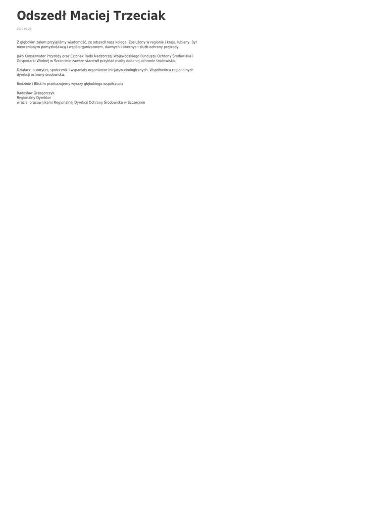 Odszedł Maciej Trzeciak 2016-09-29 Z głębokim żalem przyjęliśmy wiadomość, że odszedł nasz kolega. Zasłużony w regionie i kraju, lubiany. Był nieocenionym pomysłodawcą i współorganizatorem, dawnych i obecnych służb ochrony przyrody. Jako Konserwator Przyrody oraz Członek Rady Nadzorczej Wojewódzkiego Funduszu Ochrony Środowiska i Gospodarki Wodnej w Szczecinie zawsze stanowił przykład osoby oddanej ochronie środowiska. Działacz, autorytet, społecznik i wspaniały organizator inicjatyw ekologicznych. Współtwórca regionalnych dyrekcji ochrony środowiska. Rodzinie i Bliskim przekazujemy wyrazy głębokiego współczucia Radosław Grzegorczyk Regionalny Dyrektor wraz z pracownikami Regionalnej Dyrekcji Ochrony Środowiska w Szczecinie