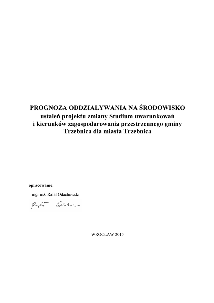 PROGNOZA ODDZIAŁYWANIA NA ŚRODOWISKO ustaleń projektu zmiany Studium uwarunkowań i kierunków zagospodarowania przestrzennego gminy Trzebnica dla miasta Trzebnica opracowanie: mgr inż. Rafał Odachowski WROCŁAW 2015 Spis treści 1. Wprowadzenie..................................................................................................................... 3 1.1. Podstawa prawna, cel i zakres opracowania ................................................................... 3 1.2. Wykorzystane materiały i metody pracy......................................................................... 3 1.3. Informacje o zawartości, głównych celach projektowanego dokumentu ....................... 4 2. Ocena stanu i funkcjonowania środowiska oraz tendencje zmian przy braku realizacji zmiany Studium......................................................................................................... 5 2.1 Charakterystyka środowiska przyrodniczego................................................................ 5 2.2. Stan środowiska i występujące zagrożenia ................................................................. 10 2.3. Tendencje przeobrażeń przy braku realizacji zmiany studium ................................... 16 3. Analiza ustaleń projektowanego dokumentu i ocena zgodności z uwarunkowaniami ekofizjograficznymi ................................................................................................................ 16 3.1 Ustalenia dotyczące rozwoju zabudowy ..................................................................... 16 3.2. Ustalenia dotyczące rozwoju systemów infrastruktury technicznej ........................... 18 3.3. Ustalenia w zakresie rozwoju układu komunikacyjnego ............................................ 18 3.4. Ustalenia dotyczące rozwoju energetyki odnawialnej ................................................ 19 3.5. Ocena zgodności z uwarunkowaniami ekofizjograficznymi ..................................... 20 4. Przewidywany wpływ realizacji ustaleń projektu zmiany Studium na środowisko ......... 20 4.1 Analiza wpływu ustaleń zmiany studium na środowisko ........................................... 20 4.2. Oddziaływanie Studium poza obszarem opracowania................................................ 25 4.3. Informacje o możliwym transgranicznym oddziaływaniu na środowisko.................. 25 4.4. Oddziaływanie na formy ochrony przyrody................................................................ 25 4.5. Informacje zawarte w prognozach oddziaływania na środowisko sporządzonych dla innych dokumentów powiązanych z projektem MPZP............................................... 26 4.6. Kompleksowa ocena skutków wpływu ustaleń zmiany Studium na środowisko ......... 27 5. Propozycje metod analizy realizacji postanowień projektu analizowanego dokumentu............................................................................................................................... 30 6. Przedstawienie rozwiązań mających na celu zapobieganie, ograniczenie lub kompensację przyrodniczą negatywnych oddziaływań na środowisko .................................. 30 7. Przedstawienie rozwiązań alternatywnych do rozwiązań zawartych w projekcie zmiany studium ....................................................................................................................... 31 8. Informacje o celach ochrony środowiska i powiązania z innymi dokumentami .............. 31 9. Streszczenie....................................................................................................................... 33 2 1. Wprowadzenie 1.1. Podstawa prawna, cel i zakres opracowania Obowiązek sporządzenia prognozy oddziaływania na środowisko ustaleń projektu zmian studium uwarunkowań i kierunków zagospodarowania przestrzennego gminy wynika z art. 46 ustawy z dnia 3 października 2008 r. o udostępnianiu informacji o środowisku i jego ochronie, udziale społeczeństwa w ochronie środowiska oraz o ocenach oddziaływania na środowisko, która jednocześnie ustala zakres merytoryczny opracowania. Organ opracowujący projekt Studium jest zobowiązany do sporządzenia prognozy oddziaływania na środowisko (art. 51, ust. 1) oraz przeprowadzenia postępowania w sprawie oceny oddziaływania na środowisko skutków realizacji studium i zapewnić w nim udział społeczeństwa (art. 54, ust 1 i 2). Art. 50 zobowiązuje do przeprowadzenia strategicznej oceny oddziaływania na środowisko także w przypadku wprowadzania zmian do już przyjętego dokumentu. Zmiana studium została zainicjowana Uchwałą Nr V/51/15 Rady Miejskiej w Trzebnicy z dnia 30 marca 2015 r. w sprawie przystąpienia do zmiany Studium uwarunkowań i kierunków zagospodarowania przestrzennego gminy Trzebnica dla miasta Trzebnica. Celem sporządzenia prognozy jest ocena skutków (zarówno negatywnych, jak i pozytywnych), jakie mogą wynikać z projektowanego przeznaczenia terenu oraz realizacji ustaleń projektu Studium na środowisko, a w szczególności na różnorodność biologiczną, ludzi, zwierzęta, rośliny, wodę, powietrze, powierzchnię ziemi, krajobraz, klimat, zasoby naturalne oraz zabytki, z uwzględnieniem wzajemnych powiązań między tymi elementami. W opracowaniu przedstawiono analizę stanu i funkcjonowania środowiska. Ponadto prognoza ocenia rozwiązania funkcjonalno-przestrzenne i inne ustalenia zawarte w projekcie zmiany Studium pod kątem zgodności z uwarunkowaniami ekofizjograficznymi, zgodności z przepisami prawa dotyczącymi ochrony środowiska (w szczególności dotyczące obszarów podlegających ochronie na podstawie ustawy z dnia 16 kwietnia 2004 r. o ochronie przyrody) oraz ochrony różnorodności biologicznej. Prognoza identyfikuje przewidywane zagrożenia dla środowiska, które mogą powstać na terenach znajdujących się w zasięgu oddziaływania wynikającego z realizacji ustaleń Studium. 1.2. Wykorzystane materiały 