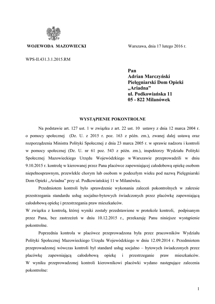 WOJEWODA MAZOWIECKI Warszawa, dnia 17 lutego 2016 r. WPS-II.431.3.1.2015.RM Pan Adrian Marczyński Pielęgniarski Dom Opieki „Ariadna” ul. Podkowiańska 11 05 - 822 Milanówek WYSTĄPIENIE POKONTROLNE Na podstawie art. 127 ust. 1 w związku z art. 22 ust. 10 ustawy z dnia 12 marca 2004 r. o pomocy społecznej (Dz. U. z 2015 r. poz. 163 z późn. zm.), zwanej dalej ustawą oraz rozporządzenia Ministra Polityki Społecznej z dnia 23 marca 2005 r. w sprawie nadzoru i kontroli w pomocy społecznej (Dz. U. nr 61 poz. 543 z późn. zm.), inspektorzy Wydziału Polityki Społecznej Mazowieckiego Urzędu Wojewódzkiego w Warszawie przeprowadzili w dniu 9.10.2015 r. kontrolę w kierowanej przez Pana placówce zapewniającej całodobową opiekę osobom niepełnosprawnym, przewlekle chorym lub osobom w podeszłym wieku pod nazwą Pielęgniarski Dom Opieki „Ariadna” przy ul. Podkowiańskiej 11 w Milanówku. Przedmiotem kontroli było sprawdzenie wykonania zaleceń pokontrolnych w zakresie przestrzegania standardu usług socjalno-bytowych świadczonych przez placówkę zapewniającą całodobową opiekę i przestrzegania praw mieszkańców. W związku z kontrolą, której wyniki zostały przedstawione w protokole kontroli, podpisanym przez Pana, bez zastrzeżeń w dniu 10.12.2015 r., przekazuję Panu niniejsze wystąpienie pokontrolne. Poprzednia kontrola w placówce przeprowadzona była przez pracowników Wydziału Polityki Społecznej Mazowieckiego Urzędu Wojewódzkiego w dniu 12.09.2014 r. Przedmiotem przeprowadzonej wówczas kontroli był standard usług socjalno – bytowych świadczonych przez placówkę zapewniającą całodobową opiekę i przestrzeganie praw mieszkańców. W wyniku przeprowadzonej kontroli kierownikowi placówki wydano następujące zalecenia pokontrolne: 1 1. Niezwłocznie wystąpić z wnioskiem do Wojewody Mazowieckiego dotyczącym zwiększenia liczby miejsc w placówce lub przywrócić liczbę miejsc zgodną z podaną we wniosku o uzyskanie zezwolenia; 2. Zagwarantować w placówce standard określony w art. 68 i 68a ustawy z dnia 12 marca 2004 r. o pomocy społecznej, tj.: a) prowadzić ewidencję przypadków korzystania ze świadczeń zdrowotnych na terenie placówki, b) spowodować aby w celu skorzystania z windy nie trzeba było przechodzić przez pokój mieszkalny, c) karty zaleceń lekarskich uzupełnić o podpis lekarza. W wyniku działań kontrolnych ustalono następujący stan faktyczny. Wniosek o zezwolenie na prowadzenie działalności gospodarczej w zakresie prowadzenia placówki zapewniającej całodobową opiekę osobom niepełnosprawnym, przewlekle chorym lub osobom w podeszłym wieku, który był podstawą do wydania zezwolenia na prowadzenie ww. działalności określał liczbę miejsc na 15 osób. W dniu kontroli placówka była zorganizowana na 16 miejsc, przebywało w niej 16 osób. Wśród mieszkańców placówki były 3 osoby samodzielne, 4 osoby leżące, pozostałe osoby wymagały wspomagania w podstawowych czynnościach życiowych. Główne schorzenia występujące wśród mieszkańców wynikały z ich podeszłego wieku. Ponadto 14 mieszkańców korzystało z pieluchomajtek. Budynek, w którym funkcjonuje placówka jest dwukondygnacyjny (parter, poddasze użytkowe). Mieszkańcy placówki zajmują pomieszczenia na obu kondygnacjach budynku. Budynek i otoczenie pozbawione są barier architektonicznych. Komunikacja pionowa odbywa się za pomocą klatki schodowej oraz windy, która na piętrze zatrzymuje się przy balkonie jednego z pokoi mieszkalnych, w którym w dniu kontroli zamieszkiwała jedna osoba. Na zewnątrz budynku znajduje się tablica z informacją o rodzaju posiadanego zezwolenia, oraz numerze wpisu do rejestru placówek zapewniających całodobową opiekę. Wewnątrz placówki brak informacji dotyczącej zakresu prowadzonej w placówce działalności oraz podmiotu prowadzącego placówkę. W placówce znajduje się 7 pokoi mieszkalnych: 3 pokoje trzyosobowe, 3 pokoje dwuosobowe, pokój jednoosobowy. Wszystkie pokoje spełniają standard pod względem wyposażenia. W placówce był pokój dziennego pobytu służący jako jadalnia. Placówka zapewniała pięć podstawowych posiłków dziennie. Ponadto z uzyskanej informacji wynika, że istniał dostęp do drobnych posiłków i napojów między posiłkami. 2 Z pomieszczeń sanitarnych placówka dysponowała 3 łazienkami oraz 4 toaletami. Odnosząc się do standardu w zakresie sanitariatów należy zauważyć, że uwzględniając liczbę mieszkańców liczba łazienek jest zbyt mała. Zgodnie ze standardem jedna łazienka powinna być przeznaczona dla nie więcej niż 5 osób. Wszystkie pomieszczenia sanitarne wyposażone są w uchwyty ułatwiające osobom mniej sprawnym korzystanie z tych pomieszczeń. W placówce znajduje się pomieszczenie pomocnicze do prania i suszenia. Personel placówki stanowią: 3 pielęgniarki, 3 opiekunki i 2 kucharki. W ciągu dnia i w nocy dyżur pełnią 2 osoby: pielęgniarka i opiekunka. Podstawową opiekę medyczną świadczy lekarz z Przychodni Zdrowia w Brwinowie. Konsultacje lekarzy specjalistów odbywają się w ramach NFZ. W placówce znajduje się pomieszczenie, w którym przechowywane i rozkładane są leki mieszkańców. Leki rozkłada pielęgniarka. W trakcie kontroli ustalono, że w placówce jest prowadzona dokumentacja dotycząca osób w niej przebywających zawierająca: umowę o świadczeniu usług, dane identyfikacyjne osób przebywających w placówce, dane kontaktowe najbliższej rodziny lub innych osób wskazanych przez osobę przebywającą w placówce, informacje dotyczące stanu zdrowia osoby przebywającej w placówce. Jednak dokumentacja dotycząca mieszkańców nie była kompletna. Ewidencja przypadków korzystania ze świadczeń na terenie placówki ze wskazaniem daty i zakresu tych świadczeń oraz danych świadczeniodawcy udzielającego świadczeń nie była prowadzona na bieżąco. Ostatni wpis lekarza współpracujące