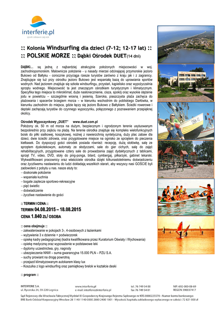 :: Kolonia Windsurfing dla dzieci (7-12; 12-17 lat) :: :: POLSKIE MORZE :: Dąbki Ośrodek DUET(14 dni) DĄBKI… są jedną z najbardziej atrakcyjnie położonych miejscowości w woj. zachodniopomorskim. Malownicze położenie - u nasady mierzei odcinającej przymorskie jezioro Bukowo od Bałtyku - corocznie przyciąga rzesze turystów zarówno z kraju jak i z zagranicy. Znajdujące się tuż przy ośrodku jezioro Bukowo jest wspaniałą bazą do uprawiania sportów wodnych. Nad jeziorem znajduje się szkoła windsurfingu, przystań, kąpielisko oraz wypożyczalnia sprzętu wodnego. Miejscowość ta jest znaczącym ośrodkiem turystycznym i klimatycznym. Specyfika tego miejsca to mikroklimat, duże nasłonecznienie, cisza, spokój oraz wysokie stężenie jodu w powietrzu – szczególnie wiosną i jesienią. Szeroka, piaszczysta plaża zachęca do plażowania i spacerów brzegiem morza – w kierunku wschodnim do pobliskiego Darłówka, w kierunku zachodnim do miejsca, gdzie łączy się jezioro Bukowo z Bałtykiem. Ścieżki rowerowe i deptaki zachęcają turystów do czynnego wypoczynku, połączonego z poznawaniem przepięknej okolicy. Ośrodek Wypoczynkowy „DUET” www.duet.com.pl Położony ok. 50 m od morza na dużym, bezpiecznym i ogrodzonym terenie usytuowanym bezpośrednio przy zejściu na plażę. Na terenie ośrodka znajduje się kompleks wielofunkcyjnych boisk do piłki siatkowej, koszykowej, nożnej z nawierzchnią syntetyczną, duży plac zabaw dla dzieci, dwie ścieżki zdrowia, oraz przygotowane miejsce na ognisko ze sprzętem do pieczenia kiełbasek. Do dyspozycji gości ośrodek posiada również: recepcję, dużą stołówkę, salę ze sprzętem dyskotekowym, automaty ze słodyczami, sale do gier cichych, salę do zajęć rehabilitacyjnych, przygotowane cztery sale do prowadzenia zajęć dydaktycznych z tablicami, sprzęt TV, video, DVD, stoły do ping-ponga, bilard, cymbergaj, piłkarzyki, gabinet lekarski. Wykwalifikowani pracownicy oraz właściciele ośrodka dzięki kilkunastoletniemu doświadczeniu oraz życzliwemu nastawieniu do ludzi dokładają wszelkich starań, aby wszyscy nasi GOŚCIE byli zadowoleni z pobytu u nas. nasze atuty to: doskonałe położenie wspaniała kuchnia bogate zaplecze sportowo-rekreacyjne pięć świetlic doświadczenie życzliwe nastawienie do gości :: TERMIN I CENA :: TERMIN 04.08.2015 – 18.08.2015 CENA 1.840 ZŁ/ OSOBA :: cena obejmuje :: zakwaterowanie w pokojach 3-, 4-osobowych z łazienkami wyżywienie 3 x dziennie + podwieczorek opiekę kadry pedagogicznej (kadra kwalifikowana przez Kuratorium Oświaty i Wychowania) opiekę medyczną oraz wyposażenie w podstawowe leki dyplomy uczestnictwa, gry, nagrody ubezpieczenie NNW – suma gwarancyjna 15.000 PLN – PZU S.A. suchy prowiant na drogę powrotną przejazd klimatyzowanym autokarem klasy lux Koszulka z logo windsurfing oraz pamiątkowy brelok w kształcie deski :: program :: plażowanie, kąpiele słoneczne, kąpiele w morzu, zabawy i konkursy plażowe wycieczki piesze po najbliższe okolicy udział w zajęciach sportowo-rekreacyjnych wycieczki rowerowe ognisko z pieczeniem kiełbasek dyskoteki i zabawy na terenie ośrodka zawody sportowe na plaży i terenie ośrodka seanse video Program sportowy Kurs windsurfingowy 8 x 1,5 h Szkolenie windsurfingowe obejmujące podstawowe manewry, pływanie na kursie, szkolenie teoretyczne, regaty. Każdy uczestnik podczas szkolenia będzie miał dopasowany komplet windsurfingowy pod względem umiejętności i warunków pogodowych, strój neoprenowy typ shorty, kamizelkę asekuracyjną (obowiązkową), asekurację WOPR, instruktora 1 max 10 uczestników. Po stronie uczestnika jest posiadanie obuwia przeznaczonego do zamoczenia. Szkolenie kajakarskie podstawowe 1 x 1,5h. Nauka wiosłowania i manewrów na kajaku 1 osobowym lub dwu osobowym mająca na celu przygotowanie uczestników do wyprawy wikingów. W cenie asekuracja WOPR . Wyprawa wikingów 1 x 3 h Wyprawa na łodzi wiosłowej max 18 os + kajaki 2 osobowe o charakterze przygodowo – przyrodniczym w kierunku połączenia morza z jeziorem (przekopu) + poszukiwanie bursztynów (płukanie piachu przez sita) można zorganizować pieczenie kiełbasek (prowiant po stronie uczestników) Rejs statkiem po jeziorze 1 x 1 h Rejs wycieczkowy po jeziorze – w programie chrzest, animacja pod nazwą „statek tonie” – na środku jeziora uczestnicy w kamizelkach wskakują do wody i przedostają się na tratwę ratunkową, która później jest ciągnięta za statkiem. Event plażowy 1 x 2, 5h Zabawy w podgrupach 15 osobowych: latawce dwulinkowe typ kite- manewrowanie służące do przygotowania do dyscypliny kit-surfing, zawody łucznicze, skim-boarding ślizganie się na deskach po wodzie. ZAŁOZENIA : 1. GRUPA 45 OSÓB – dzieci/ młodzież wiek różny, płeć mix 2. Każda osoba korzysta z zajęć programowych (poziom sprawności fizycznej bez znaczenia) 3. Istniej możliwość szkolenia ,,wszyscy na raz” lub podział na 2 grupy CENA OBEJMUJE: 13 noclegów w ośrodku w pokojach 3, 4, 5 osobowych z łazienką wyżywienie w stołówce ośrodka: śniadanie i kolacja w formie bufetu, obiad serwowany do stolika; napoje w cenie, podwieczorek opieka kierownika, oraz wykwalifikowanej kadry wychowawczej w ilości 1 osoba na 15 uczestników, od momentu wyjazdu do momentu powrotu opieka ratowników WOPR z aktualnymi uprawnieniami nad morzem opieka medyczna w ośrodku: całodobowa opieka pielęgniarki, lekarz na wezwanie program kolonii dostosowany do wieku uczestników: program turystyczny, program sportowy ubezpieczenie NNW Signal Iduna do kwoty 5.000 zł nagrody gadżet płyta ze zdjęciami z pobytu napoje w trakcie podróży dyskoteki wieczory filmowe dostęp do wszystkich atrakcji obiektu (boiska, place zabaw itp..)