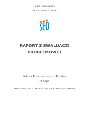 Nadzór pedagogiczny System Ewaluacji Oświaty RAPORT Z EWALUACJI PROBLEMOWEJ Szkoła Podstawowa w Minodze Minoga Małopolski Kurator Oświaty Kuratorium Oświaty w Krakowie Wstęp Prezentowany raport jest rezultatem ewaluacji zewnętrznej przeprowadzonej w szkole przez wizytatorów do spraw ewaluacji. Raport z ewaluacji problemowej dotyczy jednego lub kilku z przedstawionych poniżej wymagań państwa. Ewaluacja zewnętrzna polega na zbieraniu i analizowaniu informacji na temat funkcjonowania szkoły w obszarach wyznaczonych przez wymagania państwa: 1. Szkoła lub placówka realizuje koncepcję pracy ukierunkowaną na rozwój uczniów. 2. Procesy edukacyjne są zorganizowane w sposób sprzyjający uczeniu się. 3. Uczniowie nabywają wiadomości i umiejętności określone w podstawie programowej. 4. Uczniowie są aktywni. 5. Respektowane są normy społeczne. 6. Szkoła lub placówka wspomaga rozwój uczniów, z uwzględnieniem ich indywidualnej sytuacji. 7. Nauczyciele współpracują w planowaniu i realizowaniu procesów edukacyjnych. 8. Promowana jest wartość edukacji. 9. Rodzice są partnerami szkoły lub placówki. 10. Wykorzystywane są zasoby szkoły lub placówki oraz środowiska lokalnego na rzecz wzajemnego rozwoju. 11. Szkoła lub placówka, organizując procesy edukacyjne, uwzględnia wnioski z analizy wyników sprawdzianu, egzaminu gimnazjalnego, egzaminu maturalnego, egzaminu potwierdzającego kwalifikacje zawodowe i egzaminu potwierdzającego kwalifikacje w zawodzie oraz innych badań zewnętrznych i wewnętrznych. 12. Zarządzanie szkołą lub placówką służy jej rozwojowi. Ewaluacja ma także na celu ustalenie poziomu spełniania przez szkołę wymagań zawartych w załączniku do Rozporządzenia Ministra Edukacji Narodowej w sprawie nadzoru pedagogicznego z dnia 7 października 2009 r. wraz z nowelizacją z dnia 10.05.2013r.Szkoła może spełniać te wymagania na pięciu poziomach: ● Poziom E - oznaczający niski stopień wypełniania wymagania przez szkołę. ● Poziom D - oznaczający podstawowy stopień wypełniania wymagania przez szkołę. ● Poziom C - oznaczający średni stopień wypełniania wymagania przez szkołę. ● Poziom B - oznaczający wysoki stopień wypełniania wymagania przez szkołę. ● Poziom A - oznaczający bardzo wysoki stopień wypełniania wymagania przez szkołę. 2/22 Opis metodologii Badanie zostało zrealizowane w dniach 17-09-2013 - 25-09-2013 przez zespół wizytatorów ds. ewaluacji, w skład którego weszli: Mirosława Malmon, Anna Szczepanik. Badaniem objęto 28 uczniów (ankieta) i 8 (wywiad grupowy), 36 rodziców (ankieta) i 10 (wywiad grupowy) i 11 nauczycieli (ankieta) 8 (wywiad grupowy). Przeprowadzono wywiad indywidualny z dyrektorem placówki, przedstawicielem samorządu lokalnego, grupowy z partnerami szkoły oraz pracownikami niepedagogicznymi, a także obserwacje lekcji, szkoły i analizę danych zastanych. Na podstawie zebranych danych został sporządzony raport, który obejmuje podstawowe wymagania szkoły. 3/22 Obraz placówki Szkoła Podstawowa w Minodze liczy siedem oddziałów (w tym jeden przedszkolny), jest szkołą publiczną prowadzoną przez Urząd Miasta i Gminy w Skale. Pierwsze wzmianki o jej założeniu pochodzą z 1791 r. Od 1999 r. jest szkołą sześcioklasową z oddziałem przedszkolnym i mieści się w piętrowym budynku dostosowanym do jej potrzeb. W 2000 roku oddano wraz z zapleczem salę gimnastyczną. Uczniowie zdobywają wiedzę w przestronnych, jasnych salach lekcyjnych, mają do dyspozycji salę zabaw, bibliotekę z czytelnią, Centrum Informacji Multimedialnej, pracownię komputerową i mini świetlicę, salę regionalną, boiska, plac zabaw i teren rekreacyjny, oraz bogaty wachlarz pomocy dydaktycznych (zdobywany w większości dzięki funduszom unijnym). W szkole podejmowane są różne działania mające na celu poprawę warunków lokalowych i bieżącego wzbogacanie wyposażenia dydaktycznego, które umożliwiają realizację podstawy programowej i przyjętych programów nauczania. Warunki lokalowe i liczebność klas sprzyja dobremu samopoczuciu i bezpieczeństwu. Priorytetem szkoły jest bezpieczeństwo, zdrowie i profilaktyka. Praca szkoły ukierunkowana jest na rozwijanie kompetencji kluczowych, uczenie jak się uczyć, jak logicznie myśleć, stwarzanie szansy na odniesienie sukcesu na miarę możliwości, kształtowanie postaw społecznych, patriotycznych, ekologicznych, chrześcijańskich, podnoszenie efektywności nauczania, integrację środowiska lokalnego i wyrównywanie szans. Nauczyciele pracują w zespołach, wspólnie planują działania oraz rozwiązują problemy edukacyjne i wychowawcze. Wyniki analiz i wnioski z wewnętrznego nadzoru pedagogicznego są wykorzystywane w planowaniu pracy. Szkoła uzyskuje wysokie wyniki sprawdzianu zewnętrznego (stanin szkoły 7, 9, 8). Na terenie szkoły prowadzone są koła zainteresowań: (taneczne, plastyczne, informatyczne, matematyczne, teatralne, sportowe, ekologiczne, edukacji regionalnej, języka angielskiego. Uczniowie uczestniczą w zajęciach wyrównawczych, logopedycznych, biorą udział w wielu projektach: "Już pływam", " Owoce w szkole, " Mleko i przetwory mleczne"," Comenius, " Indywidualizacja procesu nauczania i wychowania w klasach I-III" oraz konkursach, olimpiadach, zawodach sportowych odnosząc przy tym wiele sukcesów. Uczniowie biorą udział w imprezach i programach o charakterze patriotycznym, lokalnym i religijnym, włączają się w działalność charytatywną (Góra Grosza, Jałmużna Wielkanocna). Szkoła organizuje imprezy dla społeczności szkolnej i dla środowiska (Piknik), jest ośrodkiem życia kulturalnego wsi. 4/22 Informacja o placówce Nazwa placówki Patron Szkoła Podstawowa w Minodze Typ placówki Szkoła podstawowa Miejscowość Minoga Ulica Numer 12 Kod pocztowy 32-043 Urząd pocztowy Skała Telefon 123899009 Fax 123899009 Www www.spminoga.pl Regon 35067583000000 Publiczność 