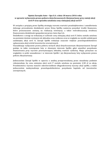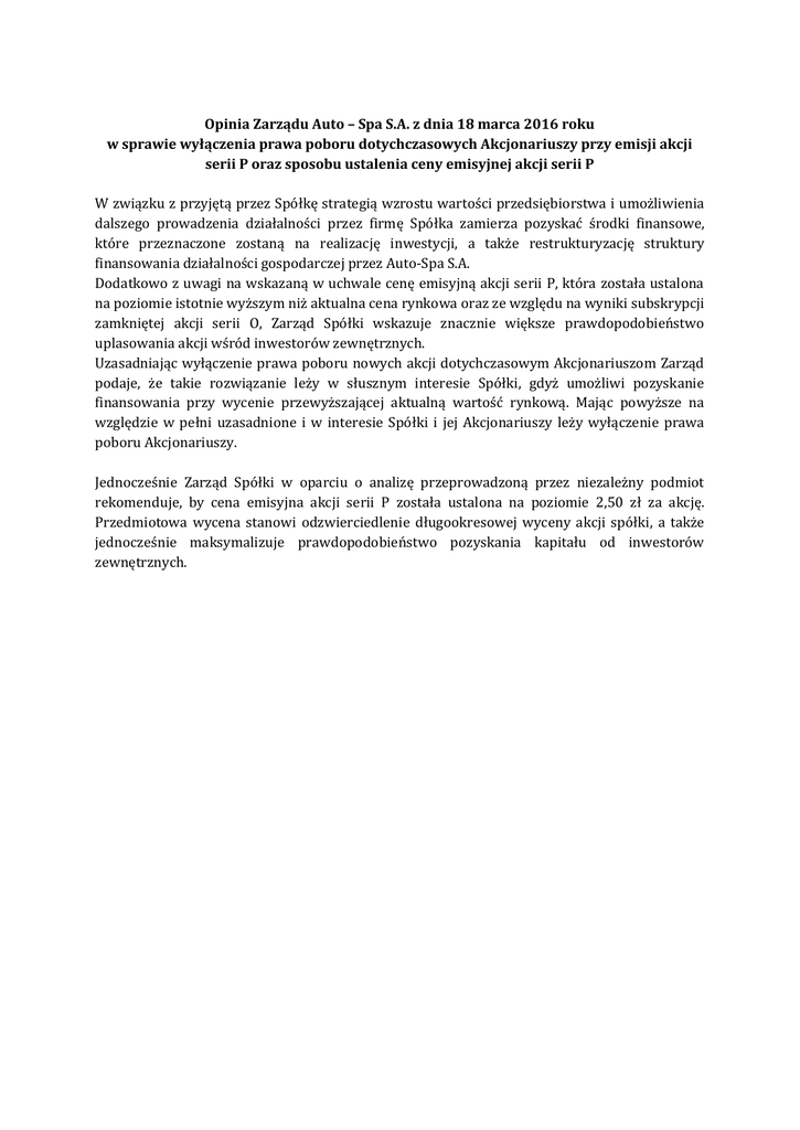 Opinia Zarządu Auto – Spa S.A. z dnia 18 marca 2016 roku w sprawie wyłączenia prawa poboru dotychczasowych Akcjonariuszy przy emisji akcji serii P oraz sposobu ustalenia ceny emisyjnej akcji serii P W związku z przyjętą przez Spółkę strategią wzrostu wartości przedsiębiorstwa i umożliwienia dalszego prowadzenia działalności przez firmę Spółka zamierza pozyskać środki finansowe, które przeznaczone zostaną na realizację inwestycji, a także restrukturyzację struktury finansowania działalności gospodarczej przez Auto-Spa S.A. Dodatkowo z uwagi na wskazaną w uchwale cenę emisyjną akcji serii P, która została ustalona na poziomie istotnie wyższym niż aktualna cena rynkowa oraz ze względu na wyniki subskrypcji zamkniętej akcji serii O, Zarząd Spółki wskazuje znacznie większe prawdopodobieństwo uplasowania akcji wśród inwestorów zewnętrznych. Uzasadniając wyłączenie prawa poboru nowych akcji dotychczasowym Akcjonariuszom Zarząd podaje, że takie rozwiązanie leży w słusznym interesie Spółki, gdyż umożliwi pozyskanie finansowania przy wycenie przewyższającej aktualną wartość rynkową. Mając powyższe na względzie w pełni uzasadnione i w interesie Spółki i jej Akcjonariuszy leży wyłączenie prawa poboru Akcjonariuszy. Jednocześnie Zarząd Spółki w oparciu o analizę przeprowadzoną przez niezależny podmiot rekomenduje, by cena emisyjna akcji serii P została ustalona na poziomie 2,50 zł za akcję. Przedmiotowa wycena stanowi odzwierciedlenie długookresowej wyceny akcji spółki, a także jednocześnie maksymalizuje prawdopodobieństwo pozyskania kapitału od inwestorów zewnętrznych.