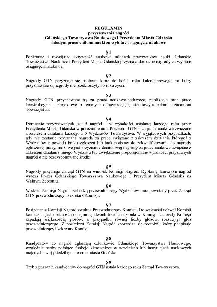 REGULAMIN przyznawania nagród Gdańskiego Towarzystwa Naukowego i Prezydenta Miasta Gdańska młodym pracownikom nauki za wybitne osiągnięcia naukowe §1 Popierając i rozwijając aktywność naukową młodych pracowników nauki, Gdańskie Towarzystwo Naukowe i Prezydent Miasta Gdańska przyznają doroczne nagrody za wybitne osiągnięcia naukowe. §2 Nagrody GTN przyznaje się osobom, które do końca roku kalendarzowego, za który przyznawane są nagrody nie przekroczyły 35 roku życia. §3 Nagrody GTN przyznawane są za prace naukowo-badawcze, publikacje oraz prace konstrukcyjne i projektowe o tematyce odpowiadającej statutowym celom i zadaniom Towarzystwa. §4 Dorocznie przyznawanych jest 5 nagród – w wysokości ustalanej każdego roku przez Prezydenta Miasta Gdańska w porozumieniu z Prezesem GTN – za prace naukowe związane z zakresem działania każdego z 5 Wydziałów Towarzystwa. W wyjątkowych przypadkach, gdy nie zostanie przyznana nagroda za prace związane z zakresem działania któregoś z Wydziałów z powodu braku zgłoszeń lub brak podstaw do zakwalifikowania do nagrody zgłoszonej pracy, możliwe jest przyznanie dodatkowej nagrody za prace naukowe związane z zakresem działania innego Wydziału lub zwiększenie proporcjonalne wysokości przyznanych nagród o nie rozdysponowane środki. §5 Nagrody przyznaje Zarząd GTN na wniosek Komisji Nagród. Dyplomy laureatom nagród wręcza Prezes Gdańskiego Towarzystwa Naukowego i Prezydent Miasta Gdańska na Walnym Zebraniu. §6 W skład Komisji Nagród wchodzą przewodniczący Wydziałów oraz powołany przez Zarząd GTN przewodniczący i sekretarz Komisji. §7 Posiedzenie Komisji Nagród zwołuje Przewodniczący Komisji. Do ważności uchwał Komisji konieczna jest obecność co najmniej dwóch trzecich członków Komisji. Uchwały Komisji zapadają większością głosów, w przypadku równej liczby głosów, rozstrzyga głos przewodniczącego. Z posiedzeń Komisji Nagród sporządza się protokół, który podpisuje przewodniczący i sekretarz Komisji. §8 Kandydatów do nagród zgłaszają członkowie Gdańskiego Towarzystwa Naukowego, względnie osoby pełniące funkcje kierownicze w uczelniach lub instytucjach naukowych mających swoją siedzibę na terenie miasta Gdańska. §9 Tryb zgłaszania kandydatów do nagród GTN ustala każdego roku Zarząd Towarzystwa.