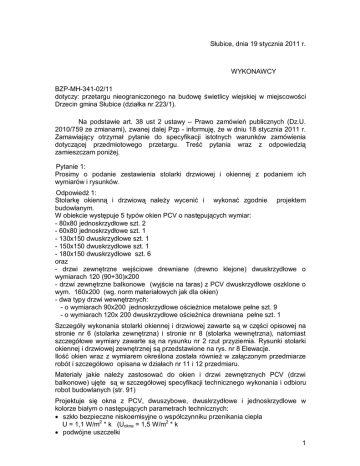 Słubice, dnia 19 stycznia 2011 r. WYKONAWCY BZP-MH-341-02/11 dotyczy: przetargu nieograniczonego na budowę świetlicy wiejskiej w miejscowości Drzecin gmina Słubice (działka nr 223/1). Na podstawie art. 38 ust 2 ustawy – Prawo zamówień publicznych (Dz.U. 2010/759 ze zmianami), zwanej dalej Pzp - informuję, że w dniu 18 stycznia 2011 r. Zamawiający otrzymał pytanie do specyfikacji istotnych warunków zamówienia dotyczącej przedmiotowego przetargu. Treść pytania wraz z odpowiedzią zamieszczam poniżej. Pytanie 1: Prosimy o podanie zestawienia stolarki drzwiowej i okiennej z podaniem ich wymiarów i rysunków. Odpowiedź 1: Stolarkę okienną i drzwiową należy wycenić i wykonać zgodnie projektem budowlanym. W obiekcie występuje 5 typów okien PCV o następujących wymiar: - 80x80 jednoskrzydłowe szt. 2 - 60x80 jednoskrzydłowe szt. 1 - 130x150 dwuskrzydłowe szt. 1 - 150x150 dwuskrzydłowe szt. 1 - 180x150 dwuskrzydłowe szt. 6 oraz - drzwi zewnętrzne wejściowe drewniane (drewno klejone) dwuskrzydłowe o wymiarach 120 (90+30)x200 - drzwi zewnętrzne balkonowe (wyjście na taras) z PCV dwuskrzydłowe oszklone o wym. 160x200 (wg. norm materiałowych jak dla okien) - dwa typy drzwi wewnętrznych: - o wymiarach 90x200 jednoskrzydłowe ościeżnice metalowe pełne szt. 9 - o wymiarach 120x 200 dwuskrzydłowe ościeżnica drewniana pełne szt. 1 Szczegóły wykonania stolarki okiennej i drzwiowej zawarte są w części opisowej na stronie nr 6 (stolarka zewnętrzna) i stronie nr 8 (stolarka wewnętrzna), natomiast szczegółowe wymiary zawarte są na rysunku nr 2 rzut przyziemia. Rysunki stolarki okiennej i drzwiowej zewnętrznej są przedstawione na rys. nr 8 Elewacje. Ilość okien wraz z wymiarem określona została również w załączonym przedmiarze robót i szczegółowo opisana w działach nr 11 i 12 przedmiaru. Materiały jakie należy zastosować do okien i drzwi zewnętrznych PCV (drzwi balkonowe) ujęte są w szczegółowej specyfikacji technicznego wykonania i odbioru robot budowlanych (str. 91) Projektuje się okna z PCV, dwuszybowe, dwuskrzydłowe i jednoskrzydlowe w kolorze białym o następujących parametrach technicznych: • szkło bezpieczne niskoemisyjne o współczynniku przenikania ciepła U = 1,1 W/m2 * k (Uokna = 1,5 W/m2 * k • podwójne uszczelki 1 • profile pięciokomorowe • okna rozwierno – uchylne, (wg. opisu) • zabudowane nawiewniki higrosterowane (1 szt./ 1 okno). 2