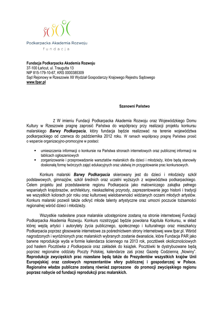 Fundacja Podkarpacka Akademia Rozwoju 37-100 Łańcut, ul. Traugutta 13 NIP 815-179-10-67, KRS 0000385309 Sąd Rejonowy w Rzeszowie XII Wydział Gospodarczy Krajowego Rejestru Sądowego www.fpar.pl Szanowni Państwo Z W imieniu Fundacji Podkarpacka Akademia Rozwoju oraz Wojewódzkiego Domu Kultury w Rzeszowie pragnę zaprosić Państwa do współpracy przy realizacji projektu konkursu malarskiego Barwy Podkarpacia, który fundacja będzie realizować na terenie województwa podkarpackiego od czerwca do października 2012 roku. W ramach współpracy pragnę Państwa prosić o wsparcie organizacyjno-promocyjne w postaci: umieszczenia informacji o konkursie na Państwa stronach internetowych oraz publicznej informacji na tablicach ogłoszeniowych zorganizowanie i przeprowadzenie warsztatów malarskich dla dzieci i młodzieży, które będą stanowiły doskonałą formę twórczych zajęć edukacyjnych oraz ułatwią im przygotowanie prac konkursowych. Konkurs malarski Barwy Podkarpacia skierowany jest do dzieci i młodzieży szkół podstawowych, gimnazjów, szkół średnich oraz uczelni wyższych z województwa podkarpackiego. Celem projektu jest przedstawienie regionu Podkarpacia jako malowniczego zakątka pełnego wspaniałych krajobrazów, architektury, nieskazitelnej przyrody, zaprezentowanie jego historii i tradycji we wszystkich kolorach pór roku oraz kulturowej wielobarwności widzianych oczami młodych artystów. Konkurs malarski pozwoli także odkryć młode talenty artystyczne oraz umocni poczucie tożsamości regionalnej wśród dzieci i młodzieży. Wszystkie nadesłane prace malarskie udostępnione zostaną na stronie internetowej Fundacji Podkarpacka Akademia Rozwoju. Konkurs rozstrzygać będzie powołana Kapituła Konkursu, w skład której wejdą artyści i autorytety życia publicznego, społecznego i kulturalnego oraz mieszkańcy Podkarpacia poprzez głosowanie internetowe za pośrednictwem strony internetowej www.fpar.pl. Wśród nagrodzonych i wyróżnionych prac malarskich wybranych zostanie dwanaście, które Fundacja PAR jako barwne reprodukcje wyda w formie kalendarza ściennego na 2013 rok, pocztówek okolicznościowych pod hasłem Pocztówka z Podkarpacia oraz zakładek do książek. Pocztówki te dystrybuowane będą poprzez regionalne oddziały Poczty Polskiej, kalendarze zaś przez Gazetę Codzienną „Nowiny”. Reprodukcje zwycięskich prac rozesłane będą także do Prezydentów wszystkich krajów Unii Europejskiej oraz czołowych reprezentantów sfery publicznej i gospodarczej w Polsce. Regionalne władze publiczne zostaną również zaproszone do promocji zwycięskiego regionu poprzez nabycie od fundacji reprodukcji prac malarskich. Uwieńczeniem tak cennego wydarzenia kulturalnego w regionie będzie zorganizowana przez Fundację Podkarpacka Akademia Rozwoju Druga Podkarpacka Gala Młodych Artystów, w czasie której nastąpi uroczyste wręczenie nagród autorom zwycięskich prac w obecności zaproszonych gości przedstawicieli regionalnej i lokalnej władzy, świata kultury, polityki, mediów oraz wszystkich autorów prac. Na zakończenie realizacji przedsięwzięcia planowana jest organizacja plenerowej wystawy pokonkursowej zwycięskich prac w Rynku Głównym miasta Rzeszowa. Patronat nad realizacją projektu obejmą: Poseł na Sejm Pan Zbigniew Rynasiewicz, Prezydent Miasta Rzeszowa, Marszałek Województwa Podkarpackiego, Wojewoda Podkarpacki, Minister Kultury i Dziedzictwa Narodowego. Partnerami konkursu malarskiego będą: urzędy miast i gmin, partnerzy gospodarczy znanych marek produktowych z regionu i z kraju, drukarnie, agencje reklamowe i inni. Wsparcie medialne konkursu malarskiego deklarują media lokalne i regionalne: prasa, informacyjne portale internetowe, radio, TVP Rzeszów, TVP Info. W ramach promocji konkursu malarskiego przygotowane zostaną plakaty i ulotki informacyjne, planowane jest również wykorzystanie billboardów reklamowych po zakończonym projekcie. Materiały i informacje dostępne będą w określonych punktach publicznych, a także na stronach internetowych Partnerów Honorowych. Jestem głęboko przekonana, że projekt konkursu Barwy Podkarpacia oraz organizacji Drugiej Podkarpackiej Gali Młodych Artystów spotka się z Państwa aprobatą i udziałem w jego realizacji. Naszym pragnieniem jest dotarcie z propozycją oraz zachęcenie do udziału w konkursie jak największej liczby młodych ludzi, a poprzez wydane reprodukcje prac konkursowych dotarcie również do jak najliczniejszej rzeszy mieszkańców Podkarpacia oraz turystów odwiedzających nasz region. Inicjatywa ta jest ważnym czynnikiem kształtującym nowoczesne oblicze regionalnej polityki kulturowej, promującej jednocześnie bogate i różnorodne walory województwa podkarpackiego, a z nim życia społecznego i gospodarczego. Przy realizacji projektu proszę zatem o wykorzystanie niepowtarzalnej szansy na promocję regionu w kraju, jak i za granicą. Strategicznym Partnerem Kulturalnym Projektu oraz współorganizatorem pierwszej Podkarpackiej Gali Młodych Artystów jest Wojewódzki Dom Kultury w Rzeszowie. Na prace czekamy maksymalnie do 17 sierpnia br. Liczę na pozytywny kontakt z Państwa i owocną współpracę z Państwem. Z poważaniem, dr Agnieszka Woś Prezes Zarządu Fundacja Podkarpacka Akademia Rozwoju 37-100 Łańcut, ul. Traugutta 13 NIP 815-179-10-67, KRS 0000385309 Tel. +48 603 332 115