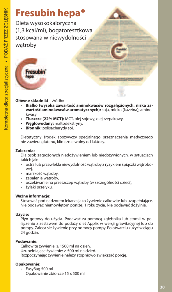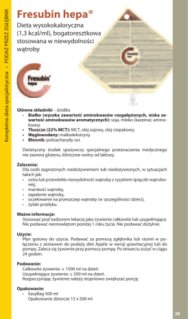 Kompletna dieta specjalistyczna • PODAŻ PRZEZ ZGŁĘBNIK Fresubin hepa® Dieta wysokokaloryczna (1,3 kcal/ml), bogatoresztkowa stosowana w niewydolności wątroby Główne składniki – źródło: • Białko (wysoka zawartość aminokwasów rozgałęzionych, niska zawartość aminokwasów aromatycznych): soja, mleko (kazeina); aminokwasy. • Tłuszcze (22% MCT): MCT, olej sojowy, olej rzepakowy. • Węglowodany: maltodekstryny. • Błonnik: polisacharydy soi. Dietetyczny środek spożywczy specjalnego przeznaczenia medycznego nie zawiera glutenu, klinicznie wolny od laktozy. Zalecenia: Dla osób zagrożonych niedożywieniem lub niedożywionych, w sytuacjach takich jak: • ostra lub przewlekła niewydolność wątroby z ryzykiem śpiączki wątrobowej, • marskość wątroby, • zapalenie wątroby, • oczekiwanie na przeszczep wątroby (w szczególności dzieci), • żylaki przełyku. Ważne informacje: Stosować pod nadzorem lekarza jako żywienie całkowite lub uzupełniające. Nie podawać niemowlętom poniżej 1 roku życia. Nie podawać dożylnie. Użycie: Płyn gotowy do użycia. Podawać za pomocą zgłębnika lub stomii w połączeniu z zestawem do podaży diet Applix w wersji grawitacyjnej lub do pompy. Zaleca się żywienie przy pomocy pompy. Po otwarciu zużyć w ciągu 24 godzin. Podawanie: Całkowite żywienie: ≥ 1500 ml na dzień. Uzupełniające żywienie: ≥ 500 ml na dzień. Rozpoczynając żywienie należy stopniowo zwiększać porcję. Opakowanie: • EasyBag 500 ml Opakowanie zbiorcze 15 x 500 ml 30 Średnia zawartość w 100 ml: 130 kcal 4g 1,93 g 17,9 g 0,73 g ≤0,01 g 4,7 g 2,0 g 1,4 g 1,3 g 1,7 g 1,0 g 78 ml 330 mOsm/l Substancje mineralne: Sód (Na) Potas (K) Chlorki (Cl) Wapń (Ca) Magnez (Mg) Fosfor (P) 75 mg 120 mg 71,5 mg 80 mg 27 mg 53 mg Pierwiastki śladowe: Żelazo (Fe) Cynk (Zn) Miedź (Cu) Mangan (Mn) Jodki (I) Fluorki (F) Chrom (Cr) Molibden (Mo) Selen (Se) 1,33 mg 1,2 mg 130 µg 0,27 mg 13,3 µg 0,13 mg 6,67 µg 10 µg 6,67 µg Witaminy i pozostałe* składniki odżywcze: Witamina A 70 µg β‑karoten 130 µg Witamina D3 1 µg Witamina E 1,33 mg Witamina K1 6,67 µg Witamina B1 0,13 mg Witamina B2 0,17 mg Niacyna 1,6 mg Witamina B6 0,16 mg Witamina B12 0,27 µg Kwas pantotenowy 0,47 mg Biotyna 5 µg Kwas foliowy 27 µg Witamina C 6,67 mg Cholina* 28 mg 31 PODAŻ PRZEZ ZGŁĘBNIK Energia Białko (12%) W tym rozgałęzione aminokwasy 44% Węglowodany (55%) w tym: cukier laktoza Tłuszcze (33%) w tym: SFA MUFA PUFA MCT Błonnik Woda Osmolarność