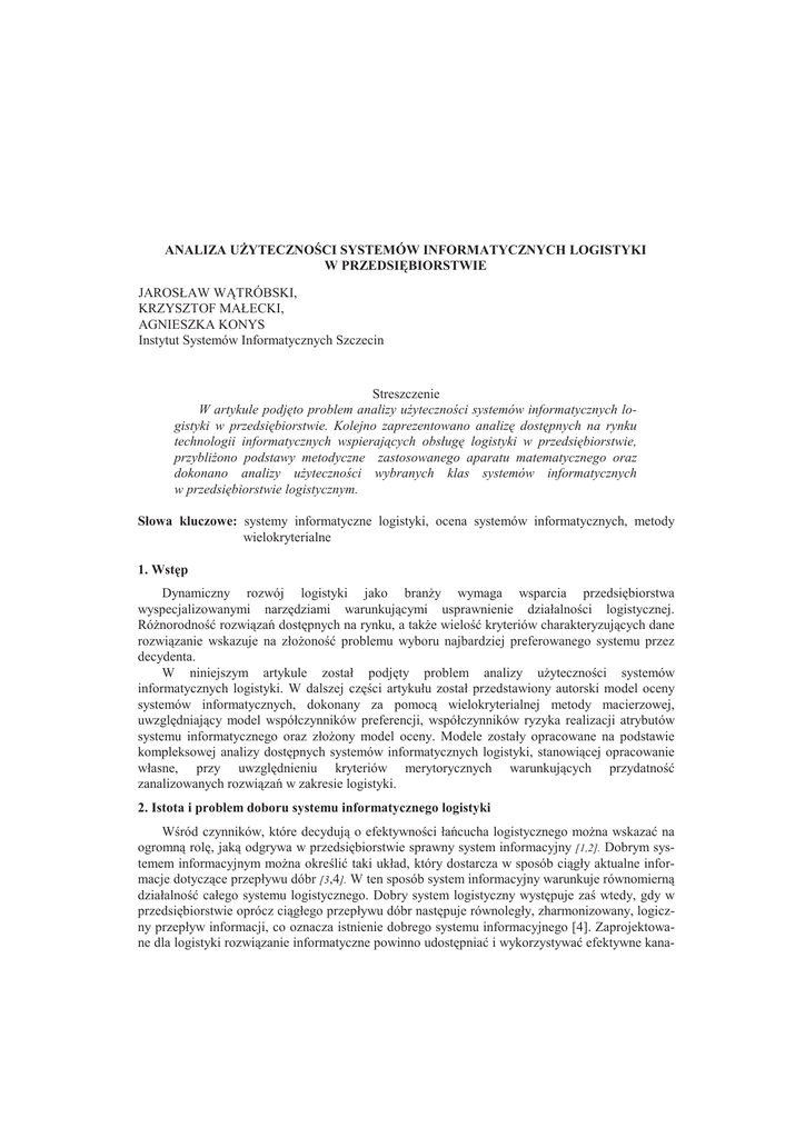 ANALIZA UYTECZNO CI SYSTEMÓW INFORMATYCZNYCH LOGISTYKI W PRZEDSIBIORSTWIE JAROSŁAW WTRÓBSKI, KRZYSZTOF MAŁECKI, AGNIESZKA KONYS Instytut Systemów Informatycznych Szczecin Streszczenie W artykule podjto problem analizy uytecznoci systemów informatycznych logistyki w przedsibiorstwie. Kolejno zaprezentowano analiz dostpnych na rynku technologii informatycznych wspierajcych obsług logistyki w przedsibiorstwie, przybliono podstawy metodyczne zastosowanego aparatu matematycznego oraz dokonano analizy uytecznoci wybranych klas systemów informatycznych w przedsibiorstwie logistycznym. Słowa kluczowe: systemy informatyczne logistyki, ocena systemów informatycznych, metody wielokryterialne 1. Wstp Dynamiczny rozwój logistyki jako brany wymaga wsparcia przedsibiorstwa wyspecjalizowanymi narzdziami warunkujcymi usprawnienie działalnoci logistycznej. Rónorodno rozwiza dostpnych na rynku, a take wielo kryteriów charakteryzujcych dane rozwizanie wskazuje na złoono problemu wyboru najbardziej preferowanego systemu przez decydenta. W niniejszym artykule został podjty problem analizy uytecznoci systemów informatycznych logistyki. W dalszej czci artykułu został przedstawiony autorski model oceny systemów informatycznych, dokonany za pomoc wielokryterialnej metody macierzowej, uwzgldniajcy model współczynników preferencji, współczynników ryzyka realizacji atrybutów systemu informatycznego oraz złoony model oceny. Modele zostały opracowane na podstawie kompleksowej analizy dostpnych systemów informatycznych logistyki, stanowicej opracowanie własne, przy uwzgldnieniu kryteriów merytorycznych warunkujcych przydatno zanalizowanych rozwiza w zakresie logistyki. 2. Istota i problem doboru systemu informatycznego logistyki Wród czynników, które decyduj o efektywnoci łacucha logistycznego mona wskaza na ogromn rol, jak odgrywa w przedsibiorstwie sprawny system informacyjny [1,2]. Dobrym systemem informacyjnym mona okreli taki układ, który dostarcza w sposób cigły aktualne informacje dotyczce przepływu dóbr [3,4]. W ten sposób system informacyjny warunkuje równomiern działalno całego systemu logistycznego. Dobry system logistyczny wystpuje za wtedy, gdy w przedsibiorstwie oprócz cigłego przepływu dóbr nastpuje równoległy, zharmonizowany, logiczny przepływ informacji, co oznacza istnienie dobrego systemu informacyjnego [4]. Zaprojektowane dla logistyki rozwizanie informatyczne powinno udostpnia i wykorzystywa efektywne kana- POLSKIE STOWARZYSZENIE ZARZDZANIA WIEDZ Seria: Studia i Materiały, nr 17, 2008 225 ły identyfikowania zarówno pozycji materiałowych wykorzystywanych w działalnoci wytwórczej, jak i jednostek handlowych i logistycznych wykorzystywanych w działalnoci dystrybucyjnej [4]. W celu usprawnienia działania oraz zapewnienia szybkiego przesyłania i pozyskiwania danych, system informacyjny logistyki powinien by systemem otwartym, umoliwiajcym połczenie zarówno z sieciami lokalnymi jak i rozległymi. Jednym z nadrzdnych zada SIL jest gromadzenie i przetwarzanie duych iloci danych, dotyczcych całej logistycznej działalnoci przedsibiorstwa oraz jego makrootoczenia, a take otoczenia konkurencyjnego [5]. Efektem tego działania jest dostarczenie zebranych i przetworzonych danych oraz odpowiednich informacji do zespołów podejmowania decyzji na kadym szczeblu organizacyjnym (Rys.1). Zastosowanie SIL w przedsibiorstwie pozwoli na popraw szybkoci działa, podniesienie jakoci produkcji, polepszenie jakoci obsługi klienta oraz zmniejszeniu kosztów zwizanych z działalnoci oraz progresji w przypadku konkurencyjnoci na rynku [6]. Rys. Funkcjonowanie systemu informacji logistycznej jednostki kooperujcej w łacuchu dostaw ródło: Opracowanie własne na podstawie, http://mfiles.ae.krakow.pl Encyklopedia Zarzdzania, Akademia Ekonomiczna w Krakowie; Por. Małkus T., „Kryteria oceny outsourcingu usług logistycznych”, Gospodarka Materiałowa i Logistyka, nr 1/2002 Zmienno otoczenia w jakim si znajduje dana organizacja oraz cigłe dostosowywanie do tego celów i strategii przedsibiorstwa powoduje, e coraz trudniej znale rozwizanie, które 226 Jarosław Wtróbski Krzysztof Małecki Agnieszka Konys Analiza uytecznoci systemów informatycznych logistyki w przedsibiorstwie w sposób najbardziej trafny bdzie potrafiło szybko reagowa na zachodzce zmiany rynku oraz w efektywny sposób przesyła due iloci informacji pomidzy poszczególnymi ogniwami w rozbudowanym łacuchu logistycznym. Dobór właciwego systemu informatycznego dla logistyki jest determinowany poprzez wiele czynników odnoszcych si do charakteru działalnoci danego przedsibiorstwa, jego wielkoci oraz struktury, złoonoci, a take skali prowadzonej przez nie działalnoci. Obecnie na rynku istnieje wiele rozwiza przystosowanych do spełnienia odpowiednich funkcji logistycznych, jednake mnogo tych rozwiza powoduje, i decydentowi trudno jest dokona właciwego wyboru, nie znajc wszystkich kryteriów charakteryzujcych dany system. Jednym z głównych problemów przedsibiorstw jest posiadanie nadmiaru zbdnych danych, czsto powtarzajcych si i wielokrotnie wprowadzanych. Przedsibiorstwo logistyczne powinno poszukiwa takich rozwiza, które byłyby niezawodne, wspierały działalno w kluczowych obszarach planowania produkcji, dostarczania surowców, zarzdzania zasobami, kontroli i minimalizacji kosztów, a take sprawnego przepływu informacji dostarczajcego wiarygodnych danych oraz wspomagajcego podejmowanie trafnych decyzji. Przy doborze właciwego systemu naley kierowa si zarówno biecymi potrzebami danego przedsibiorstwa, jak i uwzgldniajc dłuszy horyzont czasowy. Wany aspekt stanowi wic ywotno danego rozwizania oraz czsto dostpnoci nowych wersji danego systemu, przy uwzgldnieniu innowacji technologicznych. 3. Model oceny systemów informatycznych logistyki Budowa modelu oceny systemów informatycznych dedykowanych dla logistyki miała za zadanie wspomóc dobór właciwego systemu wspomagajcego działa