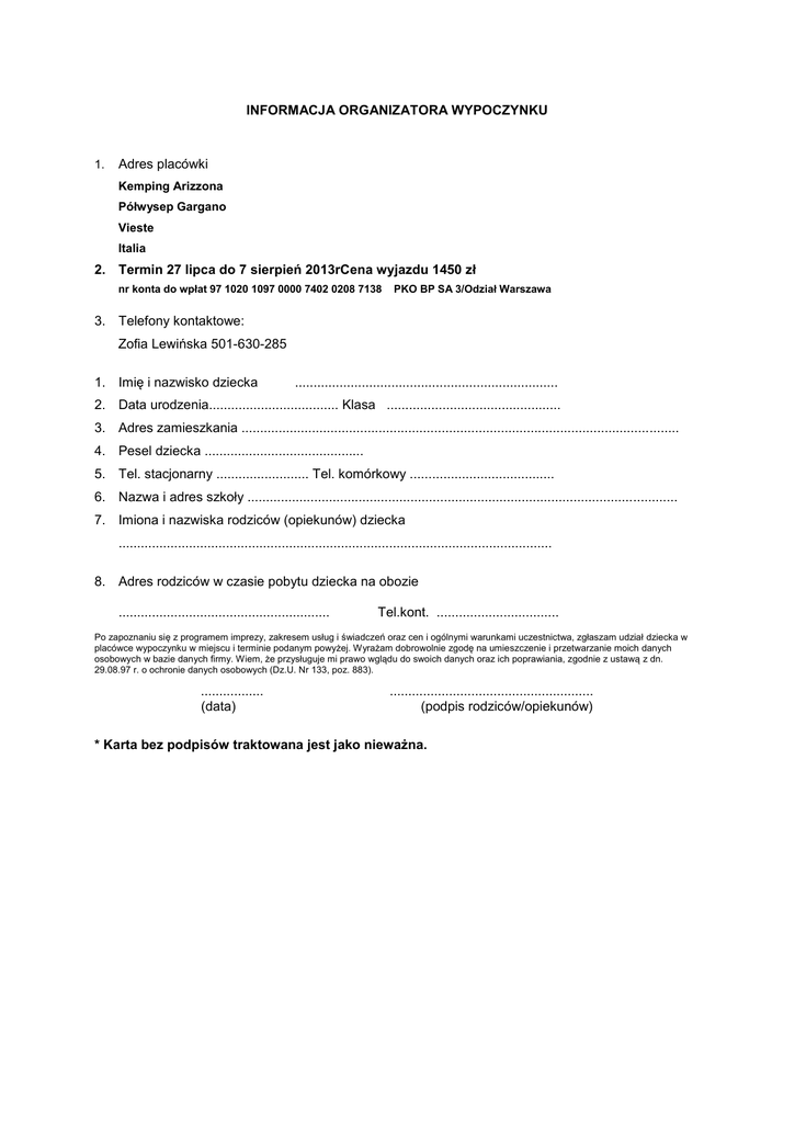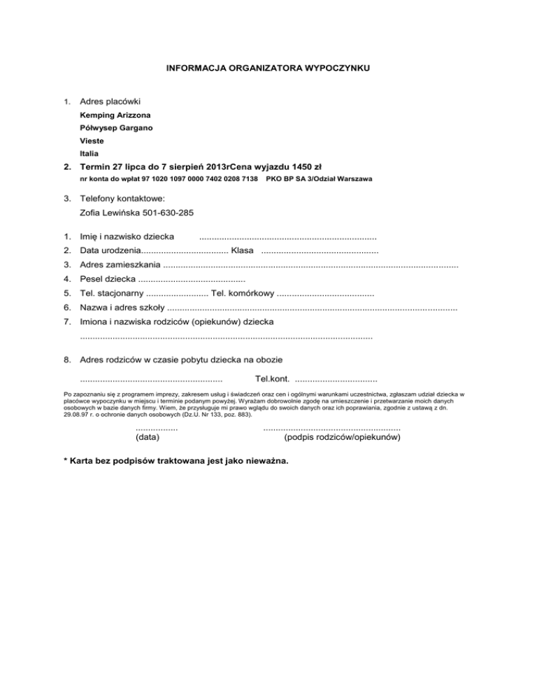 INFORMACJA ORGANIZATORA WYPOCZYNKU 1. Adres placówki Kemping Arizzona Półwysep Gargano Vieste Italia 2. Termin 27 lipca do 7 sierpień 2013rCena wyjazdu 1450 zł nr konta do wpłat 97 1020 1097 0000 7402 0208 7138 PKO BP SA 3/Odział Warszawa 3. Telefony kontaktowe: Zofia Lewińska 501-630-285 1. Imię i nazwisko dziecka ....................................................................... 2. Data urodzenia................................... Klasa ............................................... 3. Adres zamieszkania ...................................................................................................................... 4. Pesel dziecka ........................................... 5. Tel. stacjonarny ......................... Tel. komórkowy ....................................... 6. Nazwa i adres szkoły .................................................................................................................... 7. Imiona i nazwiska rodziców (opiekunów) dziecka ..................................................................................................................... 8. Adres rodziców w czasie pobytu dziecka na obozie ......................................................... Tel.kont. ................................. Po zapoznaniu się z programem imprezy, zakresem usług i świadczeń oraz cen i ogólnymi warunkami uczestnictwa, zgłaszam udział dziecka w placówce wypoczynku w miejscu i terminie podanym powyżej. Wyrażam dobrowolnie zgodę na umieszczenie i przetwarzanie moich danych osobowych w bazie danych firmy. Wiem, że przysługuje mi prawo wglądu do swoich danych oraz ich poprawiania, zgodnie z ustawą z dn. 29.08.97 r. o ochronie danych osobowych (Dz.U. Nr 133, poz. 883). ................. (data) ....................................................... (podpis rodziców/opiekunów) * Karta bez podpisów traktowana jest jako nieważna. INFORMACJA RODZICÓW (OPIEKUNÓW) O DZIECKU 1. Imię i nazwisko dziecka: .............................................................................................................. 2. Przebyte choroby (podać w którym roku życia): odra ..................., ospa .........................., różyczka ....................., świnka ..........................., szkarlatyna .............., żółtaczka zakaźna ............................, padaczka .............................choroby nerek (jakie) ........................................ ......................................, choroby reumatyczne ............................................., astma .............., inne choroby ................................................................................................................................. 3. U dziecka występowały w ostatnim roku lub występują obecnie (niepotrzebnie skreślić*): drgawki, omdlenia, utraty przytomności, zaburzenia równowagi, częste bóle głowy, częste bóle brzucha, trudności w zasypianiu, tiki, moczenia nocne, lęki nocne, wymioty, krwawienia z nosa, przewlekły kaszel (lub katar, anginy), bóle stawów, duszności, szybkie męczenie się, niedosłuch, jąkanie, inne: ............................................................................................................ 4. Dziecko jest: nieśmiałe, ma trudności w nawiązywaniu kontaktów, jest nadpobudliwe, inne informacje o usposobieniu i zachowaniu dziecka : ..................................................................................................................................... 5. Dziecko nie* jest uczulone (niepotrzebnie skreślić), jeśli tak – to na co: ..................................................................................................................................... 6. Dziecko nosi : okulary, aparat ortodontyczny, wkładki ortopedyczne (niepotrzebnie skreślić), inne aparaty ................................................................................................................................ 7. Jazdę samochodem znosi dobrze / źle (niepotrzebnie skreślić). 8. Inne uwagi o zdrowiu dziecka: .................................................................................................................................. .................................................................................................................................... 9. Informacja na temat posiłków (co lubi jeść, czego w ogóle nie jada,) ……………………………………………………………………………………………………. 10. Szczepienie przeciw tężcowi ………………………………………………………… OŚWIADCZAM, ŻE PODAŁEM WSZYSTKIE ZNANE MI INFORMACJE O DZIECKU, KTÓRE MOGĄ POMÓC W ZAPEWNIENIU MU WŁAŚCIWEJ OPIEKW CZASIE POBYTU NA KOLONII (OBOZIE). ............................ data ............................................ podpis rodzica (opiekuna) INFORMACJA O STANIE ZDROWIA DZIECKA .................................................................................................................................................... .................................................................................................................................................... .................................................................................................................................................... .................................................................................................................................................... ........................................... INFORMACJA PIELĘGNIARKI SZKOLNEJ 1. Szczepienia przeciw tężcowi: ....................................................................................... UWAGA Zabieramy: 1. Dowód osobisty lub paszport 2. Legitymację szkolną z aktualną pieczątką szkoły uprawniającą do zniżki PKP 3. Lekarstwa z informacją o ich przyjmowaniu, (jeżeli dziecko przyjmuje) 4. Czapka lub chustka na głowę konie