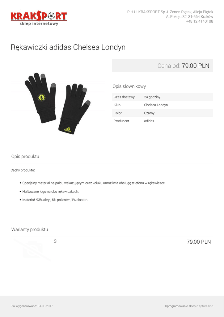P.H.U. KRAKSPORT Sp.J. Zenon Piętak, Alicja Piętak Al.Pokoju 32, 31-564 Kraków +48 12 4140108 Rękawiczki adidas Chelsea Londyn Cena od: 79,00 PLN Opis słownikowy Czas dostawy 24 godziny Klub Chelsea Londyn Kolor Czarny Producent adidas Opis produktu Cechy produktu: Specjalny materiał na palcu wskazującym oraz kciuku umożliwia obsługę telefonu w rękawiczce. Haftowane logo na obu rękawiczkach. Materiał: 93% akryl, 6% poliester, 1% elastan. Warianty produktu S Plik wygenerowano: 04-03-2017 Powered by TCPDF (www.tcpdf.org) 79,00 PLN Oprogramowanie sklepu: AptusShop