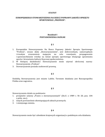 STATUT EUROPEJSKIEGO STOWARZYSZENIA NA RZECZ POPRAWY JAKOŚCI SPRZĘTU SPORTOWEGO „PROFEON”. Rozdział I POSTANOWIENIA OGÓLNE §1 1. 2. 3. Europejskie Stowarzyszenie Na Rzecz Poprawy Jakości Sprzętu Sportowego "Profeon", zwane dalej „Stowarzyszeniem”, jest dobrowolnym, samorządnym i trwałym zrzeszeniem mającym na celu rozwijanie, propagowanie i upowszechnianie wiedzy na temat sprzętu sportowego służącego uprawianiu sportu i krzewieniu kultury fizycznej społeczeństwa. W bieżącej działalności Stowarzyszenie może używać skróconej nazwy: Stowarzyszenie „Profeon”. Stowarzyszenie posiada osobowość prawną. §2 Siedzibą Stowarzyszenia jest miasto Lublin. Terenem działania jest Rzeczpospolita Polska oraz zagranica. §3 Stowarzyszenie działa na podstawie: 1. przepisów ustawy „Prawo o stowarzyszeniach” (Dz.U. z 1989 r. Nr 20, poz. 104 z późn. zm.); 2. innych powszechnie obowiązujących aktach prawnych; 3. i niniejszego statutu. §4 Stowarzyszenie może być członkiem krajowych organizacji o podobnym celu działania. §5 1. 2. 3. 4. Stowarzyszenie swoim działaniem obejmuje obszar Rzeczypospolitej Polskiej. Dla realizacji celów statutowych Stowarzyszenie może działać na terenie innych państw z poszanowaniem tamtejszego prawa. Tworzenie jednostek organizacyjnych wymaga zmiany Statutu. Dla zapewnienia środków finansowych na realizację celów statutowych Stowarzyszenie może prowadzić działalność gospodarczą zgodnie z obowiązującymi przepisami w tym zakresie. §6 Czas trwania Stowarzyszenia nie jest ograniczony. §7 Celem Stowarzyszenia jest kontrola i ocena sprzętu sportowego, przeprowadzanie testów i zamieszczanie profesjonalnych, niezależnych opinii dotyczących norm jakości sprzętu sportowego, a także propagowanie aktywności fizycznej. Stowarzyszenie realizuje cele w szczególności przez: 1. Propagowanie standardów dotyczących jakości sprzętu sportowego. 2. Prowadzenie badań opinii społecznej na temat jakości i dostępności oferowanego na rynku sprzętu sportowego. 3. Współpracę i wzajemną pomoc członków Stowarzyszenia, a także współpracę z innymi organizacjami o podobnych celach działania 4. Organizację i uczestniczenie w imprezach sportowych, rekreacyjnych i turystycznych krajowych i zagranicznych. 5. Tworzenie, utrzymywanie i rozwijanie dostępności do informacji na temat sprzętu sportowego. 6. Prowadzenie badań nad oferowanym na rynku sprzętem sportowym. 7. Popularyzację wyników prowadzonych badań, m.in. poprzez organizowanie konferencji i szkoleń. 8. Współpracę z osobami i instytucjami w zakresie zbierania informacji i wymiany doświadczeń. 9. Współpracę z władzami szkół i jednostkami uczelni w zakresie rozwoju kultury fizycznej, turystyki i sportu. 10. Doradztwo i pomoc organizacyjno-ekonomiczną, oraz szkolenie członków i innych podmiotów zainteresowanych działalnością Stowarzyszenia. 11. Inne działania sprzyjające rozwojowi statutowych celów organizacji. 12. Prowadzenie działalności integrującej członków Stowarzyszenia, przy udziale wszelkich zainteresowanych osób, poprzez aktywność kulturalną, rekreacyjną i towarzyską. 13. Organizowanie różnego rodzaju imprez, w tym sportowych propagujących kulturę fizyczną. 14. Działalność zawiązaną z poprawą kondycji fizycznej. §8 Zgodnie z Polską Klasyfikacją Działalności (PKD) przedmiotem działalności Stowarzyszenia jest: - 58.11.Z Wydawanie książek, - 58.11.Z Pozostała działalność wydawnicza, - 59.11.Z Działalność związana z produkcją filmów, nagrań wideo i programów telewizyjnych, - 63.12.Z Działalność portali internetowych, - 73.20.Z Badanie rynku i opinii publicznej, - 85.51.Z Pozaszkolne formy edukacji sportowej oraz zajęć sportowych i rekreacyjnych, - 85.60.Z Działalność wspomagająca edukację, - 93.19.Z Pozostała działalność związana ze sportem, - 94.11.Z Działalność organizacji komercyjnych i pracodawców, - 94.12.Z Działalność organizacji profesjonalnych, - 94.99.Z Działalność pozostałych organizacji członkowskich, gdzie indziej nieklasyfikowana §9 Stowarzyszenie może używać pieczęci, posiadać odznakę organizacyjną oraz wydawać publikatory oraz publikacje i komunikaty. § 10 1. 2. Realizując powyższe cele Stowarzyszenie opiera się na społecznej pracy członków. Może jednak zatrudniać pracowników do prowadzenia swych spraw. Stowarzyszenie może prowadzić odpłatną działalność pożytku publicznego, a także działalność przybierającą formę działalności gospodarczej. Dochód z tej działalności służy wyłącznie realizacji celów statutowych i nie może być przeznaczony do podziału między jej członków. § 11 1. Członkiem zwyczajnym Stowarzyszenia może być pełnoletni obywatel Rzeczpospolitej Polskiej oraz cudzoziemiec, także nie mający miejsca zamieszkania na terytorium Rzeczpospolitej Polskiej, który: 1) wyrazi chęć uczestniczenia w działalności Stowarzyszenia, 2) przedstawi opinię i (rekomendację) co najmniej 2 członków Stowarzyszenia i złoży deklarację członkowską, 2. 3. 3) uiści wpisowe. Osoby poniżej 16 roku życia mogą być członkami Stowarzyszenia za zgodą ich przedstawicieli ustawowych, lecz nie posiadają oni czynnego prawa wyborczego do momentu, aż nie osiągną 16 lat. Osoby prawne mogą być wyłącznie członkami wspierającymi. § 12 Członkostwo Stowarzyszenia nabywa się przez przyjęcie kandydatury przez Zarząd Stowarzyszenia zwykłą większością głosów w drodze uchwały. § 13 1. 2. Członkowie Stowarzyszenia zobowiązani są: 1) swoją postawą i działaniami przyczyniać się do wzrostu roli i znaczenia Stowarzyszenia, 2) dbać o jego dobre imię, 3) popierać i czynnie realizować cele Stowarzyszenia, 4) przestrzegać powszechnie obowiązujących przepisów prawa, oraz postanowień statutu, 5) regularnie opłacać składki. Członek zwyczajny Stowarzyszenia ma prawo brać udzia
