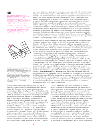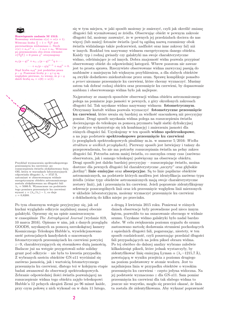 Rozwiązanie zadania M 1513. Rozważmy wielomian v(x) = w(x + 1). p−q jest Wówczas liczba p q −1 = q pierwiastkiem wielomianu v. Niech v(x) = an xn + . . . + a1 x + a0 . Wówczas po przemnożeniu obu stron równości v p−q = 0 przez q n otrzymujemy q n n−1 q + ··· · · · + a1 (p − q)q n−1 + a0 q an (p − q) + an−1 (p − q) n = 0. Stąd liczba a0 q n jest podzielna przez p − q. Ponieważ liczby p − q i q są względnie pierwsze, to wiemy, że p − q dzieli liczbę a0 = v(0) = w(1). Przykład wyznaczenia spektroskopowego przesunięcia ku czerwieni: po rozszczepieniu światła zlokalizowano linię OII, która w warunkach laboratoryjnych odpowiada długości λe = 3727 Å, natomiast w obserwowanym widmie energetycznym obiektu astronomicznego została zlokalizowana na długości fali λo = 5000 Å. Wyznaczone na podstawie tego pomiaru przesunięcie ku czerwieni wynosi z = (λo /λe ) − 1, co daje z = 0,8268. się w tym miejscu, w jaki sposób możemy je zmierzyć, czyli jak określić zmianę długości fali wyemitowanej ze źródła. Obserwując obiekt w pewnym zakresie długości fal, możemy zauważyć, że w pewnych jej przedziałach dociera do nas więcej (lub mniej) fotonów światła (pod tą ogólną nazwą rozumiemy obok światła widzialnego także podczerwień, nadfiolet oraz inne zakresy fal) niż w innych. Rozkład ten nazywamy widmem energetycznym danego obiektu. Każdy typ i rodzaj gwiazdy czy galaktyki ma swoje charakterystyczne widmo, odróżniające je od innych. Dobra znajomość widm pozwala przypisać obserwowany obiekt do odpowiedniej kategorii. Wbrew pozorom nie zawsze jest to prosta sprawa. Rzeczywiste obserwowane widma zazwyczaj pasują do szablonów z mniejszym lub większym przybliżeniem, a dla słabych obiektów są zwykle dodatkowo zniekształcone przez szum. Sprawę komplikuje ponadto a priori nieznane przesunięcie ku czerwieni, które chcemy wyznaczyć. Musimy zatem tak dobrać rodzaj obiektu oraz przesunięcie ku czerwieni, by dopasowanie szablonu i obserwowanego widma było jak najlepsze. Najprostszy ze znanych sposobów obserwacji widma obiektu astronomicznego polega na pomiarze jego jasności w pewnych, z góry określonych zakresach długości fal. Tak uzyskane widmo nazywamy widmem fotometrycznym. Otrzymany kształt widma pozwala wyznaczyć fotometryczne przesunięcie ku czerwieni, które uważa się bardziej za wielkość szacunkową niż precyzyjny pomiar. Drugi sposób uzyskania widma polega na rozszczepieniu światła docierającego do teleskopu za pomocą pryzmatu bądź siatki dyfrakcyjnej (w praktyce wykorzystuje się ich kombinację) i zmierzeniu jasności dla różnych długości fal. Uzyskujemy w ten sposób widmo spektroskopowe, a na jego podstawie spektroskopowe przesunięcie ku czerwieni (o przeglądach spektroskopowych pisaliśmy m.in. w numerze 5/2016: Wielka struktura w wielkich przeglądach). Pierwszy sposób jest łatwiejszy i tańszy do przeprowadzenia, bo nie ma potrzeby rozszczepiania światła na pełny zakres długości fal. Potrzeba zatem mniej światła, co oszczędza cenny czas (zarówno obserwatora, jak i samego teleskopu) poświęcony na obserwacje obiektu. Drugi sposób jest daleko bardziej precyzyjny – rozszczepiając światło, można dostrzec dla pewnych długości fal charakterystyczne „szczyty” oraz głębokie „kotliny”: linie emisyjne oraz absorpcyjne. Są to linie papilarne obiektów astronomicznych, na podstawie których możliwa jest identyfikacja zarówno typu źródła (różne typy obiektów astronomicznych mają swoje charakterystyczne zestawy linii), jak i przesunięcia ku czerwieni. Jeżeli poprawnie zidentyfikujemy sekwencje poszczególnych linii oraz ich przesunięcie względem linii mierzonych w układzie laboratoryjnym, możemy wyznaczyć przesunięcie ku czerwieni z dokładnością do kilku miejsc po przecinku. Po tym obszernym wstępie przyjrzyjmy się, jak od kuchni wyglądało odkrycie najdalszej znanej obecnie galaktyki. Oprzemy się na opisie zamieszczonym w czasopiśmie The Astrophysical Journal (wydanie 819, 10 marca 2016). Opisano w nim, jak z danych przeglądu GOODS, uzyskanych za pomocą szerokokątnej kamery Kosmicznego Teleskopu Hubble’a, wyselekcjonowano sześć potencjalnych kandydatek o szacowanych fotometrycznych przesunięciach ku czerwieni powyżej z=9, charakteryzujących się stosunkowo dużą jasnością. Badacze już na wstępie przygotowali sobie solidny grunt pod odkrycie – nie była to kwestia przypadku. Z wybranych sześciu obiektów GN-z11 wyróżniał się zarówno jasnością, jak i wartością fotometrycznego przesunięcia ku czerwieni, dlatego też w kolejnym etapie badań awansował do obserwacji spektroskopowych. Zebranie odpowiedniej ilości światła pozwalającej na rozszczepienie widma tego obiektu zajęło teleskopowi Hubble’a 12 pełnych okrążeń Ziemi po 96 minut każde, przy czym połowę z nich wykonał on w dniu 11 lutego, 2 a drugą 3 kwietnia 2015 roku. Ponieważ w różnych dniach obserwacje były prowadzone pod nieco innym kątem, pozwoliło to na oszacowanie obecnego w widmie szumu. Uzyskane widmo galaktyki było nadal bardzo słabe. W celu zwiększenia poziomu sygnału do szumu zastosowano metodę dodawania strumieni pochodzących z sąsiednich długości fali, pogarszając, niestety, w ten sposób rozdzielczość, czyli poszerzając przedział długości fali przypadających na jeden piksel obrazu widma. Po tej obróbce do dalszej analizy wybrano zaledwie kilkadziesiąt pikseli, które jednak wystarczyły, by zidentyfikować linię emisyjną Lyman α (λe =1215,7 Å), powstającą w wyniku przejścia z poziomu drugiego na poziom podstawowy w atomie wodoru. Jest to najsilniejsza linia w przypadku obiektów o wysokim przesunięciu ku czerwieni – często jedyna widoczna. Na jej podstawie wyznaczono z dla GN-z11. Sam pomiar przesunięcia ku czerwieni dla tak słabego widma to jeszcze nie wszystko, mogło się prz