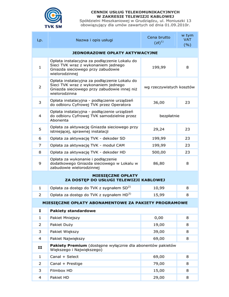 CENNIK USŁUG TELEKOMUNIKACYJNYCH W ZAKRESIE TELEWIZJI KABLOWEJ Spółdzielni Mieszkaniowej w Grudziądzu, ul. Moniuszki 13 obowiązujący dla umów zawartych od dnia 01.09.2010r. Lp. Cena brutto Nazwa i opis usługi (zł)1) w tym VAT (%) JEDNORAZOWE OPŁATY AKTYWACYJNE 1 Opłata instalacyjna za podłączenie Lokalu do Sieci TVK wraz z wykonaniem jednego Gniazda sieciowego przy zabudowie wielorodzinnej 2 Opłata instalacyjna za podłączenie Lokalu do Sieci TVK wraz z wykonaniem jednego Gniazda sieciowego przy zabudowie innej niż wielorodzinna 3 Opłata instalacyjna - podłączenie urządzeń do odbioru Cyfrowej TVK przez Operatora 4 Opłata instalacyjna - podłączenie urządzeń do odbioru Cyfrowej TVK samodzielnie przez Abonenta 5 Opłata za aktywację Gniazda sieciowego przy istniejącej, sprawnej instalacji 6 199,99 8 wg rzeczywistych kosztów 36,00 23 bezpłatnie 29,24 23 Opłata za aktywację TVK - dekoder SD 199,99 23 7 Opłata za aktywację TVK - moduł CAM 199,99 23 8 Opłata za aktywację TVK - dekoder HD 500,00 23 9 Opłata za wykonanie i podłączenie dodatkowego Gniazda sieciowego w Lokalu w zabudowie wielorodzinnej 86,80 8 MIESIĘCZNE OPŁATY ZA DOSTĘP DO USŁUGI TELEWIZJI KABLOWEJ 1 Opłata za dostęp do TVK z sygnałem SD2) 10,99 8 2 3) 15,99 8 Opłata za dostęp do TVK z sygnałem HD MIESIĘCZNE OPŁATY ABONAMENTOWE ZA PAKIETY PROGRAMOWE I Pakiety standardowe 1 Pakiet Mniejszy 2 0,00 8 Pakiet Duży 19,00 8 3 Pakiet Większy 39,00 8 4 Pakiet Największy 69,00 8 II Pakiety Premium (dostępne wyłącznie dla abonentów pakietów Większego i Największego) 1 Canal + Select 69,00 8 2 Canal + Prestige 79,00 8 3 Filmbox HD 15,00 8 4 Pakiet HD 29,00 8 III Pakiety specjalne 1 Pakiet Największy HD 2 Pakiet Max II 98,00 8 169,00 8 INNE OPŁATY 1 Zmiana pakietu standardowego 29,24 23 2 Zawieszenia świadczenia usługi telewizji na wniosek Abonenta nie dłuższe niż 3 m-ce 29,24 23 3 Ponowna aktywacja usługi telewizji po okresie zawieszenia (nie dłuższym niż 3 m-ce) do sprawnej instalacji bez opłat pozostałe przypadki według rzeczywistych kosztów 4 Nieterminowe wykonanie zobowiązań pieniężnych 5 Usuwanie usterek lub Awarii Sieci TVK lub Sprzętu Operatora powstałych bez winy Abonenta bez opłat 6 Usuwanie usterek lub Awarii Sieci TVK lub Sprzętu Operatora powstałych z winy Abonenta według rzeczywistych kosztów 7 Inne prace instalacyjne na zlecenie Abonenta według rzeczywistych kosztów odsetki umowne 1) Opłata może ulec zmianie w przypadku promocji. Wykaz aktualnych promocji dostępny jest w Biurze Obsługi Abonenta TVK SM oraz na stronie www.tvsm.pl . 2) Opłata za dostęp do TVK z sygnałem SD pobierana jest przez Operatora wyłącznie w przypadku zamówienia przez Abonenta Pakietów Mniejszego, Dużego, Większego lub Największego. 3) Opłata za dostęp do TVK z sygnałem HD pobierana jest przez Operatora wyłącznie w przypadku zamówienia przez Abonenta Pakietu Canal + Select, Canal + Prestige, Filmbox HD, Pakietu HD, Pakietu Największego HD lub Pakietu Max II. W takim przypadku Operator nie pobiera opłaty za dostęp do TVK z sygnałem SD. Od 11.05.2015r. pakiety: Canal+ Silver, Canal+ Gold, Canal+ Platinum oraz Max niedostępne w bieżącej sprzedaży. Cennik został zatwierdzony uchwałą Zarządu Spółdzielni Mieszkaniowej w Grudziądzu, ul. Moniuszki 13 w dniu 8 maja 2013 r. z terminem obowiązywania od 20 czerwca 2013 r. Zmieniony uchwałą Zarządu z dnia 06.05.2015 z terminem obowiązywania od 11.05.2015. Dla umów zawartych przed dniem 1.09.2010r. pozostaje obowiązujący cennik z dnia 1.09.2009r.