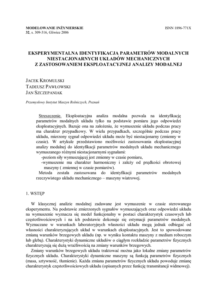 MODELOWANIE INŻYNIERSKIE 32, s. 309-316, Gliwice 2006 ISNN 1896-771X EKSPERYMENTALNA IDENTYFIKACJA PARAMETRÓW MODALNYCH NIESTACJONARNYCH UKŁADÓW MECHANICZNYCH Z ZASTOSOWANIEM EKSPLOATACYJNEJ ANALIZY MODALNEJ JACEK KROMULSKI TADEUSZ PAWŁOWSKI JAN SZCZEPANIAK Przemysłowy Instytut Maszyn Rolniczych, Poznań Streszczenie. Eksploatacyjna analiza modalna pozwala na identyfikację parametrów modalnych układu tylko na podstawie pomiaru jego odpowiedzi eksploatacyjnych. Bazuje ona na założeniu, że wymuszenie układu podczas pracy ma charakter przypadkowy. W wielu przypadkach, szczególnie podczas pracy układu, mierzony sygnał odpowiedzi układu może być niestacjonarny (zmienny w czasie). W artykule przedstawiono możliwości zastosowania eksploatacyjnej analizy modalnej do identyfikacji parametrów modalnych układu mechanicznego wymuszanego różnymi niestacjonarnymi sygnałami: -poziom siły wymuszającej jest zmienny w czasie pomiaru, -wymuszenie ma charakter harmoniczny i zależy od prędkości obrotowej maszyny ( zmiennej w czasie pomiarów). Metoda została zastosowana do identyfikacji parametrów modalnych rzeczywistego układu mechanicznego – maszyny wiatrowej. 1. WSTĘP W klasycznej analizie modalnej zadawane jest wymuszenie w czasie sterowanego eksperymentu. Na podstawie zmierzonych sygnałów wymuszających oraz odpowiedzi układu na wymuszenie wyznacza się model funkcjonalny w postaci charakterystyk czasowych lub częstotliwościowych i na ich podstawie dokonuje się estymacji parametrów modalnych. Wyznaczane w warunkach laboratoryjnych własności układu mogą jednak odbiegać od własności charakteryzujących układ w warunkach eksploatacyjnych. Jest to spowodowane zmianą warunków brzegowych układu (np. w wyniku kontaktu maszyny z medium roboczym lub glebą). Charakterystyki dynamiczne układów o ciągłym rozkładzie parametrów fizycznych charakteryzują się dużą wrażliwością na zmiany warunków brzegowych. Zmiany warunków brzegowych układu traktować można jako lokalne zmiany parametrów fizycznych układu. Charakterystyki dynamiczne maszyny są funkcją parametrów fizycznych (masa, sztywność, tłumienie). Każda zmiana parametrów fizycznych układu powoduje zmianę charakterystyk częstotliwościowych układu (opisanych przez funkcję transmitancji widmowej). 310 J. KROMULSKI, T. PAWŁOWSKI, J. SZCZEPANIAK Wymienione wyżej niedoskonałości klasycznej analizy modalnej mogą być zminimalizowane poprzez zastosowanie eksploatacyjnej analizy modalnej realizowanej na podstawie pomiarów przeprowadzonych podczas eksploatacji. Eksploatacyjna analiza modalna w porównaniu z metodą klasyczną ma wiele zalet. Do najważniejszych z nich należą [6,7]: - zidentyfikowany model lepiej modeluje rzeczywistą konstrukcję, gdyż uwzględnia eksploatacyjne warunki brzegowe i wymuszenia eksploatacyjne, - daje dobre przybliżenie dla układów nieliniowych, - umożliwia analizę konstrukcji, dla których test laboratoryjny jest niemożliwy lub trudny do zrealizowania (np. dla konstrukcji o dużej masie), - daje mniejsze koszty przeprowadzenia eksperymentu identyfikacyjnego. 2. ALGORYTMY IDENTYFIKACJI PARAMETRÓW MODALNYCH METODAMI EKSPLOATACYJNEJ ANALIZY MODALNEJ Metody identyfikacji parametrów modalnych oparte na pomiarach odpowiedzi eksploatacyjnych można podzielić na metody realizowane w dziedzinie czasu lub częstotliwości. Bazują one na założeniu, że wymuszenie układu podczas pracy ma charakter przypadkowy. Do najczęściej stosowanych algorytmów realizowanych w dziedzinie czasu należą [5,7,9]: - metody BR (ang. Balanced Realization), CVA (ang. Canonical Variate Analysis), SSI (ang. Stochastic Subspace Identication) realizowane w podprzestrzeni stochastycznej, - metody realizowane na bazie korelacji własnej i wzajemnej sygnałów, np. oparte na aproksymacji przebiegu korelacji sumą zanikających wykładniczo funkcji harmonicznych LSCE (ang. Least Square Complex Exponentional) lub metodzie Ibrahim Time Domain (ITD), W dziedzinie częstotliwości najczęściej stosuje się [5,9]: - metodę PP (Peak-Picking) opartą na analizie maksimów w widmach wzajemnych lub własnych odpowiedzi układu na wymuszenie, - metodę CMIF (Complex Mode Indication Function) opartą na analizie wartości szczególnych macierzy wzajemnych widm mocy odpowiedzi, - metody realizowane na bazie transmitancji eksploatacyjnej (np. metoda PolyMax Polyreference Least-Squares Complex Frequency-Domain lub metoda Maximum Likelihood ), W wielu przypadkach, szczególnie podczas pracy układu, mierzony sygnał odpowiedzi układu może być niestacjonarny (zmienny w czasie). W ostatnim okresie opracowane zostały algorytmy identyfikacji parametrów modalnych metodami eksploatacyjnej analizy modalnej dla przypadków, gdy wymuszenie jest złożeniem wymuszenia przypadkowego i składowych harmonicznych [5]. Są to zmodyfikowane metody realizowane w dziedzinie czasu wymagające znajomości częstotliwości harmonicznych a priori: - zmodyfikowana metoda Least Squares Complex Exponential (LSCE) – metoda oparta na aproksymacji przebiegu korelacji sumą zanikających wykładniczo funkcji harmonicznych, - zmodyfikowana metoda Ibrahim Time Domain (ITD) oparta na analizie korelacji, - zmodyfikowana metoda ERA. EKSPERYMENTALNA IDENTYFIKACJA PARAMETRÓW MODALNYCH NIESTACJONARNYCH...311 3. ZASTOSOWANIE EKSPLOATACYJNEJ ANALIZY MODALNEJ DO WYZNACZENIA CZĘSTOTLIWOŚCI MODALNYCH MASZYNY WIATROWEJ Obiektem badań jest stacjonarna maszyna wiatrowa napędzana silnikiem spalinowym z wolnoobrotowym wentylatorem umieszczonym na wieży. Maszyna wiatrowa stosowana jest do ochrony upraw ogrodniczych przed przymrozkami. W trakcie pracy maszyny: - poziom siły wymuszającej jest zmienny w czasie (zależny od prędkości wiatru i położenia śmigła względem kierunku wiatru), - wymuszenie ma charakter harmoniczny i zależy od prędkości obrotowej maszyny (zmiennej w czasie pracy). Podczas rozmieszczeni