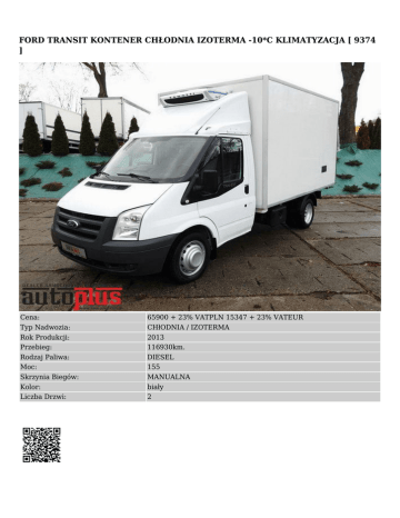 FORD TRANSIT KONTENER CHŁODNIA IZOTERMA -10*C KLIMATYZACJA [ 9374 ] Cena: Typ Nadwozia: Rok Produkcji: Przebieg: Rodzaj Paliwa: Moc: Skrzynia Biegów: Kolor: Liczba Drzwi: 65900 + 23% VATPLN 15347 + 23% VATEUR CHłODNIA / IZOTERMA 2013 116930km. DIESEL 155 MANUALNA biały 2 INFORMACJE DODATKOWE ● ● ● ● bezwypadkowy sprowadzony zarejestrowany w polsce stan bardzo dobry WYPOSAŻENIE ● ● ● ● ● ● ● ● ● ABS centralny zamek elektryczne lusterka immobiliser klimatyzacja komputer radio / cd wspomaganie kierownicy elektryczne szyby OPIS NUMER OFERTY- 9374 Ford Transit kontener chłodnia. Rok produkcji 2013. Auto jest bezwypadkowe, sprawne w 100% w idealnym stanie technicznym i wizualnym. Bardzo dobrze się prowadzi. Nie wymaga wkładu finansowego. Wnętrze jest czyste i zadbane. Fotele bez przetarć. Auto posiada agregat Zanotti, który chłodzi do -10*C. Dodatkowo posiada zasilanie z sieci elektrycznej. Powłoka lakiernicza we wzorowym stanie. Perfekcyjna praca silnika, skrzyni biegów i zawieszenia. Dynamiczny silnik 2.2 TDCI ma moc 155 KM. Auto posiada klimatyzację oraz nowe opony na bliźniaczych kołach. Wyposażenie: - ABS, ESP - AIRBAG kierowcy - klimatyzacja - wspomaganie kierownicy - centralny zamek - immobiliser - elektryczne szyby i lusterka - kierownica wielofunkcyjna - podgrzewana przednia szyba - podłokietnik - 6 biegów - 3 miejsca - radio CD - agregat Zanotti chłodzi do -10*C - termograf - zasilanie z sieci 230V - wymiary kontenera : długość /330 cm / szerokość /202 cm/ wysokość /190 cm/ - Podana cena jest CENĄ NETTO!!. Wystawiamy Fakturę VAT - MOŻLIWOŚĆ KREDYTOWANIA LUB LEASINGOWANIA, 100% WARTOŚCI AUTA, PROCEDURA UPROSZCZONA, WYMAGANE DOKUMENTY NIP, REGON, WPIS DO EWIDENCJI, DOWÓD OSOBISTY - WIĘCEJ INFORMACJI NA STRONIE WWW.AUTO-PLUS.COM.PL - NINIEJSZE OGŁOSZENIE JEST WYŁĄCZNIE INFORMACJĄ HANDLOWĄ I NIE STANOWI OFERTY W MYŚL art. 66, § 1. KODEKSU CYWILNEGO. SPRZEDAJĄCY NIE ODPOWIADA ZA EWENTUALNE BŁĘDY LUB NIEAKTUALNOŚĆ OGŁOSZENIA.
