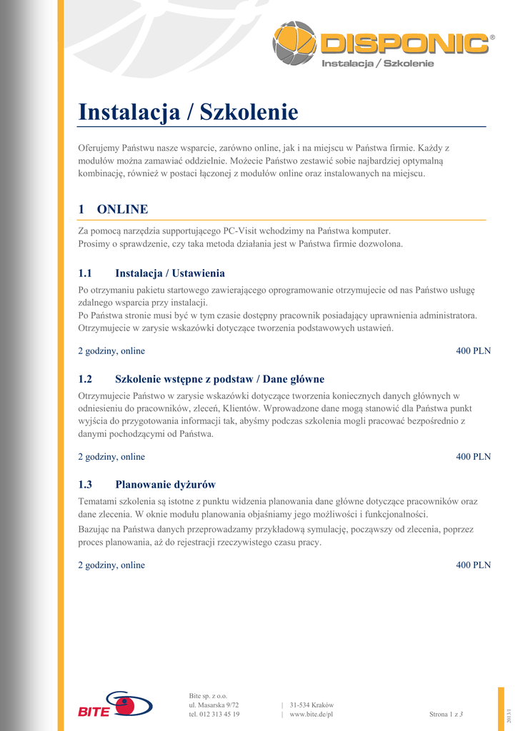 Instalacja / Szkolenie Oferujemy Państwu nasze wsparcie, zarówno online, jak i na miejscu w Państwa firmie. Każdy z modułów można zamawiać oddzielnie. Możecie Państwo zestawić sobie najbardziej optymalną kombinację, również w postaci łączonej z modułów online oraz instalowanych na miejscu. 1 ONLINE Za pomocą narzędzia supportującego PC-Visit wchodzimy na Państwa komputer. Prosimy o sprawdzenie, czy taka metoda działania jest w Państwa firmie dozwolona. 1.1 Instalacja / Ustawienia Po otrzymaniu pakietu startowego zawierającego oprogramowanie otrzymujecie od nas Państwo usługę zdalnego wsparcia przy instalacji. Po Państwa stronie musi być w tym czasie dostępny pracownik posiadający uprawnienia administratora. Otrzymujecie w zarysie wskazówki dotyczące tworzenia podstawowych ustawień. 2 godziny, online 1.2 400 PLN Szkolenie wstępne z podstaw / Dane główne Otrzymujecie Państwo w zarysie wskazówki dotyczące tworzenia koniecznych danych głównych w odniesieniu do pracowników, zleceń, Klientów. Wprowadzone dane mogą stanowić dla Państwa punkt wyjścia do przygotowania informacji tak, abyśmy podczas szkolenia mogli pracować bezpośrednio z danymi pochodzącymi od Państwa. 2 godziny, online 1.3 400 PLN Planowanie dyżurów Tematami szkolenia są istotne z punktu widzenia planowania dane główne dotyczące pracowników oraz dane zlecenia. W oknie modułu planowania objaśniamy jego możliwości i funkcjonalności. Bazując na Państwa danych przeprowadzamy przykładową symulację, począwszy od zlecenia, poprzez proces planowania, aż do rejestracji rzeczywistego czasu pracy. 400 PLN Bite sp. z o.o. ul. Masarska 9/72 tel. 012 313 45 19 | 31-534 Kraków | www.bite.de/pl Strona 1 z 3 2013/1 2 godziny, online 1.4 Portal Tematami szkolenia są ustawienie i korzystanie z modułów internetowych programu . Zaprezentowane zostają zarówno możliwości w zakresie ustawień użytkowników w internecie, jak również parametryzacja , w każdym przypadku w odniesieniu do zakupionych modułów. Bazując na Państwa danych przeprowadzamy przykładową symulację, począwszy od procesu planowania w programie , porzez przesłanie danych do sieci, aż do zwrotnego przesłania do danych wprowadzonych przez użytkownika. 2 godziny, online 1.5 400 PLN Inne kwestie Indywidualne szkolenia online służące odświeżeniu wybranych przez Państwa zagadnień. Warunkiem jest uprzednie odbycie szkolenia podstawowego. 1 godzina, online 250 PLN 2 NA MIEJSCU W PAŃSTWA FIRMIE 2.1 Instalacja / Szkolenie wstępne Pomoc przy instalacji oprogramowania . Po Państwa stronie musi być w tym czasie dostępny pracownik posiadający uprawnienia administratora. Otrzymujecie w zarysie wskazówki dotyczące tworzenia podstawowych ustawień. 1 dzień, na miejscu u Państwa 1500 PLN plus koszty podróży 2.2 Planowanie dyżurów Tematami szkolenia są istotne z punktu widzenia planowania dane główne dotyczące pracowników oraz dane zlecenia. W oknie modułu planowania objaśniamy jego możliwości i funkcjonalności. Bazując na Państwa danych przeprowadzamy przykładową symulację, począwszy od zlecenia, poprzez proces planowania, aż do rejestracji rzeczywistego czasu pracy. 1/2 dnia, na miejscu u Państwa 750 PLN Bite sp. z o.o. ul. Masarska 9/72 tel. 012 313 45 19 | 31-534 Kraków | www.bite.de/pl Strona 2 z 3 2013/1 plus koszty podróży 2.3 Portal Tematami szkolenia są ustawienie i korzystanie z modułów internetowych programu . Zaprezentowane zostają zarówno możliwości w zakresie ustawień użytkowników w internecie, jak również parametryzacja , w każdym przypadku w odniesieniu do zakupionych modułów. Bazując na Państwa danych przeprowadzamy przykładową symulację, począwszy od procesu planowania w programie , porzez przesłanie danych do sieci, aż do zwrotnego przesłania do danych wprowadzonych przez użytkownika. 1/2 dnia, na miejscu u Państwa 750 PLN plus koszty podróży Po każdym szkoleniu można skorzystać z oferty pomocy zdalnej (hotline) obejmującej tematy będące przedmiotem szkolenia. Bite sp. z o.o. ul. Masarska 9/72 tel. 012 313 45 19 | 31-534 Kraków | www.bite.de/pl Strona 3 z 3 2013/1 Wszystkie ceny rozumie się łącznie z podatkiem VAT. Obowiązują Ogólne warunki handlowe Bite sp. z o.o.