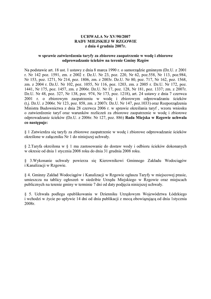 UCHWAŁA Nr XV/90/2007 RADY MIEJSKIEJ W RZGOWIE z dnia 4 grudnia 2007r. w sprawie zatwierdzenia taryfy za zbiorowe zaopatrzenie w wodę i zbiorowe odprowadzanie ścieków na terenie Gminy Rzgów Na podstawie art. 18 ust. 1 ustawy z dnia 8 marca 1990 r. o samorządzie gminnym (Dz.U. z 2001 r. Nr 142 poz. 1591, zm. z 2002 r. Dz.U. Nr 23, poz. 220, Nr 62, poz.558, Nr 113, poz.984, Nr 153, poz. 1271, Nr 214, poz. 1806, zm. z 2003r. Dz.U. Nr 80, poz. 717, Nr 162, poz. 1568, zm. z 2004 r. Dz.U. Nr 102, poz. 1055, Nr 116, poz. 1203, zm. z 2005 r. Dz.U. Nr 172, poz. 1441, Nr 175, poz. 1457, zm. z 2006r. Dz.U. Nr 17, poz. 128, Nr 181, poz. 1337; zm. z 2007r. Dz.U. Nr 48, poz. 327, Nr 138, poz. 974, Nr 173, poz. 1218), art. 24 ustawy z dnia 7 czerwca 2001 r. o zbiorowym zaopatrzeniu w wodę i zbiorowym odprowadzaniu ścieków (t.j. Dz.U. z 2006r. Nr 123, poz. 858, zm. z 2007r. Dz.U. Nr 147, poz.1033) oraz Rozporządzenia Ministra Budownictwa z dnia 28 czerwca 2006 r. w sprawie określania taryf , wzoru wniosku o zatwierdzenie taryf oraz warunków rozliczeń za zbiorowe zaopatrzenie w wodę i zbiorowe odprowadzanie ścieków (Dz.U. z 2006r. Nr 127, poz. 886) Rada Miejska w Rzgowie uchwala co następuje: § 1 Zatwierdza się taryfy za zbiorowe zaopatrzenie w wodę i zbiorowe odprowadzanie ścieków określone w załączniku Nr 1 do niniejszej uchwały. § 2.Taryfa określona w § 1 ma zastosowanie do dostaw wody i odbioru ścieków dokonanych w okresie od dnia 1 stycznia 2008 roku do dnia 31 grudnia 2008 roku. § 3.Wykonanie uchwały powierza się Kierownikowi Gminnego Zakładu Wodociągów i Kanalizacji w Rzgowie. § 4. Gminny Zakład Wodociągów i Kanalizacji w Rzgowie ogłasza Taryfy w miejscowej prasie, umieszcza na tablicy ogłoszeń w siedzibie Urzędu Miejskiego w Rzgowie oraz miejscach publicznych na terenie gminy w terminie 7 dni od daty podjęcia niniejszej uchwały. § 5. Uchwała podlega opublikowaniu w Dzienniku Urzędowym Województwa Łódzkiego i wchodzi w życie po upływie 14 dni od dnia publikacji z mocą obowiązującą od dnia 1stycznia 2008r. Załącznik Nr 1 do Uchwały Nr XV/90/2007 z dnia 4 grudnia 2007r. Wysokość cen i opłat za dostarczaną wodę z uwzględnieniem dopłat z budżetu Gminy Rzgów obowiązujących na 2008 rok. I.Grupa taryfowa Koszt za 1 m3 wody Dopłata z budżetu Gminy do 1 m³ wody Cena 1 m3 wody 1,91 zł/m³ (netto) 0,20 zł/m³ (netto) 1,71 zł/m³ (netto) -Gospodarstwa domowe i odbiorcy poza przemysłowymi -Jednostki: oświaty, kultury i sportu, ochrony zdrowia i opieki społecznej, administracji -Gospodarstwa rolne i ogrodnicze -Sprzedaż hurtowa wody II.Grupa taryfowa Koszt za 1 m3 wody Dopłata z budżetu Gminy do 1 m³ wody Cena 1m3 wody 1,95 zł/m³ (netto) 0,00 zł/m3 (netto) 1,95 zł/m³ (netto) -Odbiorcy przemysłowi / działalność gospodarcza / Wysokość cen i opłat za odprowadzone ścieki : I.Grupa taryfowa -Gospodarstwa domowe -Odbiorcy poza przemysłowymi -Jednostki : oświaty, kultury i sportu, ochrony zdrowia i opieki społecznej, administracji -Gospodarstwa rolne i ogrodnicze Koszt jednostkowy za 1 m3 ścieków Dopłata z budżetu Gminy do 1 m³ ścieków Cena 1 m³ ścieków 3,98 zł/m³ (netto) 1,00 zł/m³ (netto) 2,98 zł/m³ (netto) II.Grupa taryfowa Przemysłowi odbiorcy usług / działalność gospodarcza / ścieki opadowe /deszczowe/ i roztopowe z dróg Cena za 1 m³ ścieków 3,98 zł/m³ (netto)