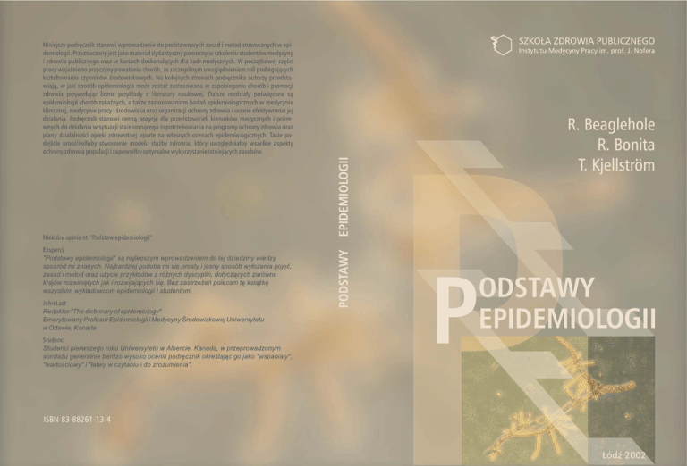 .. P Podstawy epidemiologii Podr´cznik dla s∏uchaczy studiów przed- i podyplomowych oraz s∏uchaczy Szko∏y Zdrowia Publicznego Basic epidemiology R. Beaglehole R. Bonita Department of Community Health and Department of Medicine University of Auckland Auckland New Zealand T. Kjellström Division of Environmental Health World Health Irganization Geneva Switzerland World Health Organization Geneva 1993 Szko∏a Zdrowia Publicznego Studium Podyplomowe R. Beaglehole, R. Bonita, T. Kjellström Podstawy epidemiologii T∏umaczenie pod redakcjà prof. dr hab. med. Neonili Szeszeni-Dàbrowskiej ¸ódê 2002 Wydanie t∏umaczenia w j´zyku polskim sfinansowano ze Êrodków Komitetu Badaƒ Naukowych z dotacji na dzia∏alnoÊç statutowà (IMP 8.6) Wydane przez Âwiatowà Organizacj´ Zdrowia w 1993 r. pt. „Basic epidemiology” © World Health Organization 1993 Dyrektor Generalny Âwiatowej Organizacji Zdrowia przyzna∏ prawo do t∏umaczenia na j´zyk polski wymienionego tytu∏u Instytutowi Medycyny Pracy im. prof. J. Nofera, który ponosi ca∏kowità odpowiedzialnoÊç za dokonany przek∏ad T∏umaczyli: dr hab. med. Wojciech Hanke dr med. Zygmunt Starzyƒski dr hab. med. Irena Szadkowska-Staƒczyk prof. dr hab. med. Neonila Szeszenia-Dàbrowska dr Urszula Wilczyƒska © Instytut Medycyny Pracy im. prof. J. Nofera, ¸ódê 2002 Redaktor prowadzàcy Teresa Starzyƒska Projekt ok∏adki Ida KuÊmierczyk ISBN 83–88261–13–4 Opracowanie typograficzne i sk∏ad Wydawnictwo Biblioteka tel./faks (042) 715 05 63, 0602 524 666 e-mail: [email protected] Wydawca Oficyna Wydawnicza Instytutu Medycyny Pracy im. prof. J. Nofera 90–950 ¸ódê, ul. Âw. Teresy 8 Rozpowszechnianie ksià˝ek: tel. i faks: (042) 631 47 19 e-mail: [email protected], ksi´garnia internetowa: http://www.imp.lodz.pl Spis treÊci Przedmowa do polskiego wydania . . . . . . . . . . . . . . . . . . . . . . . . . . . . . . . . . . . . . . . . . . . . . . . . Przedmowa. . . . . . . . . . . . . . . . . . . . . . . . . . . . . . . . . . . . . . . . . . . . . . . . . . . . . . . . . . . . . . . . . . . . . . . . Wprowadzenie . . . . . . . . . . . . . . . . . . . . . . . . . . . . . . . . . . . . . . . . . . . . . . . . . . . . . . . . . . . . . . . . . . . . 7 9 11 Rozdzia∏ 1. Co to jest epidemiologia? . . . . . . . . . . . . . . . . . . . . . . . . . . . . . . . . . . . . . . . . . . . . Epidemiologia w uj´ciu historycznym . . . . . . . . . . . . . . . . . . . . . . . . . . . . . . . . . . . . . . . . . . . . Definicja i zakres epidemiologii . . . . . . . . . . . . . . . . . . . . . . . . . . . . . . . . . . . . . . . . . . . . . . . . . . Dokonania epidemiologii . . . . . . . . . . . . . . . . . . . . . . . . . . . . . . . . . . . . . . . . . . . . . . . . . . . . . . . . Pytania kontrolne . . . . . . . . . . . . . . . . . . . . . . . . . . . . . . . . . . . . . . . . . . . . . . . . . . . . . . . . . . . . . . . . 13 13 15 17 23 Rozdzia∏ 2. Pomiar stanu zdrowia zbiorowoÊci . . . . . . . . . . . . . . . . . . . . . . . . . . . . . . . . . . Definicje zdrowia i choroby . . . . . . . . . . . . . . . . . . . . . . . . . . . . . . . . . . . . . . . . . . . . . . . . . . . . . . Miary cz´stoÊci chorób. . . . . . . . . . . . . . . . . . . . . . . . . . . . . . . . . . . . . . . . . . . . . . . . . . . . . . . . . . . . Korzystanie z dost´pnych êróde∏ informacji . . . . . . . . . . . . . . . . . . . . . . . . . . . . . . . . . . . . . . Analiza porównawcza wyst´powania chorób. . . . . . . . . . . . . . . . . . . . . . . . . . . . . . . . . . . . . . Pytania kontrolne . . . . . . . . . . . . . . . . . . . . . . . . . . . . . . . . . . . . . . . . . . . . . . . . . . . . . . . . . . . . . . . . 25 27 35 43 46 Rozdzia∏ 3. Typy badaƒ epidemiologicznych . . . . . . . . . . . . . . . . . . . . . . . . . . . . . . . . . . . . Obserwacje i eksperymenty . . . . . . . . . . . . . . . . . . . . . . . . . . . . . . . . . . . . . . . . . . . . . . . . . . . . . . Epidemiologia obserwacyjna . . . . . . . . . . . . . . . . . . . . . . . . . . . . . . . . . . . . . . . . . . . . . . . . . . . . . . Epidemiologia eksperymentalna . . . . . . . . . . . . . . . . . . . . . . . . . . . . . . . . . . . . . . . . . . . . . . . . . . Potencjalne b∏´dy w badaniach epidemiologicznych . . . . . . . . . . . . . . . . . . . . . . . . . . . . Zagadnienia etyczne . . . . . . . . . . . . . . . . . . . . . . . . . . . . . . . . . . . . . . . . . . . . . . . . . . . . . . . . . . . . . . Pytania kontrolne . . . . . . . . . . . . . . . . . . . . . . . . . . . . . . . . . . . . . . . . . . . . . . . . . . . . . . . . . . . . . . . . 25 47 47 48 58 63 70 71 Rozdzia∏ 4. Podstawowe wiadomoÊci ze statystyki . . . . . . . . . . . . . . . . . . . . . . . . . . . . . . Rozk∏ady i miary . . . . . . . . . . . . . . . . . . . . . . . . . . . . . . . . . . . . . . . . . . . . . . . . . . . . . . . . . . . . . . . . . . Szacowanie . . . . . . . . . . . . . . . . . . . . . . . . . . . . . . . . . . . . . . . . . . . . . . . . . . . . . . . . . . . . . . . . . . . . . . . . Wnioskowanie statystyczne . . . . . . . . . . . . . . . . . . . . . . . . . . . . . . . . . . . . . . . . . . . . . . . . . . . . . . Zale˝noÊci mi´dzy dwiema zmiennymi . . . . . . . . . . . . . . . . . . . . . . . . . . . . . . . . . . . . . . . . . . Pytania kontrolne . . . . . . . . . . . . . . . . . . . . . . . . . . . . . . . . . . . . . . . . . . . . . . . . . . . . . . . . . . . . . . . . 73 78 80 87 91 Rozdzia∏ 5. PrzyczynowoÊç w epidemiologii . . . . . . . . . . . . . . . . . . . . . . . . . . . . . . . . . . . . Poj´cie przyczyny . . . . . . . . . . . . . . . . . . . . . . . . . . . . . . . . . . . . . . . . . . . . . . . . . . . . . . . . . . . . . . . . Ustalanie przyczyny choroby . . . . . . . . . . . . . . . . . . . . . . . . . . . . . . . . . . . . . . . . . . . . . . . . . . . . Pytania kontrolne . . . . . . . . . . . . . . . . . . . . . . . . . . . . . . 
