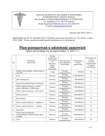 SZPITAL KLINICZNY IM. KAROLA JONSCHERA UNIWERSYTETU MEDYCZNEGO IM. KAROLA MARCINKOWSKIEGO W POZNANIU ul. Szpitalna 27/33 60-572 Poznań Dział Zamówień Publicznych: tel. (61) 8491375 E-mail: [email protected] Poznań, dnia 09.01.2017 r. Szpital Kliniczny im. K. Jonschera UM w Poznaniu (stosownie do treści art. 13a ustawy z dnia 29.01.2004 r. Prawo zamówień publicznych) przedstawia n/w informację: Plan postępowań o udzielenie zamówień (jakie przewiduje się przeprowadzić w 2017 r.) Przedmiot zamówienia Lp. Rodzaj zamówienia wg podziału na: Dostawy / Usługi / Roboty budowlane 1. Badanie sprawozdania finansowego za rok 2017 2. Leki Dostawy 3. Nici chirurgiczne Dostawy 4. Sprzęt dla kardiochirurgii, kardiologii Dostawy 5. Jałowy sprzęt medyczny : cewniki centr., dializatory, MultiComp Dostawy 6. Jałowy sprzęt medyczny: rurki, worki Dostawy 7. Dializa domowa Dostawy 8. Dezynfekcja Dostawy 9. Jałowy sprzęt medyczny – amplacery Dostawy 10. Jałowy sprzęt medyczny – venflony Dostawy 11. Opatrunki Dostawy 12. Jałowy sprzęt medyczny kardiochirurgia, neurochirurgia, porty, czujniki Dostawy 13. Leki Dostawy Usługi Przewidywany tryb udzielenia zamówienia Przetarg nieograniczony Przetarg nieograniczony Przetarg nieograniczony Przetarg nieograniczony Przetarg nieograniczony Przetarg nieograniczony Przetarg nieograniczony Przetarg nieograniczony Przetarg nieograniczony Przetarg nieograniczony Przetarg nieograniczony Orientacyjna wartość zamówienia 7 100,00 zł Przewidywany termin wszczęcia postępowania (w ujęciu kwartalnym) III 35 000 000,00 zł I 600 000,00 zł I 1 200 000,00 zł I 1 900 000,00 zł I 600 000,00 zł I 2 000 000,00 zł I 600 000,00 zł II 700 000,00 zł II 800 000,00 zł II 700 000,00 zł III Przetarg nieograniczony 5 000 000,00 zł IV Przetarg nieograniczony 800 000,00 zł IV str. 1 14. TRANSPORT TOWARÓW I OSÓB Usługi Przetarg nieograniczony 208 292,50 zł I 15. OCHRONA Usługi Przetarg nieograniczony 394 638,00 zł I Dostawy Przetarg nieograniczony 160 000,00 zł I Dostawy Przetarg nieograniczony 170 000,00 zł I Przetarg nieograniczony Przetarg nieograniczony Przetarg nieograniczony 380 000,00 zł II 250 000,00 zł II 100 000,00 zł III Dostawy Przetarg nieograniczony 240 000,00 zł IV Usługi Przetarg nieograniczony 430 000,00 zł IV Dostawy Przetarg nieograniczony 290 000,00 zł I Dostawy Przetarg nieograniczony 480 000,00 zł III Dostawy Przetarg nieograniczony 90 000,00 zł I Przetarg nieograniczony Przetarg nieograniczony Przetarg nieograniczony Przetarg nieograniczony Przetarg nieograniczony Przetarg nieograniczony Przetarg nieograniczony Przetarg nieograniczony 600 000,00 zł I 200 000,00 zł II 90 000,00 zł III 15 000,00 zł III 50 000,00 zł IV 45 000,00 zł III 110 000,00 zł I 95 000,00 zł II Przetarg nieograniczony 540 000,00 zł II 16. 17. 18. 19. 20. 21. 22. 23. 24. 25. 26. Szczepy wzorcowe, testy, sprzęt laboratoryjny dla pracowni mikrobiologii, sprzęt laboratoryjny dla pracowni patomorfologii Laboratoryjne produkty diagnostyczne do aparatu ImmunoCAP 100 Phadia oraz cytometru BD FACS Canto II Jednorazowy sprzęt laboratoryjny dla CL Laboratoryjne produkty diagnostyczne dla Pracowni Mikrobiologii Glukometry i paski do glukometrów Podłoża mikrobiologiczne oraz sprzęt laboratoryjny dla Banku Komórek Krwiotwórczych Usługa polegająca na ubezpieczeniu odpowiedzialności cywilnej Szpitala Klinicznego im. K. Jonschera UM w Poznaniu Dostawa produktów żywnościowych (mleko płynne; mleko w proszku dla niemowląt; wędliny; mrożonki; mięso i tłuszcze; jaja) Dostawa produktów żywnościowych (cukier i produkty zbożowe, różne produkty spożywcze, ryby, kwaszonki, owoce cytrusowe, drób, sery, masło i inne produkty mleczarskie, pieczywo, woda źródlana) Dostawa produktów żywnościowych (Produkty bezglutenowe, produkty bezcukrowe, niskobiałkowe, warzywa i owoce) Biochemia – dzierżawa aparatury i odczynników Dostawy Dostawy Dostawy Dostawy 27. Zamknięty system pobierania krwi Dostawy 28. Odczynniki dla Pracowni Izotopowej Dostawy 29. Wirówka laboratoryjna - zakup Dostawy 30. 31. Analizator elektrolitów - dzierżawa lub zakup Aparat do barwienia met. Gramma z wirówką Dostawy Dostawy 32. Gospodarstwo domowe, płyny myjące, Dostawy 33. Środki czystości Dostawy 34. Odzież jednorazowa, gaz do sterylizacji, układy oddechowe, worki ileostomijne, maski anestetyczne, serwety i prześcieradła chirurgiczne Dostawy str. 2 35. Zestaw elektrod kompatybilnych z systemem do nawigacji wewnątrzsercowej En SITE Dostawy 36. Tonery Dostawy 37. Artykuły biurowe, fartuchy foliowe Dostawy 38. 39. Worki foliowe, prześcieradła na kozetkę, kołdry grzewcze, artykuły czystościowe Prześcieradła na kozetkę, kołdry grzewcze, artykuły czystościowe Dostawy Dostawy Przetarg nieograniczony Przetarg nieograniczony Przetarg nieograniczony Przetarg nieograniczony Przetarg nieograniczony 350 000,00 zł II 380 000,00 zł III 110 000,00 zł III 135 000,00 zł IV 200 000,00 zł IV str. 3