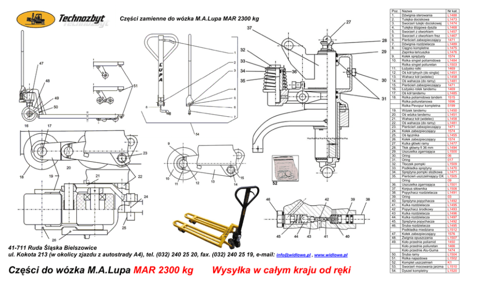 Poz. 1. 2. 3. 4. 5. 5 6. 7. 8. Części zamienne do wózka M.A.Lupa MAR 2300 kg 9. 10. 11. 12. 13. 14. 15. 16. 17. 18. 19. 20. 21. 22. 23. 24. 25. 26. 27. 28. 29. 30. 31. 32. 33. 34. 35. 52 36. 37. 38. 39. 40. 41. 42 43 44. 45. 46. 47. 48. 49. 41-711 Ruda Śląska Bielszowice ul. Kokota 213 (w okolicy zjazdu z autostrady A4), tel. (032) 240 25 20, fax. (032) 240 25 19, e-mail: [email protected] , www.widlowe.pl Części do wózka M.A.Lupa MAR 2300 kg Wysyłka w całym kraju od ręki 50. 51. 52. 53. 54. Nazwa Dźwignia sterowania Tulejka dociskowa Sworzeń tulejki dociskowej Tulejka ślizgowa dyszla Sworzeń z otworkiem Sworzeń z otworkiem frez Pierścień zabezpieczający Dźwignia rozdzielacza Cięgno kompletne Zapinka łańcuszka Kołek spręŜysty Rolka singiel poliamidowa Rolka singiel poliuretan ŁoŜysko rolki Oś kół tylnych (do singla) Wahacz kół (widelec) Oś wahacza (do ramy) Pierścień zabezpieczający ŁoŜysko rolek tandemu Oś kół tandemu Rolka poliamidowa tandem Rolka poliuretanowa Rolka Pevopur kompletna Wózek tandemu Oś wózka tandemu Wahacz kół (widelec) Oś wahacza (do ramy) Pierścień zabezpieczający Kołek zabezpieczający Oś łącznika Kołek zabezpieczający Kulka główki ramy Tłok główny fi 36 mm Uszczelka zgarniająca Oring Oring Tłoczek pompki Podkładka spręŜyny SpręŜyna pompki stoŜkowa Pierścień uszczelniający OX Oring Uszczelka zgarniająca Korpus siłownika Popychacz rozdzielacza Oring SpręŜyna popychacza Kulka rozdzielacza Popychacz środkowy Kulka rozdzielacza Kulka rozdzielacza SpręŜyna popychacza Śruba rozdzielacza Podkładka miedziana Kołek zabezpieczający Źwignia opuszczania Koło przednie poliamid Koło przednie poliuretan Koło przednie Alu-Guma Śruba ramy Rolka najazdowa Komplet uszczelnień Sworzeń mocowania jarzma Dyszel kompletny Nr kat. L1488 L1473 L1474 L1468 L1457 L1467 1471 L1489 L1475 L1476 1574 L1484 L1503 1469 L1451 L1458 L1481 1471 1469 L1485 1515 1696 5199 L1450 L1451 L1458 L1481 1471 1574 L1455 1574 L1477 L1494 L1500 06 017 L1509 L1470 L1471 L1505 09 L1501 L1508 L1491 03 L1492 L1495 L1493 L1496 L1497 L1492 L1495 L1512 1576 L1507 1450 1466 1474 L1504 L1502 K1 L1510 L1520