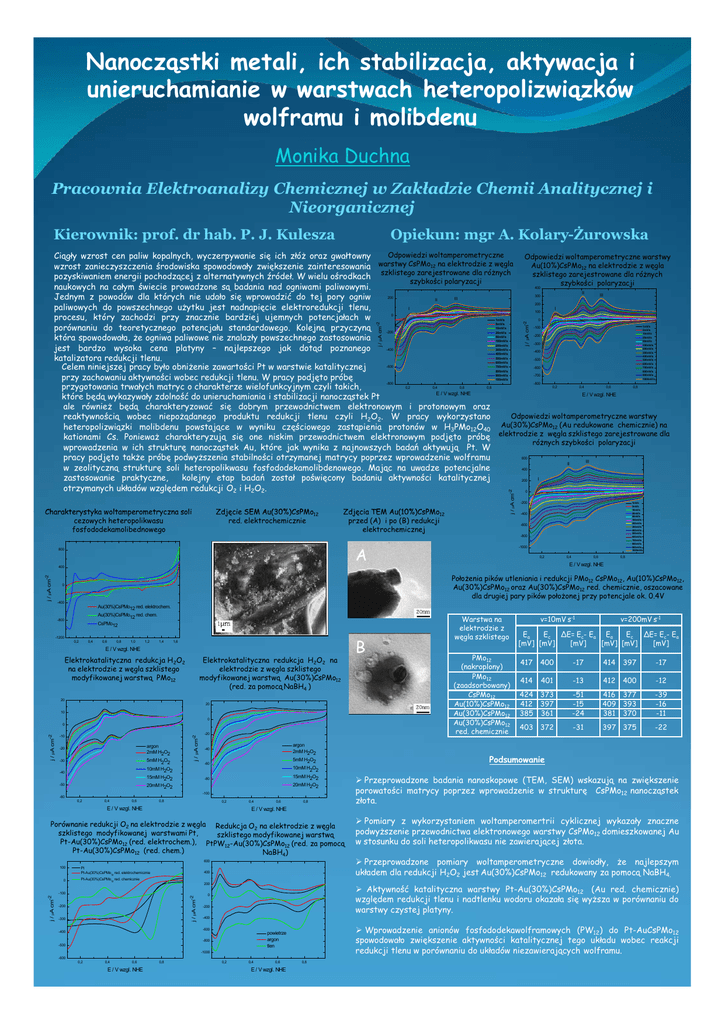 Nanocząstki metali, ich stabilizacja, aktywacja i unieruchamianie w warstwach heteropolizwiązków wolframu i molibdenu Monika Duchna Pracownia Elektroanalizy Chemicznej w Zakładzie Chemii Analitycznej i Nieorganicznej Kierownik: prof. dr hab. P. J. Kulesza Opiekun: mgr A. Kolary-Żurowska Odpowiedzi woltamperometryczne Ciągły wzrost cen paliw kopalnych, wyczerpywanie się ich złóż oraz gwałtowny Odpowiedzi woltamperometryczne warstwy Au(10%)CsPMo12 na elektrodzie z węgla wzrost zanieczyszczenia środowiska spowodowały zwiększenie zainteresowania warstwy CsPMo12 na elektrodzie z węgla szklistego zarejestrowane dla różnych szklistego zarejestrowane dla różnych pozyskiwaniem energii pochodzącej z alternatywnych źródeł. W wielu ośrodkach szybkości polaryzacji szybkości polaryzacji 400 naukowych na całym świecie prowadzone są badania nad ogniwami paliwowymi. II III 300 200 Jednym z powodów dla których nie udało się wprowadzić do tej pory ogniw III II 200 I paliwowych do powszechnego użytku jest nadnapięcie elektroredukcji tlenu, I 100 0 procesu, który zachodzi przy znacznie bardziej ujemnych potencjałach w 0 -100 porównaniu do teoretycznego potencjału standardowego. Kolejną przyczyną -200 -200 która spowodowała, że ogniwa paliwowe nie znalazły powszechnego zastosowania -300 -400 jest bardzo wysoka cena platyny – najlepszego jak dotąd poznanego -400 -500 katalizatora redukcji tlenu. -600 -600 Celem niniejszej pracy było obniżenie zawartości Pt w warstwie katalitycznej -700 przy zachowaniu aktywności wobec redukcji tlenu. W pracy podjęto próbę -800 -800 0,2 0,4 0,6 0,8 0,2 0,4 0,6 0,8 przygotowania trwałych matryc o charakterze wielofunkcyjnym czyli takich, E / V wzgl. NHE E / V wzgl. NHE które będą wykazywały zdolność do unieruchamiania i stabilizacji nanocząstek Pt ale również będą charakteryzować się dobrym przewodnictwem elektronowym i protonowym oraz Odpowiedzi woltamperometryczne warstwy reaktywnością wobec niepożądanego produktu redukcji tlenu czyli H2O2. W pracy wykorzystano heteropolizwiązki molibdenu powstające w wyniku częściowego zastąpienia protonów w H3PMo12O40 Au(30%)CsPMo12 (Au redukowane chemicznie) na elektrodzie z węgla szklistego zarejestrowane dla kationami Cs. Ponieważ charakteryzują się one niskim przewodnictwem elektronowym podjęto próbę różnych szybkości polaryzacji wprowadzenia w ich strukturę nanocząstek Au, które jak wynika z najnowszych badań aktywują Pt. W 600 pracy podjęto także próbę podwyższenia stabilności otrzymanej matrycy poprzez wprowadzenie wolframu III II w zeolityczną strukturę soli heteropolikwasu fosfododekamolibdenowego. Mając na uwadze potencjalne 400 I zastosowanie praktyczne, kolejny etap badań został poświęcony badaniu aktywności katalitycznej 200 otrzymanych układów względem redukcji O2 i H2O2. 0 Charakterystyka woltamperometryczna soli cezowych heteropolikwasu fosfododekamolibednowego Zdjęcie SEM Au(30%)CsPMo12 red. elektrochemicznie Zdjęcia TEM Au(10%)CsPMo12 przed (A) i po (B) redukcji elektrochemicznej j / A cm-2 1mV/s 5mV/s 10mV/s 20mV/s 50mV/s 100mV/s 200mV/s 300mV/s 400mV/s 500mV/s 600mV/s 700mV/s 800mV/s 900mV/s 100mV/s j / A cm-2 j / A cm-2 I 1mV/s 5mV/s 10mV/s 20mV/s 50mV/s 100mV/s 200mV/s 300mV/s 400mV/s 500mV/s 600mV/s 700mV/s 800mV/s 900mV/s 1000mV/s -200 1mV/s 5mV/s 10mV/s 20mV/s 50mV/s 100mV/s 200mV/s 300mV/s 400mV/s 500mV/s 600mV/s 700mV/s 800mV/s 900mV/s 1000mV/s -400 -600 -800 -1000 A 800 0,2 j / A cm-2 0,8 -400 Au(30%)CsPMo12 red. elektrochem. Au(30%)CsPMo12 red. chem. CsPMo12 -1200 0,2 0,4 0,6 0,8 1,0 1,2 1,4 1,6 E / V wzgl. NHE Elektrokatalityczna redukcja H 2O2 na elektrodzie z węgla szklistego modyfikowanej warstwą PMo12 Elektrokatalityczna redukcja H 2O2 na elektrodzie z węgla szklistego modyfikowanej warstwą Au(30%)CsPMo12 (red. za pomocą NaBH4 ) 20 20 10 0 -10 -20 argon 2mM H2O2 -30 5mM H2O2 -40 -50 j / A cm-2 0 j / A cm-2 0,6 Położenia pików utleniania i redukcji PMo12 CsPMo12, Au(10%)CsPMo12, Au(30%)CsPMo12 oraz Au(30%)CsPMo12 red. chemicznie, oszacowane dla drugiej pary pików położonej przy potencjale ok. 0.4V 0 -800 -20 argon 2mM H2O2 -40 5mM H2O2 -60 10mM H2O2 10mM H2O2 15mM H2O2 15mM H2O2 -80 20mM H2O2 20mM H2O2 -100 -60 0,2 0,4 0,6 0,8 0,2 E / V wzgl. NHE 0,4 0,6 0,8 0 Pt Pt-Au(30%)CsPMo12 red. elektrochemicznie 400 Pt-Au(30%)CsPMo12 red. chemicznie 200 j / A cm-2 -100 -200 -300 -1000 -600 0,6 417 400 -17 414 397 414 -17 401 -13 412 400 -12 424 373 412 397 385 361 -51 -15 -24 416 377 409 393 381 370 -39 -16 -11 403 372 -31 397 375 -22 Podsumowanie Przeprowadzone badania nanoskopowe (TEM, SEM) wskazują na zwiększenie porowatości matrycy poprzez wprowadzenie w strukturę CsPMo12 nanocząstek złota. 0,8 Pomiary z wykorzystaniem woltamperomertrii cyklicznej wykazały znaczne podwyższenie przewodnictwa elektronowego warstwy CsPMo12 domieszkowanej Au w stosunku do soli heteropolikwasu nie zawierającej złota. Wprowadzenie anionów fosfododekawolframowych (PW12) do Pt-AuCsPMo12 spowodowało zwiększenie aktywności katalitycznej tego układu wobec reakcji redukcji tlenu w porównaniu do układów niezawierających wolframu. powietrze argon tlen -800 E / V wzgl. NHE Ea Ec ΔE= Ec- Ea Ea Ec ΔE= Ec- Ea [mV] [mV] [mV] [mV] [mV] [mV] -400 -500 0,4 v=200mV s-1 Aktywność katalityczna warstwy Pt-Au(30%)CsPMo12 (Au red. chemicznie) względem redukcji tlenu i nadtlenku wodoru okazała się wyższa w porównaniu do warstwy czystej platyny. 0 -200 -600 -400 0,2 PMo12 (nakroplony) PMo12 (zaadsorbowany) CsPMo12 Au(10%)CsPMo12 Au(30%)CsPMo12 Au(30%)CsPMo12 red. chemicznie v=10mV s-1 Przeprowadzone pomiary woltamperometryczne dowiodły, że najlepszym układem dla redukcji H2O2 jest Au(30%)CsPMo12 redukowany za pomocą NaBH4. 600 100 B Warstwa na elektrodzie z węgla szklistego E / V wzgl. NHE Porównanie redukcji O2 na elektrodzie z węgla Redukcja O2 na elektrodzie z węgla szklistego modyfikowanej warstw