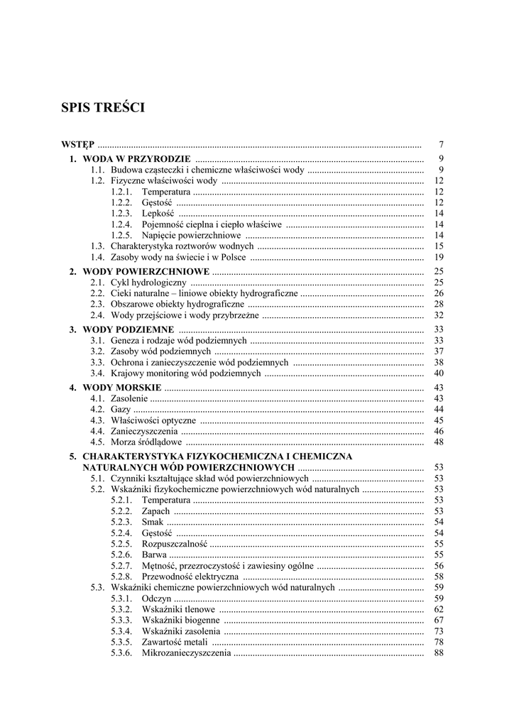 SPIS TREŚCI 7 WSTĘP ........................................................................................................................................ 9 1. WODA W PRZYRODZIE ................................................................................................ 1.1. Budowa cząsteczki i chemiczne właściwości wody ................................................................ 9 1.2. Fizyczne właściwości wody ................................................................................................ 12 1.2.1. Temperatura .....................................................................................................12 1.2.2. Gęstość ............................................................................................................12 1.2.3. Lepkość ...........................................................................................................14 1.2.4. Pojemność cieplna i ciepło właściwe ..............................................................14 1.2.5. Napięcie powierzchniowe ...............................................................................14 1.3. Charakterystyka roztworów wodnych .......................................................................................... 15 1.4. Zasoby wody na świecie i w Polsce ............................................................................................. 19 2. WODY POWIERZCHNIOWE ..............................................................................................25 2.1. Cykl hydrologiczny .................................................................................................... 25 2.2. Cieki naturalne – liniowe obiekty hydrograficzne ...................................................... 26 2.3. Obszarowe obiekty hydrograficzne ............................................................................ 28 2.4. Wody przejściowe i wody przybrzeżne ...................................................................... 32 33 3. WODY PODZIEMNE ............................................................................................................... 3.1. Geneza i rodzaje wód podziemnych ........................................................................... 33 3.2. Zasoby wód podziemnych .......................................................................................... 37 3.3. Ochrona i zanieczyszczenie wód podziemnych ......................................................... 38 3.4. Krajowy monitoring wód podziemnych ..................................................................... 40 4. WODY MORSKIE ..................................................................................................................43 4.1. Zasolenie ..................................................................................................................... 43 4.2. Gazy ............................................................................................................................ 44 4.3. Właściwości optyczne ................................................................................................ 45 4.4. Zanieczyszczenia ........................................................................................................ 46 4.5. Morza śródlądowe ...................................................................................................... 48 5. CHARAKTERYSTYKA FIZYKOCHEMICZNA I CHEMICZNA NATURALNYCH WÓD POWIERZCHNIOWYCH ..........................................................53 5.1. Czynniki kształtujące skład wód powierzchniowych ................................................. 53 5.2. Wskaźniki fizykochemiczne powierzchniowych wód naturalnych ............................ 53 5.2.1. Temperatura ................................................................................................................ 53 5.2.2. Zapach .............................................................................................................53 5.2.3. Smak ................................................................................................................54 5.2.4. Gęstość ............................................................................................................54 5.2.5. Rozpuszczalność ..............................................................................................55 5.2.6. Barwa ...............................................................................................................55 5.2.7. Mętność, przezroczystość i zawiesiny ogólne .................................................56 5.2.8. Przewodność elektryczna ................................................................................58 5.3. Wskaźniki chemiczne powierzchniowych wód naturalnych ...................................... 59 5.3.1. Odczyn .............................................................................................................59 5.3.2. Wskaźniki tlenowe ..........................................................................................62 5.3.3. Wskaźniki biogenne ........................................................................................67 5.3.4. Wskaźniki zasolenia ........................................................................................73 5.3.5. Zawartość metali .............................................................................................78 5.3.6. Mikrozanieczyszczenia ....................................................................................88 4 Spis treści 5.4. Klasyfikacja stanu jednolitych części wód powierzchniowych ................................ 94 6. PROCESY FIZYCZNE I CHEMICZNE ZACHODZĄCE W NATURALNYCH WODACH PODZIEMNYCH ................................................................................................97 6.1. Procesy fizyczne kształtujące skład wód podziemnych ............................................. 97 6.1.1. Utlenianie i redukcj