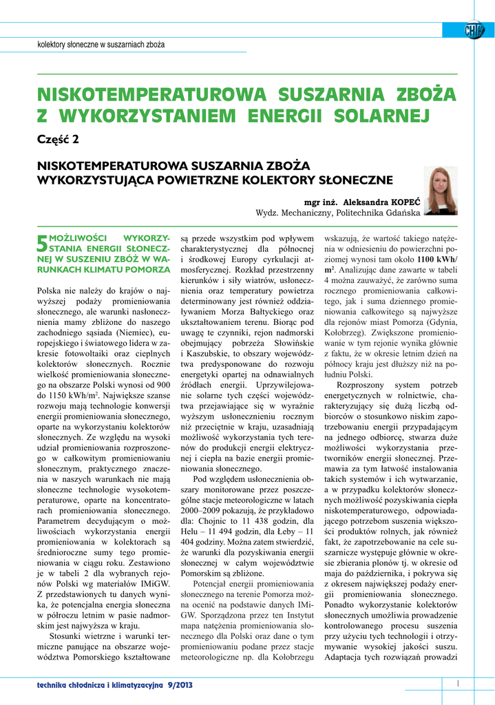 kolektory słoneczne w suszarniach zboża NISKOTEMPERATUROWA SUSZARNIA ZBOŻA Z WYKORZYSTANIEM ENERGII SOLARNEJ Część 2 Niskotemperaturowa suszarnia zboża wykorzystująca powietrzne kolektory słoneczne mgr inż. Aleksandra KOPEĆ Wydz. Mechaniczny, Politechnika Gdańska 5 Możliwości wykorzystania energii słonecznej w suszeniu zbóż w warunkach klimatu Pomorza Polska nie należy do krajów o najwyższej podaży promieniowania słonecznego, ale warunki nasłonecznienia mamy zbliżone do naszego zachodniego sąsiada (Niemiec), europejskiego i światowego lidera w zakresie fotowoltaiki oraz cieplnych kolektorów słonecznych. Rocznie wielkość promieniowania słonecznego na obszarze Polski wynosi od 900 do 1150 kWh/m2. Największe szanse rozwoju mają technologie konwersji energii promieniowania słonecznego, oparte na wykorzystaniu kolektorów słonecznych. Ze względu na wysoki udział promieniowania rozproszonego w całkowitym promieniowaniu słonecznym, praktycznego znaczenia w naszych warunkach nie mają słoneczne technologie wysokotemperaturowe, oparte na koncentratorach promieniowania słonecznego. Parametrem decydującym o możliwościach wykorzystania energii promieniowania w kolektorach są średnioroczne sumy tego promieniowania w ciągu roku. Zestawiono je w tabeli 2 dla wybranych rejonów Polski wg materiałów IMiGW. Z przedstawionych tu danych wynika, że potencjalna energia słoneczna w półroczu letnim w pasie nadmorskim jest najwyższa w kraju. Stosunki wietrzne i warunki termiczne panujące na obszarze województwa Pomorskiego kształtowane są przede wszystkim pod wpływem charakterystycznej dla północnej i środkowej Europy cyrkulacji atmosferycznej. Rozkład przestrzenny kierunków i siły wiatrów, usłonecznienia oraz temperatury powietrza determinowany jest również oddziaływaniem Morza Bałtyckiego oraz ukształtowaniem terenu. Biorąc pod uwagę te czynniki, rejon nadmorski obejmujący pobrzeża Słowińskie i Kaszubskie, to obszary województwa predysponowane do rozwoju energetyki opartej na odnawialnych źródłach energii. Uprzywilejowanie solarne tych części województwa przejawiające się w wyraźnie wyższym usłonecznieniu rocznym niż przeciętnie w kraju, uzasadniają możliwość wykorzystania tych terenów do produkcji energii elektrycznej i ciepła na bazie energii promieniowania słonecznego. Pod względem usłonecznienia obszary monitorowane przez poszczególne stacje meteorologiczne w latach 2000–2009 pokazują, że przykładowo dla: Chojnic to 11 438 godzin, dla Helu – 11 494 godzin, dla Łeby – 11 404 godziny. Można zatem stwierdzić, że warunki dla pozyskiwania energii słonecznej w całym województwie Pomorskim są zbliżone. Potencjał energii promieniowania słonecznego na terenie Pomorza można ocenić na podstawie danych IMiGW. Sporządzona przez ten Instytut mapa natężenia promieniowania słonecznego dla Polski oraz dane o tym promieniowaniu podane przez stacje meteorologiczne np. dla Kołobrzegu technika chłodnicza i klimatyzacyjna 9/2013 wskazują, że wartość takiego natężenia w odniesieniu do powierzchni poziomej wynosi tam około 1100 kWh/ m2. Analizując dane zawarte w tabeli 4 można zauważyć, że zarówno suma rocznego promieniowania całkowitego, jak i suma dziennego promieniowania całkowitego są najwyższe dla rejonów miast Pomorza (Gdynia, Kołobrzeg). Zwiększone promieniowanie w tym rejonie wynika głównie z faktu, że w okresie letnim dzień na północy kraju jest dłuższy niż na południu Polski. Rozproszony system potrzeb energetycznych w rolnictwie, charakteryzujący się dużą liczbą odbiorców o stosunkowo niskim zapotrzebowaniu energii przypadającym na jednego odbiorcę, stwarza duże możliwości wykorzystania przetworników energii słonecznej. Przemawia za tym łatwość instalowania takich systemów i ich wytwarzanie, a w przypadku kolektorów słonecznych możliwość pozyskiwania ciepła niskotemperaturowego, odpowiadającego potrzebom suszenia większości produktów rolnych, jak również fakt, że zapotrzebowanie na cele suszarnicze występuje głównie w okresie zbierania plonów tj. w okresie od maja do października, i pokrywa się z okresem największej podaży energii promieniowania słonecznego. Ponadto wykorzystanie kolektorów słonecznych umożliwia prowadzenie kontrolowanego procesu suszenia przy użyciu tych technologii i otrzymywanie wysokiej jakości suszu. Adaptacja tych rozwiązań prowadzi 1 kolektory słoneczne w suszarniach zboża Tabela 2. Potencjalna energia użyteczna promieniowania słonecznego w [kWh/ m2/rok] w wybranych rejonach Polski wg materiałów IMiGW. Rok (I-XII) Półrocze letnie (IV-IX) Sezon letni (VI-VIII) Półrocze zimowe (X-III) Pas nadmorski 1076 881 497 195 Wschodnia część Polski 1081 821 461 260 Centralna część Polski 985 785 449 200 Rejon wietrza suszącego nie przekraczającą 40ºC, co stwarza bardzo dogodne warunki do wykorzystania płaskich kolektorów słonecznych. Im niższe są dopuszczalne temperatury suszenia surowca przy wyższym natężeniu przepływu powietrza i im dłuższy jest okres zbioru w ciągu roku, tym korzystniejsze są warunki do wykorzystania energii słonecznej. Suszenie niskotemperaturowe może być realizowane przez zastosowanie nawet prostych konstrukcyjnie i niedrogich kolektorów słonecznych. Z danych przedstawionych powyżej wynika, że województwo Pomorskie charakteryzuje się w skali kraju, korzystnymi warunkami nasłonecznienia, szczególnie w pasie nadmorskim. Na podkreślenie zasługuje fakt, że wartość średnia usłonecznienia na obszarze tego województwa jest wyższa od średniej krajowej (1600 h/rok) i wynosi około 1700 h/rok. Występowanie tak sprzyjających warunków stwarza możliwość wykorzystania energii słonecznej w rolnictwie, a w szczególności w procesach suszenia zbóż. Przemawia za tym łatwość wytwarzania ciepła niskotemperaturowego w kolektorach słonecz