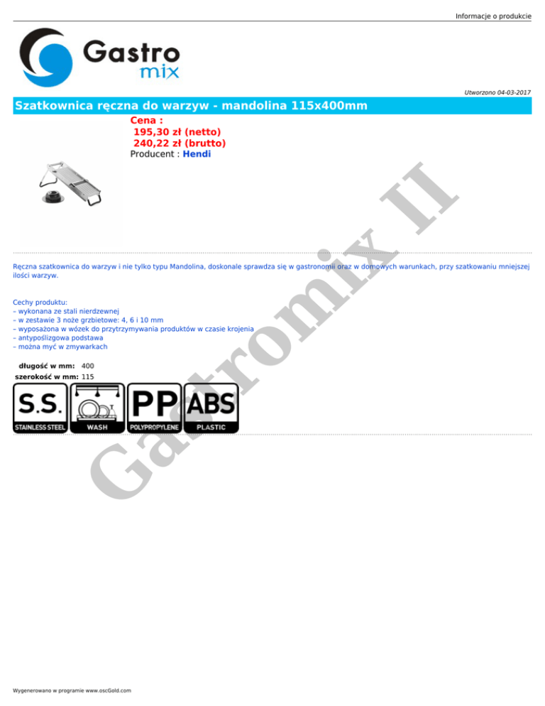 Informacje o produkcie Utworzono 04-03-2017 Szatkownica ręczna do warzyw - mandolina 115x400mm Cena : 195,30 zł (netto) 240,22 zł (brutto) ix II Producent : Hendi m Ręczna szatkownica do warzyw i nie tylko typu Mandolina, doskonale sprawdza się w gastronomii oraz w domowych warunkach, przy szatkowaniu mniejszej ilości warzyw. długość w mm: 400 G as szerokość w mm: 115 tr o Cechy produktu: – wykonana ze stali nierdzewnej – w zestawie 3 noże grzbietowe: 4, 6 i 10 mm – wyposażona w wózek do przytrzymywania produktów w czasie krojenia – antypoślizgowa podstawa – można myć w zmywarkach Wygenerowano w programie www.oscGold.com