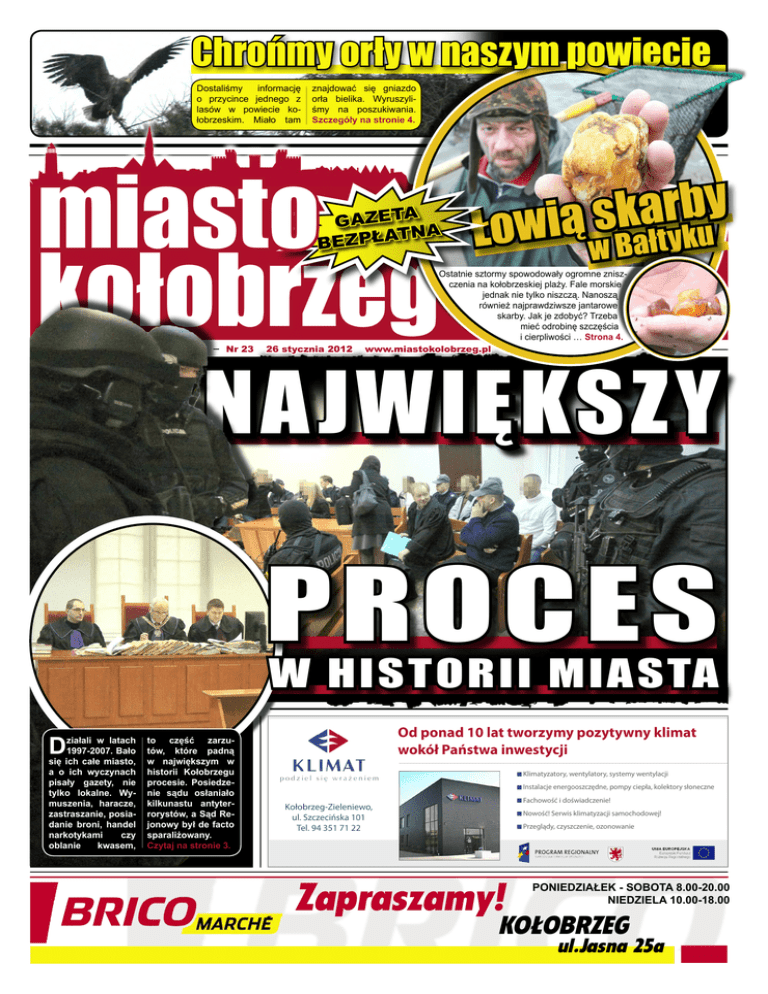 Chrońmy orły w naszym powiecie miasto kołobrzeg | 1 styczeń 2012 www.miastokolobrzeg.pl informację Dostaliśmy o przycince jednego z lasów w powiecie kołobrzeskim. Miało tam znajdować się gniazdo orła bielika. Wyruszyliśmy na poszukiwania. Szczegóły na stronie 4. miasto kołobrzeg A GAZET TNA A Ł P Z E B y b r a k s ą i w Ło Bałtyku w Ostatnie sztormy spowodowały ogromne zniszczenia na kołobrzeskiej plaży. Fale morskie jednak nie tylko niszczą. Nanoszą również najprawdziwsze jantarowe skarby. Jak je zdobyć? Trzeba mieć odrobinę szczęścia i cierpliwości … Strona 4. www.miastokolobrzeg.pl NA JWIĘKSZY Nr 23 26 stycznia 2012 PROCES W HISTORII MIASTA D ziałali w latach 1997-2007. Bało się ich całe miasto, a o ich wyczynach pisały gazety, nie tylko lokalne. Wymuszenia, haracze, zastraszanie, posiadanie broni, handel narkotykami czy oblanie kwasem, to część zarzutów, które padną w największym w historii Kołobrzegu procesie. Posiedzenie sądu osłaniało kilkunastu antyterrorystów, a Sąd Rejonowy był de facto sparaliżowany. Czytaj na stronie 3. Od ponad 10 lat tworzymy pozytywny klimat wokół Państwa inwestycji Klimatyzatory, wentylatory, systemy wentylacji Instalacje energooszczędne, pompy ciepła, kolektory słoneczne Fachowość i doświadczenie! Kołobrzeg-Zieleniewo, ul. Szczecińska 101 Tel. 94 351 71 22 Nowość! Serwis klimatyzacji samochodowej! Przeglądy, czyszczenie, ozonowanie Zapraszamy! PONIEDZIAŁEK - SOBOTA 8.00-20.00 NIEDZIELA 10.00-18.00 KOŁOBRZEG ul.Jasna 25a 2 | miasto kołobrzeg www.miastokolobrzeg.pl styczeń 2012 Mieszka w Podczelu, ma 23 lata. Jest normalną dziewczyną. Niestety, walczy z chorobą, która uniemożliwia jej normalne życie. Pomóc może każdy. Natalia liczy na nasze dobre serce Urodziłam się 23 lata temu z poważną wadą serca. Niestety nie została ona wtedy prawidłowo rozpoznana w Polsce i kiedy wysłano mnie na operację do USA w wieku 2,5 lat okazało się, że jest już za późno na zabieg. Nikt nie przypuszczałby wtedy, że uda mi się z tym przeżyć tak długo. Z czasem choroba zaczęła jednak coraz bardziej ograniczać moje życie. Stopniowo pojawiające się zmęczenie z upływem lat przekształciło się w znaczną niewydolność. Musiałam przerwać studia, rzadko wychodzę z domu na spacer... nie mogę nawet nigdzie podróżować, spotkać się z przyjaciółmi ani żyć jak większość młodych ludzi bo w każdej chwili moje samopoczucie może się pogorszyć i muszę leżeć pod tlenem. Mój obecny stan zdrowia nie pozwala mi już na normalne funkcjonowanie. Często mam silne duszności i męczy mnie nawet najmniejszy wysiłek. Zwyczajne codzienne czynności, chodzenie po schodach są dla mnie bardzo wyczerpujące zwłaszcza, że mieszkam na IV piętrze. Leczenie farmakologiczne i tlenoterapia minimalizują jedynie skutki choroby. Wszystkie możliwości leczenia w naszym kraju zostały już wykorzystane i jedyną szansą na ratowanie mojego życia jest przeszczep obu płuc i serca ale nie wykonuje się go w Polsce. Mam jeszcze szansę na transplantację w UE. Nawiązałam kontakt z kliniką w Niemczech, która po zapoznaniu z moją dokumentacją medyczną wyraziła zgodę na konsultację i badania w celach kwalifikacji do operacji. Warunkiem mojego wyjazdu jest opłata kosztów badań i operacji. Są to ogromne koszty kilkunastu tysięcy złotych. Kwota prawie pół miliona złotych przerasta możliwości moje, mojej rodziny oraz przyjaciół. Nie chciałabym stracić tej możliwości bo bez operacji jestem skazana na powolną śmierć. Proszę wszystkich ludzi dobrej woli, którzy chcieliby włączyć się w zbiórkę o przekazanie 1% podatku lub wpłatę pieniędzy na poniższy numer konta jeśli to możliwe. To bardzo ważne dla mnie, dlatego istotna jest każda, nawet najmniejsza pomoc. Na każdej wpłacie lub deklaracji PIT opis musi zawierać Fundacja Serce Dziecka im. Diny Radziwiłłowej, KRS 0000266644 a w polu informacji dodatkowych: Natalia Zawada imię i nazwisko: NATALIA ZAWADA Przyda się każda złotówka bądź 1% podatku, który można niewielkim wysiłkiem przekazać na konto fundacji. Pomoc finansową prosimy kierować na konto: Fundacja Serce Dziecka im. Diny Radziwiłłowej ul. Narbutta 27 lok.1, 02536 Warszawa Nr konta na wpłaty złotowe PL 12 1160 2202 0000 0001 4668 2533, Nr konta na wpłaty w euro PL 09 1160 2202 0000 0001 2152 1272, SWIFT BIGBPLPW koniecznie z dopiskiem: Natalia Zawada 1% podatku można przekazać w rozliczeniu rocznym PIT, w którym należy podać: Konta bankowe podane powyżej należą do fundacji „Serce dziecka”, nie są kontami prywatnymi. Przy braku imienia i nazwiska dziecka na wpłacie lub deklaracji PIT pieniądze przechodzą na cele fundacji i nie ma możliwości rozliczyć ich jako przeznaczonych konkretnie dla danej osoby! 1% Papier toaletowy Velvet Classic ul. Perłowa 55, Kołobrzeg, przy wyjeździe na Grzybowo. godziny otwarcia: pon-sob 6.30-22.30, ndz 9.00-21.00) 8 rolek 4,99 PLN ZIOŁOLECZNICTWO KLASZTORNE Miody naturalne i ziołomiody lecznicze Sok pomarańczowy Cappy 1l Syropy na przeziębienia i wszelkie dolegliwości, również dla diabetyków DOSTĘPNE TYLKO W STOISKU PATRONACKIM W DELIKATESACH 34 Działa wykrztuśnie, moczopędnie i bakteriobójczo. Zalecany przy schorzeniach górnych dróg oddechowych, anginach, zapaleniach gardła, i krtani. Działa też rozkurczowo i lekko żółciopędnie. CENY PROMOCYJNE 2,99 PLN Oliwki zielone Sacla 185g/85g 2,49 PLN Kawa rozpuszczalna Jacobs Cronat Gold 200g 26,99 PLN miasto kołobrzeg | 3 styczeń 2012 www.miastokolobrzeg.pl Zeznania Roberta G. ps. „Gronek” zachwiały pozycją wielu przestępców. Część z nich została aresztowana, część odpowiada z wolnej stopy. O ich winie zadecydują kołobrzescy sędziowie. Na razie, prokuratorowi nie udało się odczytać aktu oskarżenia. Kołobrzeski półświatek ma się czego obawiać W ostatni piątek kołobrzeski 