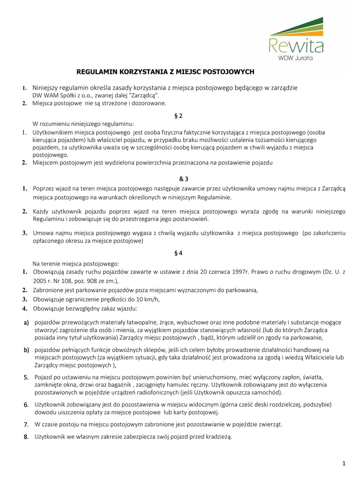 REGULAMIN KORZYSTANIA Z MIEJSC POSTOJOWYCH 1. Niniejszy regulamin określa zasady korzystania z miejsca postojowego będącego w zarządzie DW WAM Spółki z o.o., zwanej dalej "Zarządcą". 2. Miejsca postojowe nie są strzeżone i dozorowane. §2 W rozumieniu niniejszego regulaminu: 1. Użytkownikiem miejsca postojowego jest osoba fizyczna faktycznie korzystająca z miejsca postojowego (osoba kierująca pojazdem) lub właściciel pojazdu, w przypadku braku możliwości ustalenia tożsamości kierującego pojazdem, za użytkownika uważa się w szczególności osobę kierującą pojazdem w chwili wyjazdu z miejsca postojowego. 2. Miejscem postojowym jest wydzielona powierzchnia przeznaczona na postawienie pojazdu &3 1. Poprzez wjazd na teren miejsca postojowego następuje zawarcie przez użytkownika umowy najmu miejsca z Zarządcą miejsca postojowego na warunkach określonych w niniejszym Regulaminie. 2. Każdy użytkownik pojazdu poprzez wjazd na teren miejsca postojowego wyraża zgodę na warunki niniejszego Regulaminu i zobowiązuje się do przestrzegania jego postanowień. 3. Umowa najmu miejsca postojowego wygasa z chwilą wyjazdu użytkownika z miejsca postojowego (po zakończeniu opłaconego okresu za miejsce postojowe) §4 Na terenie miejsca postojowego: 1. Obowiązują zasady ruchu pojazdów zawarte w ustawie z dnia 20 czerwca 1997r. Prawo o ruchu drogowym (Dz. U. z 2005 r. Nr 108, poz. 908 ze zm.), 2. Zabronione jest parkowanie pojazdów poza miejscami wyznaczonymi do parkowania, 3. Obowiązuje ograniczenie prędkości do 10 km/h, 4. Obowiązuje bezwzględny zakaz wjazdu: a) pojazdów przewożących materiały łatwopalne, żrące, wybuchowe oraz inne podobne materiały i substancje mogące stworzyć zagrożenie dla osób i mienia, za wyjątkiem pojazdów stanowiących własność (lub do których Zarządca posiada inny tytuł użytkowania) Zarządcy miejsc postojowych , bądź, którym udzielił on zgody na parkowanie, b) pojazdów pełniących funkcje obwoźnych sklepów, jeśli ich celem byłoby prowadzenie działalności handlowej na miejscach postojowych (za wyjątkiem sytuacji, gdy taka działalność jest prowadzona za zgodą i wiedzą Właściciela lub Zarządcy miejsc postojowych ), 5. Pojazd po ustawieniu na miejscu postojowym powinien być unieruchomiony, mieć wyłączony zapłon, światła, zamknięte okna, drzwi oraz bagażnik , zaciągnięty hamulec ręczny. Użytkownik zobowiązany jest do wyłączenia pozostawionych w pojeździe urządzeń radiofonicznych (jeśli Użytkownik opuszcza samochód). 6. Użytkownik zobowiązany jest do pozostawienia w miejscu widocznym (górna cześć deski rozdzielczej, podszybie) dowodu uiszczenia opłaty za miejsce postojowe lub karty postojowej. 7. W czasie postoju na miejscu postojowym zabronione jest pozostawianie w pojeździe zwierząt. 8. Użytkownik we własnym zakresie zabezpiecza swój pojazd przed kradzieżą. 1 9. Na jednym miejscu postojowym wyznaczonym dla samochodów osobowych dozwolone jest parkowanie dwóch motocykli. §5 1. Zarządca nie ponosi odpowiedzialności za jakiekolwiek szkody powstałe w wyniku siły wyższej, żywiołów, kradzieży (włamania, rozboju itp.) rabunku, zniszczenia lub uszkodzenia pojazdów znajdujących się na miejscu postojowym, jak również rzeczy w nich pozostawionych lub stanowiących ich wyposażenie. 2. Wyłącza się odpowiedzialność Zarządcy z tytułu szkód komunikacyjnych i parkingowych dotyczących pojazdów i osób korzystających z miejsc postojowych . §6 1. Miejsca postojowe są czynne całodobowo, 7 dni w tygodniu. 2. Zarządca ma wyłączne prawo decydowania o zamknięciu i otwarciu miejsc postojowych w terminach przez siebie ustalonych. 3. W szczególnie uzasadnionych przypadkach, Zarządca może podjąć decyzje o okresowym wyłączeniu miejsc postojowych z użytkowania lub zmianie czasu otwarcia Parkingu. §7 1. W przypadku naruszenia przez Użytkownika postanowień niniejszego Regulaminu Zarządca może rozwiązać umowę najmu miejsca postojowego bez wypowiedzenia w trybie natychmiastowym oraz zastosować środki niezbędne dla przywrócenia stanu zgodnego z Regulaminem, w tym również poprzez usunięcie pojazdu z miejsca postojowego , bądź zastosowania blokady mechanicznej pojazdu. 2. W przypadkach określonych w ust. 1 Użytkownik zobowiązany jest do pokrycia kosztów związanych z usunięciem pojazdu z Parkingu oraz jego zabezpieczeniem i przechowaniem do czasu odbioru pojazdu przez Użytkownika lub wniesieniem opłaty dodatkowej w wysokości określonej odrębnymi przepisami . 3. Użytkownik ponosi odpowiedzialność za wszelkie szkody spowodowane przez pojazd lub powstałe w związku z korzystaniem z miejsca postojowego, w szczególności z tytułu zanieczyszczenia powierzchni parkingu na skutek wycieku płynów z pojazdu (wyciek oleju, płynu hamulcowego, płynu chłodniczego itp.). 1. 1. 2. 3. §8 Zakazane jest parkowanie pojazdów samochodowych na miejscach postojowych przeznaczonych dla osób niepełnosprawnych innym osobom, niż Użytkownikom pojazdów posiadających ważną kartę postojową której mowa w art. 8 ustawy - Prawo o ruchu drogowym, umieszczoną każdorazowo w widocznym miejscu za przednią szybą pojazdu. §9 Opłatę za miejsce postojowe uiszcza się w recepcji WDW (Delfin) (Jantar) zgodnie z cennikiem, który stanowi załącznik do niniejszego regulaminu Użytkownik dodatkowo uiszcza opłatę zwrotną- depozyt za otrzymanie pilota do bramy w przypadku wielokrotnych wjazdów i wyjazdów. Użytkownik, który stawia pojazd na miejscu postojowym na cały okres pobytu nie jest zobowiązany do posiadania pilota./ Nie korzysta w tym okresie z wjazdów i wyjazdów/ § 10 1. Wjeżdżając i wyjeżdżając na miejsce postojowe w DW Delfin i Jantar należy obowiązkowo: a) zatrzymać się przed bramą, b) uruchomić bramę poprzez użycie pilota, c) pamiętać, że brama zamyka się po każdym przejeździe samochodu samoczynnie, 2 d) ustawi