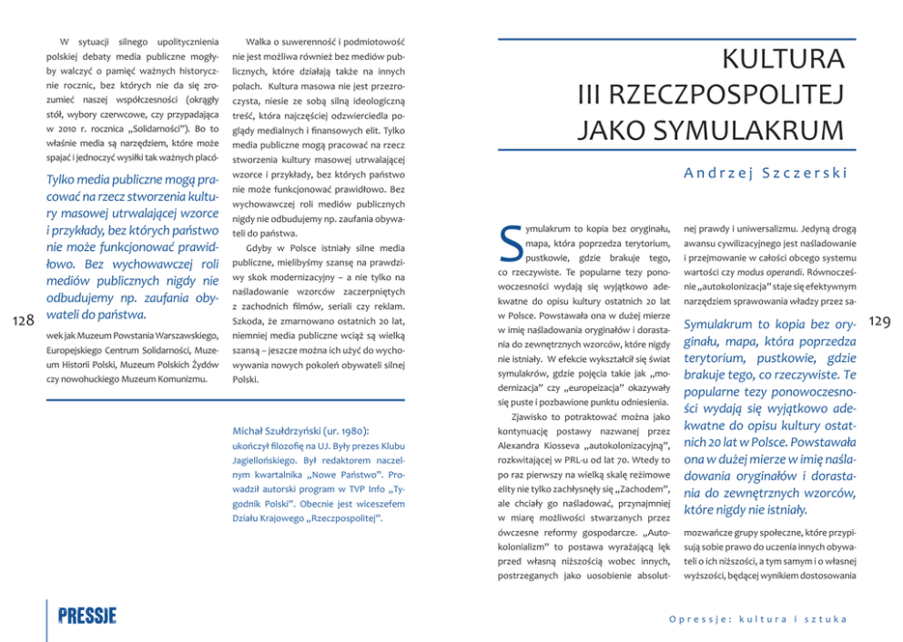 W sytuacji silnego upolitycznienia polskiej debaty media publiczne mogłyby walczyć o pamięć ważnych historycznie rocznic, bez których nie da się zrozumieć naszej współczesności (okrągły stół, wybory czerwcowe, czy przypadająca w 2010 r. rocznica „Solidarności”). Bo to właśnie media są narzędziem, które może 128 Walka o suwerenność i podmiotowość KULTURA III RZECZPOSPOLITEJ JAKO SYMULAKRUM nie jest możliwa również bez mediów publicznych, które działają także na innych polach. Kultura masowa nie jest przezroczysta, niesie ze sobą silną ideologiczną treść, która najczęściej odzwierciedla poglądy medialnych i finansowych elit. Tylko media publiczne mogą pracować na rzecz spajać i jednoczyć wysiłki tak ważnych placó- stworzenia kultury masowej utrwalającej Tylko media publiczne mogą pracować na rzecz stworzenia kultury masowej utrwalającej wzorce i przykłady, bez których państwo nie może funkcjonować prawidłowo. Bez wychowawczej roli mediów publicznych nigdy nie odbudujemy np. zaufania obywateli do państwa. wzorce i przykłady, bez których państwo wek jak Muzeum Powstania Warszawskiego, Europejskiego Centrum Solidarności, Muzeum Historii Polski, Muzeum Polskich Żydów czy nowohuckiego Muzeum Komunizmu. niemniej media publiczne wciąż są wielką Andrzej Szczerski nie może funkcjonować prawidłowo. Bez wychowawczej roli mediów publicznych nigdy nie odbudujemy np. zaufania obywateli do państwa. Gdyby w Polsce istniały silne media publiczne, mielibyśmy szansę na prawdziwy skok modernizacyjny – a nie tylko na naśladowanie wzorców zaczerpniętych z zachodnich filmów, seriali czy reklam. Szkoda, że zmarnowano ostatnich 20 lat, szansą – jeszcze można ich użyć do wychowywania nowych pokoleń obywateli silnej Polski. Michał Szułdrzyński (ur. 1980): ukończył filozofię na UJ. Były prezes Klubu Jagiellońskiego. Był redaktorem naczelnym kwartalnika „Nowe Państwo”. Prowadził autorski program w TVP Info „Tygodnik Polski”. Obecnie jest wiceszefem Działu Krajowego „Rzeczpospolitej”. S ymulakrum to kopia bez oryginału, mapa, która poprzedza terytorium, pustkowie, gdzie brakuje tego, co rzeczywiste. Te popularne tezy ponowoczesności wydają się wyjątkowo adekwatne do opisu kultury ostatnich 20 lat w Polsce. Powstawała ona w dużej mierze w imię naśladowania oryginałów i dorastania do zewnętrznych wzorców, które nigdy nie istniały. W efekcie wykształcił się świat symulakrów, gdzie pojęcia takie jak „modernizacja” czy „europeizacja” okazywały się puste i pozbawione punktu odniesienia. Zjawisko to potraktować można jako kontynuację postawy nazwanej przez Alexandra Kiosseva „autokolonizacyjną”, rozkwitającej w PRL-u od lat 70. Wtedy to po raz pierwszy na wielką skalę reżimowe elity nie tylko zachłysnęły się „Zachodem”, ale chciały go naśladować, przynajmniej w miarę możliwości stwarzanych przez ówczesne reformy gospodarcze. „Autokolonializm” to postawa wyrażającą lęk przed własną niższością wobec innych, postrzeganych jako uosobienie absolut- nej prawdy i uniwersalizmu. Jedyną drogą awansu cywilizacyjnego jest naśladowanie i przejmowanie w całości obcego systemu wartości czy modus operandi. Równocześnie „autokolonizacja” staje się efektywnym narzędziem sprawowania władzy przez sa- Symulakrum to kopia bez oryginału, mapa, która poprzedza terytorium, pustkowie, gdzie brakuje tego, co rzeczywiste. Te popularne tezy ponowoczesności wydają się wyjątkowo adekwatne do opisu kultury ostatnich 20 lat w Polsce. Powstawała ona w dużej mierze w imię naśladowania oryginałów i dorastania do zewnętrznych wzorców, które nigdy nie istniały. mozwańcze grupy społeczne, które przypisują sobie prawo do uczenia innych obywateli o ich niższości, a tym samym i o własnej wyższości, będącej wynikiem dostosowania Opressje: kultura i sztuka 129 się do uniwersalistycznych wzorów zewnętrznych. Zjawisko to charakteryzuje zwłaszcza kultury przeżywające traumę swoich narodzin jako „gorszych”. Poko- Zjawisko to charakteryzuje zwłaszcza kultury przeżywające traumę swoich narodzin jako „gorszych”. Pokonać ją można tylko przez symboliczne, powtórne narodziny związane z całkowitym poddaniem się nowemu porządkowi. 130 nać ją można tylko przez symboliczne, powtórne narodziny związane z całkowitym poddaniem się nowemu porządkowi. Nic więc dziwnego, że część elity III RP wywodząca się z PRL-u i wstydząca się swojego cywilizacyjnego ubóstwa, dostrzegła w postawie „autokolonizacyjnej” szansę na utrzymanie własnych wpływów. Zaskakująca dziś monotematyczność i dogmatyzm życia intelektualnego w Polsce, gdzie najchętniej rozmawia się o kwestiach banalnych lub powszechnie akceptowanych, a unika dyskusji o tym, co zasadnicze, jest efektem rozpowszechnienia rozmaitych „symulakrów”. Zgodnie z tezą Baudrillarda dokonuje się tym samym infantylizacja otaczającego nas świata, zamiana go w Disneyland. Postawy te bardzo dobrze pokazała sztuka współczesna powstająca w Polsce po 1989 r. Jej rozwój to rezultat odzyskania wolności i próba wypracowania nowych modeli kulturowej tożsamości Polski po epoce totalitarnej. Nie sposób nie zauwa- żyć tu szeregu zjawisk typowych dla postawy „autokolonizacyjnej” i „nadążania” za aktualnymi modami, które gwarantują szybkie zorganizowanie wystawy i zdobycie grantu. Bez wątpienia jednak w ostatnich dwóch dekadach powstało wiele dzieł sztuki i wydarzeń artystycznych, dzięki którym opisano rzeczywistość transformacji i jej paradoksy. Na początku lat 90. analizowano destrukcyjne dziedzictwo totalitaryzmu i zwrócono uwagę na konieczność odbudowy indywidualnej podmiotowości, zniszczonej w epoce zdominowanej przez kolektywizm. Nowe malarstwo pokazało, jak zafascynowanie kulturą konsumpcyjną skrywa jej pustkę, a 