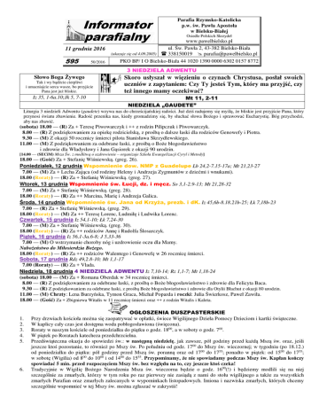 Parafia Rzymsko-Katolicka p.w. św. Pawła Apostoła w Bielsku-Białej Osiedle Polskich Skrzydeł 11 grudnia 2016 595 50/2016 www.pawelbielsko.pl ul. Św. Pawła 2, 43-382 Bielsko-Biała (ukazuje się od 4.09.2005) 338150019 [email protected] PKO BP/ I O Bielsko-Biała 44 1020 1390 0000 6302 0157 8772 3 NIEDZIELA ADWENTU Słowo Boga Żywego Tak i wy bądźcie cierpliwi i umacniajcie serca wasze, bo przyjście Pana jest już bliskie. Iz 35, 1-6a.10;Jk 5, 7-10 Skoro usłyszał w więzieniu o czynach Chrystusa, posłał swoich uczniów z zapytaniem: Czy Ty jesteś Tym, który ma przyjść, czy też innego mamy oczekiwać? Mt 11, 2-11 NIEDZIELA „GAUDETE” Liturgia 3 niedzieli Adwentu (gaudete) wzywa nas do chrześcijańskiej radości. Już dziś radujemy się myślą, że bliskie jest przyjście Pana, który przynosi światu zbawienie. Radość przenika nas, kiedy gromadzimy się, by słuchać słowa Bożego i sprawować Eucharystię. Bóg przychodzi, aby nas zbawić. (sobota) 18.00 — (R) Za + Teresę Piwowarczyk i ++ z rodzin Pilipczuk i Piwowarczyk. 8.00 — (R) Z podziękowaniem za opiekę rodzicielską, z prośbą o dalsze łaski dla rodziców Genowefy i Piotra. 9.30 — (M) Z okazji 50 rocznicy śmierci pilota Stanisława Skrzydlewskiego. 11.00 — (M) Z podziękowaniem za odebrane łaski, z prośbą o Boże błogosławieństwo i zdrowie dla Władysławy i Jana Gąsiorek z okazji 90 urodzin. [14.00 — (SECiM) Msza Św. z modlitwą o uzdrowienie – organizuje Szkoła Ewangelizacji Cyryl i Metody] 18.00 — (Gość) Za + Stefanię Wiśniewską. (greg. 26). Poniedziałek, 12 grudnia Wspomnienie dow. NMP z Guadelupe Lb 24,2-7.15-17a; Mt 21,23-27 7.00 — (M) Za + Lecha Zająca (od rodziny Heleny i Andrzeja Zygmuntów z dziećmi i wnukami). 18.00 (Roraty) — (R) Za + Stefanię Wiśniewską. (greg. 27). Wtorek, 13 grudnia Wspomnienie św. Łucji, dz. i męcz. So 3,1-2.9-13; Mt 21,28-32 7.00 — (M) Za + Stefanię Wiśniewską. (greg. 28). 18.00 (Roraty) — (R) Za ++ Marcina, Marię i Andrzeja Galica. Środa, 14 grudnia Wspomnienie św. Jana od Krzyża, prezb. i dK. Iz 45,6b-8.18.21b-25; Łk 7,18b-23 7.00 — (R) Za + Stefanię Wiśniewską. (greg. 29). 18.00 (Roraty) — (M) Za ++ Teresę Lorenc, Ludmiłę i Ludwika Lorenc. Czwartek, 15 grudnia Iz 54,1-10; Łk 7,24-30 7.00 — (M) Za + Stefanię Wiśniewską. (greg. 30). 18.00 (Roraty) — (R) Za ++ rodziców Annę i Rudolfa Ślosarczyk. Piątek, 16 grudnia Iz 56,1-3a.6-8; J 5,33-36 7.00 — (M) O wstrzymanie choroby nóg i uzdrowienie oczu dla Mamy. Nabożeństwo do Miłosierdzia Bożego. 18.00 (Roraty) — (R) Za ++ rodziców Walentego i Genowefę w 26 rocznicę śmierci. Sobota, 17 grudnia Rdz 49,2.8-10; Mt 1,1-17 7.00 (Roraty) — (R) Za + Vlada. Niedziela, 18 grudnia 4 NIEDZIELA ADWENTU Iz 7,10-14; Rz 1,1-7; Mt 1,18-24 (sobota) 18.00 — (M) Za + Romana Oberdak w 34 rocznicę śmierci. 8.00 — (R) Z podziękowaniem za odebrane łaski, z prośbą o Boże błogosławieństwo i zdrowie dla Felicyta Baca. 9.30 — (R) Z podziękowaniem za odebrane łaski, z prośbą Boże błogosławieństwo i zdrowie dla Otylii Błachut z okazji 80 urodzin. 11.00 — (M) Chrzty: Lena Burzyńska, Tymon Graca, Michał Poparda i roczki: Julia Świerkosz, Paweł Zawiła. 18.00 — (Gość) Za + Zbigniewa Witalis w 11 rocznicę śmierci oraz ++ z rodzin Witalis i Kaleta. 1. 2. 3. 4. 5. 6. OGŁOSZENIA DUSZPASTERSKIE Przy drzwiach kościoła można się zaopatrywać w opłatki, świece Wigilijnego Dzieła Pomocy Dzieciom i kartki świąteczne. W kaplicy cały czas jest dostępna woda pobłogosławiona (święcona). Roraty w naszym kościele od poniedziałku do piątku o godz. 1800, a w soboty o godz. 700. W piątek po Roratach katecheza przedchrzcielna. Przedświąteczna okazja do spowiedzi św.: w następną niedzielę, jak zawsze, pół godziny przed każdą Mszą św. oraz, jeśli jeszcze ktoś pozostanie, to również po Mszy św. Po południu od godz. 1700 do Mszy św. wieczornej; w tygodniu (po 18.12.) od poniedziałku do piątku: pół godziny przed Mszą św. poranną oraz od 1700 do 1755; ponadto w piątek: od 1500 do 1755; w sobotę (Wigilia) od 800 do 1000 i od 1400 do 1555. Przypominamy, że nie spowiadamy podczas Mszy św. Kapłan kończy spowiadać 5 min. przed rozpoczęciem Mszy św. bez względu na to, czy jeszcze ktoś czeka! Tradycyjnie w Wigilię Bożego Narodzenia Msza św. wieczorna będzie o godz. 1600(!) i będziemy modlili się na niej szczególnie za zmarłych, którzy w tym roku po raz pierwszy nie zasiądą z nami do stołu wigilijnego a także za wszystkich zmarłych Parafian oraz zmarłych zalecanych w wypominkach listopadowych. Imiona i nazwiska zmarłych, których chcemy szczególnie wspomnieć w tej Mszy św. można zgłaszać w zakrystii! DIAKONIA SPRZĄTANIA Dziękujemy mieszkańcom z ul. Trzech Diamentów (dawna Spadzista) za posprzątanie kościoła i ofiarę na kościół. Msza św. w ich intencji będzie sprawowana 29 stycznia o godz. 800. W najbliższą sobotę o posługę czystości prosimy mieszkańców z ul. Cieszyńskiej 250. PLAN ODWIEDZIN DUSZPASTERSKICH W NAJBLIŻSZYM CZASIE • Od 26.11. odwiedziny duszpasterskie! • Określenie: „od początku” lub „od końca” w przypadku bloku znaczy od pierwszej lub ostatniej klatki (NIE NUMERU MIESZKANIA!)! Gdy nic nie jest zaznaczone tzn. że od początku! • W czasie odwiedzin „kolędowych” nie będzie wystawienia Najśw. Sakr. w sobotę, i nabożeństwa popołudniowego w niedzielę! • W niektóre dni również kancelaria parafialna będzie nieczynna!!! • W kaplicy (lub w korytarzu przy zakrystii) cały czas jest dostępna woda pobłogosławiona (święcona). • Gdy ktoś nie może przyjąć kapłana w wyznaczonym terminie jest jeszcze „kolęda” dodatkowa 11 i 13 stycznia!!! Prosimy o zgłoszenia w zakrystii. • Przyjęcie księdza z „kolędą” jest aktem publicznego wyznania wiary, a zarazem czynnikiem budującym parafialną wspólnotę. 3 n