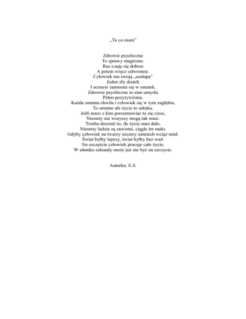 „To co mam” Zdrowie psychiczne To sprawy magiczne. Raz czuję się dobrze A potem wręcz odwrotnie. Człowiek ma swoją „szalupę” Jeden zły skutek I uczucie zamienia się w smutek. Zdrowie psychiczne to stan umysłu Pełen pozytywizmu. Każda smutna chwila i człowiek się w tym zagłębia, To smutne ale życie to udręka. Jeśli masz z kim porozmawiać to się ciesz, Niestety nie wszyscy mogą tak mieć. Trzeba docenić to, ile życie nam dało, Niestety ludzie są zawistni, ciągle im mało. Gdyby człowiek na twarzy szczery uśmiech wciąż miał, Świat byłby lepszy, świat byłby bez wad. Na szczęście człowiek pracuje całe życie, W ułamku sekundy może już nie być na szczycie. Autorka: E.S.