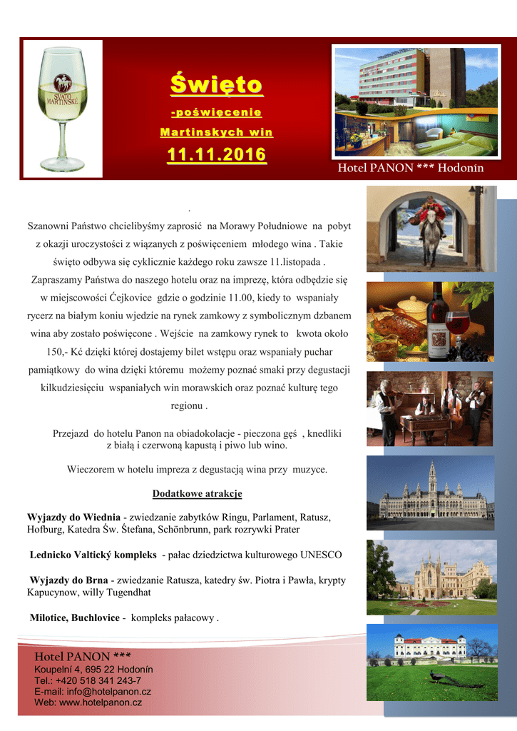 Święto -poświęcenie Martinskych win 11.11.2016 Hotel PANON *** Hodonín . Szanowni Państwo chcielibyśmy zaprosić na Morawy Południowe na pobyt z okazji uroczystości z wiązanych z poświęceniem młodego wina . Takie święto odbywa się cyklicznie każdego roku zawsze 11.listopada . Zapraszamy Państwa do naszego hotelu oraz na imprezę, która odbędzie się w miejscowości Ćejkovice gdzie o godzinie 11.00, kiedy to wspaniały rycerz na białym koniu wjedzie na rynek zamkowy z symbolicznym dzbanem wina aby zostało poświęcone . Wejście na zamkowy rynek to kwota około 150,- Kć dzięki której dostajemy bilet wstępu oraz wspaniały puchar pamiątkowy do wina dzięki któremu możemy poznać smaki przy degustacji kilkudziesięciu wspaniałych win morawskich oraz poznać kulturę tego regionu . Przejazd do hotelu Panon na obiadokolacje - pieczona gęś , knedlíki z białą i czerwoną kapustą i piwo lub wino. Wieczorem w hotelu impreza z degustacją wina przy muzyce. Dodatkowe atrakcje Wyjazdy do Wiednia - zwiedzanie zabytków Ringu, Parlament, Ratusz, Hofburg, Katedra Św. Śtefana, Schönbrunn, park rozrywki Prater Lednicko Valtický kompleks - pałac dziedzictwa kulturowego UNESCO Wyjazdy do Brna - zwiedzanie Ratusza, katedry św. Piotra i Pawła, krypty Kapucynow, willy Tugendhat Milotice, Buchlovice - kompleks pałacowy . Hotel PANON *** Koupelní 4, 695 22 Hodonín Tel.: +420 518 341 243-7 E-mail: [email protected] Web: www.hotelpanon.cz