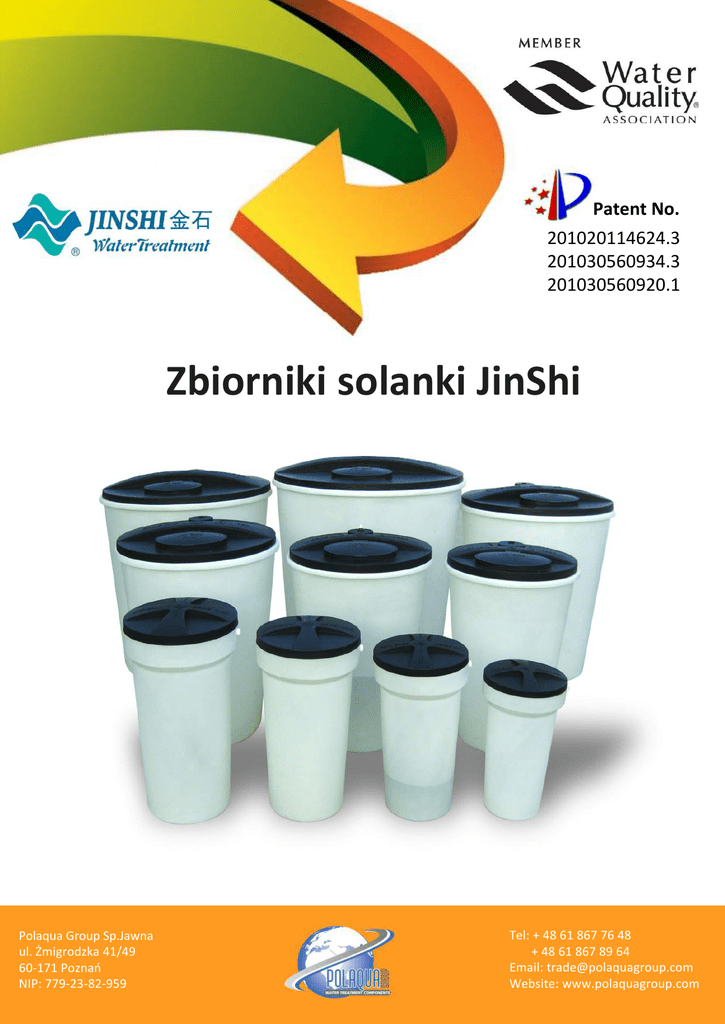 Patent No. 201020114624.3 201030560934.3 201030560920.1 Zbiorniki solanki JinShi Polaqua Group Sp.Jawna ul. Żmigrodzka 41/49 60-171 Poznań NIP: 779-23-82-959 Tel: + 48 61 867 76 48 + 48 61 867 89 64 Email: [email protected] Website: www.polaquagroup.com Specyfikacja Techniczna Innowacyjne okrągłe zbiorniki solanki firmy JinShi wykonane z bardzo solidnego materiału PEHD przeznaczone do magazynowania soli tabletkowej do stacji uzdatniania wody. Wszystkie zbiorniki wyposażone są w pływak antyzalaniowy oraz ruszt zapobiegający powstawaniu złogów solnych. Dodatkowo otwór znajdujący się w pokrywie zbiornika umożliwia szybkie i łatwe dosypywanie soli, a zastosowanie podwyższonej studni znacznie zwiększa wydajność produkcyjną solanki. Zbiorniki dostępne są w różnych wielkościach od 60 do 3000 litrów. Dzięki zastosowaniu stożkowej budowy, transport zbiorników jest tańszy jak również bardzo wygodny. Tabela wymiarów i pojemności Model Wymiary średnica x wysokość (mm) Pojemność (dm3) JS/Y-60 390×810 60 JS/Y-100 450×940 100 JS/Y-145 500×1060 145 JS/Y-200 550×1160 200 JS/Y-350 740×1275 350 JS/Y-500 840×1335 500 JS/Y-750 960×1395 750 JS/Y-1000 1080×1460 1000 JS/Y-1500 1240×1575 1500 JS/Y-2000 1360×1690 2000 JS/Y-3000 1595×1770 3000 Polaqua Group Sp.Jawna ul. Żmigrodzka 41/49 60-171 Poznań NIP: 779-23-82-959 Przekrój Zbiornika JinShi Pokrywa owalna Trzpień Zaślepka studni Pokrywa zbiornika Studnia Zbiornik solanki Platforma Nóżki platformy Tel: + 48 61 867 76 48 + 48 61 867 89 64 Email: [email protected] Website: www.polaquagroup.com Zalety zbiorników Łatwe uzupełnianie soli w zbiornikach od 350l Nowoczesny wygląd Ponacinana studnia Wnętrze zbiornika Ruszt zapobiegający powstawaniu złogów solnych Łatwy tani i wygodny transport Profesjonalne zawory solanki zastosowane w Zbiornikach Jin Shi JS/YF-454 do zbiorników 350l - 3000l Zawory solanki Jin Shi są połączeniem zaworu aircheck i zaworu poziomu cieczy. Poniżej przedstawiamy proces ich działania: 1. Proces pracy zaczyna się, gdy pływak jest ciągnięty w dół wskutek zasysania. W rezultacie tego zawór poziomu cieczy zostaje otwarty, a solanka zostaje zassana do zbiornika z żywicą w celu jej regeneracji. JS/YF-434H do zbiorników 145l - 200l JS/YF-434 do zbiorników 60l - 100l 2. Gdy cała objętość solanki zostanie zassana do zbiornika z żywicą, zawór powietrza zostanie automatycznie zamknięty, aby zapobiec dostaniu się powietrza do butli. 3. Kiedy proces regeneracji żywicy dobiegnie końca, do zbiornika solanki poprzez zawór zostanie dodana woda. W tym czasie zawór powietrza będzie otwarty. 4. Pływak uniesie się wraz z przybierającą wodą aż osiągnie ustawiony wcześniej poziom. Zawór poziomu cieczy dostanie impuls aby się zamknąć. W wyniku tego, woda przestanie napływać do zbiornika soli. 5. W tym momencie jeden cykl roboczy zostaje zakończony. Nowy cykl rozpocznie się gdy pływak zacznie ponownie opadać. Polaqua Group Sp.Jawna ul. Żmigrodzka 41/49 60-171 Poznań NIP: 779-23-82-959 Tel: + 48 61 867 76 48 + 48 61 867 89 64 Email: [email protected] Website: www.polaquagroup.com Design by K.G