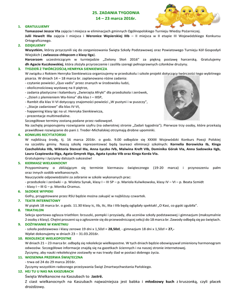 25. ZADANIA TYGODNIA 14 – 23 marca 2016r. 1. GRATULUJEMY Tomaszowi Jeszce VIa zajęcia I miejsca w eliminacjach gminnych Ogólnopolskiego Turnieju Wiedzy Pożarniczej. Julii Hewelt IIIa zajęcia I miejsca i Weronice Węsierskiej IIIb – II miejsca w II etapie III Wojewódzkiego Konkursu Ortograficznego. 2. DZIĘKUJEMY Wszystkim, którzy przyczynili się do zorganizowania Święta Szkoły Podstawowej oraz Powiatowego Turnieju Kół Gospodyń Wiejskich ( zwłaszcza chłopcom z klasy IIga). Harcerzom uczestniczącym w turniejadzie „Zielony Słoń 2016” za piękną postawę harcerską. Gratulujemy dh Agacie Kuczkowskiej, która złożyła przyrzeczenie i zasiliła szeregi pełnoprawnych członków drużyny. 3. TYDZIEŃ Z TWÓRCZOŚCIĄ HENRYKA SIENKIEWICZA W związku z Rokiem Henryka Sienkiewicza organizujemy w przedszkolu i szkole projekt dotyczący twórczości tego wybitnego pisarza. W dniach 14 – 18 marca br. zaplanowano różne zadania: - czytanie powieści „Quo vadis” przez znanych w środowisku ludzi, - okolicznościową wystawę na II piętrze, - zadania plastyczne i kalambury „Zwierzęta Afryki” dla przedszkola i zerówek, - „Dzień z plemieniem Wa-hima” dla klas I – IIISP, - Rambit dla klas V-VI dotyczący znajomości powieści „W pustyni i w puszczy”, - „Stacje zadaniowe” dla klas IV-VI, - happening klasy Igc na ul. Henryka Sienkiewicza, - prezentacje multimedialne. Szczegółowe terminy zostaną podane przez radiowęzeł. Na zachętę proponujemy rozwiązanie szyfru (na odwrotnej stronie „Zadań tygodnia”). Pierwsze trzy osoby, które przekażą prawidłowe rozwiązanie do pani J. Treder-Michalskiej otrzymają drobne upominki. 4. KONKURS RECYTATORSKI W najbliższą środę, tj. 16 marca 2016r. o godz. 9.00 odbędzie się XXXIII Wojewódzki Konkurs Poezji Polskiej na szczeblu gminy. Naszą szkołę reprezentować będą laureaci eliminacji szkolnych: Kornelia Borowicka Ib, Kinga Czecholińska IIIb, Wiktoria Stencel IIIa, Anna Łyczko IVb, Malwina Kreft VIb, Dominika Górak VIa, Anna Sadowska IIgb, Laura Czapiewska IIIga, Agata Gmyrek IIIga, Agata Łyczko VIb oraz Kinga Korda VIa. Gratulujemy i życzymy dalszych sukcesów! 5. KIERMASZ WIELKANOCNY Przypominamy o zbliżającym się terminie kiermaszu świątecznego (19-20 marca) i przynoszeniu palm oraz innych ozdób wielkanocnych. Nauczyciele odpowiedzialni za zebranie w szkole wykonanych prac: - przedszkole i zerówki – p. Wioleta Synak, klasy I – III SP – p. Mariola Kulwikowska, klasy IV – VI – p. Beata Szmidt - klasy I – III G – p. Monika Oramus. 6. SŁODKIE WYPIEKI Gofry, przygotowane przez RSU będzie można zakupić w najbliższy czwartek. 7. TEATR INTERNETOWY W piątek 18 marca br. o godz. 11.30 klasy Ic, IIb, IIc, IIIa i IIIb będą oglądały spektakl „O Kasi, co gąski zgubiła”. 8. TRIATHLON Sekcja sportowa ogłasza triathlon: brzuszki, pompki i przysiady, dla uczniów szkoły podstawowej i gimnazjum (maksymalnie 2 osoby z klasy). Chętni proszeni są o zgłoszenie się do przewodniczącej sekcji do 18 marca br. Zawody odbędą się po świętach. 9. DOŻYWIANIE W KWIETNIU - szkoła podstawowa i klasy zerowe 19 dni x 1,50zł = 28,50zł, - gimnazjum 18 dni x 1,50zł = 27,Wpłat dokonujemy w dniach 23 – 31.03.2016r. 10. REKOLEKCJE WIELKOPOSTNE W dniach 21 – 23 marca br. odbędą się rekolekcje wielkopostne. W tych dniach będzie obowiązywał zmieniony harmonogram odwozów. Szczegółowe informacje znajdą się na gazetkach ściennych i na naszej stronie internetowej. Życzymy, aby nauki rekolekcyjne zostawiły w nas trwały ślad w postaci dobrego życia. 11. WIOSENNA PRZERWA ŚWIĄTECZNA - trwa od 24 do 29 marca 2016r. Życzymy wszystkim radosnego przeżywania Świąt Zmartwychwstania Pańskiego. 12. HEJ TU U NAS NA KASZUBACH Święta Wielkanocne na Kaszubach to Jastrë. Z ciast wielkanocnych na Kaszubach najważniejsza jest babka i młodzowy kuch z kruszonką, czyli placek drożdżowy.