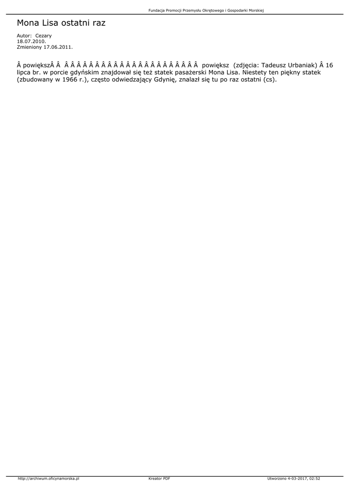 Fundacja Promocji Przemysłu Okrętowego i Gospodarki Morskiej Mona Lisa ostatni raz Autor: Cezary 18.07.2010. Zmieniony 17.06.2011.  powiększ                        powiększ (zdjęcia: Tadeusz Urbaniak)  16 lipca br. w porcie gdyńskim znajdował się też statek pasażerski Mona Lisa. Niestety ten piękny statek (zbudowany w 1966 r.), często odwiedzający Gdynię, znalazł się tu po raz ostatni (cs). http://archiwum.oficynamorska.pl Kreator PDF Utworzono 4-03-2017, 02:52