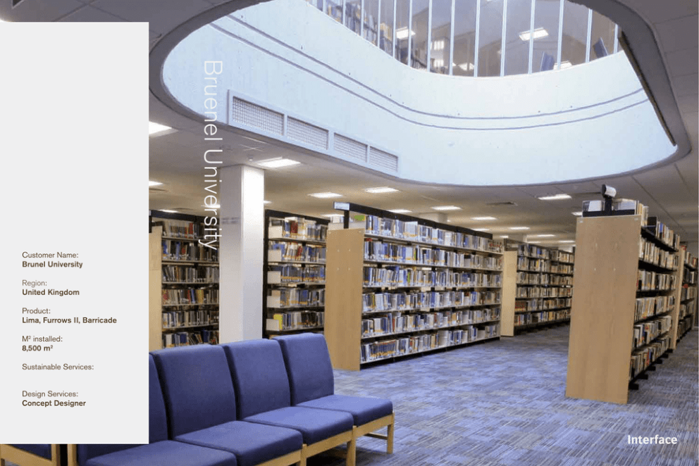Region: United Kingdom Product: Lima, Furrows II, Barricade M2 installed: 8,500 m2 Sustainable Services: Design Services: Concept Designer Bruenel University Customer Name: Brunel University personel i studentów o rozlanie najróżniejszych substancji na płytkach. Następnie Interface przystąpiła do usuwania plam, by dowieść trwałości wykładziny. Ann Cummings, Dyrektor ds. Administracyjnych Biblioteki na Uniwersytecie Brunela, powiedziała: “Wszyscy byliśmy zaskoczeni jak ładnie i jak łatwo zeszły plamy z wykładziny. To bardzo podbudowujące, że niezależnie od tego, jak dużo korzysta się z biblioteki, przez długi czas zachowa ona czysty i świeży wygląd.” Hannah stwierdziła: „Jednym z elementów założeń projektowych była modernizacja wnętrza biblioteki, dlatego wybraliśmy produkty w różnych odcieniach niebieskiego, by nadać jej świeższy wygląd. Wybranych produktów użyto razem w systemie zwanym przez nas Design by Tile, gdzie łączymy ze sobą różne produkty by stworzyć niepowtarzalny projekt. Metoda ta pozwala nam malować kształty i wzory na podłodze, gwarantując niepowtarzalny, nowoczesny wygląd.” Uniwersytet Brunela w Uxbridge ostatnio odsłonił światu swoją bibliotekę, zachwycającą nowym wyglądem dzięki liderowi w branży wykładzin na świecie, firmie Interface. Podczas remontu 8.500 m2 powierzchni użyto produktów tej właśnie firmy by poprawić jakość miejsca do nauki dla 15.000 studentów uniwersytetu, cieszącego się opinią instytucji na światowym poziomie. Założenia projektowe wymagały rozwiązania „na miarę”, łączącego wzornictwo z trwałością. Hannah Harper, projektant firmy Interface i autor projektu wnętrza powiedziała: „Oprócz stworzenia projektu na miarę, nadającego jakże niezbędny, świeży charakter dotychczasowemu wnętrzu, musieliśmy wybrać produkty o trwałości odpowiedniej dla budynku uniwersyteckiego. Ponieważ biblioteka jest stale w użyciu, istotnym było, by wybrane produkty kamuflowały skutki dużego ruchu i by łatwo się je czyściło.” By zademonstrować trwałość produktów wybranych do tego projektu, firma Interface rozłożyła próbki wykładzin a następnie poprosiła Interface użyła m.in. płytek wykładzinowych Lima. Płytki Lima pokryły większą część powierzchni podłogi z uwagi na ich szczególną trwałość i walory użytkowe, a dzięki błękitom i szarościom wybranym przez Hannah powstał nowoczesny wzór sprzyjający wycieszeniu się i skupieniu. Płytek Furrows o pętelkowym wzorze, ciekawej teksturze i bardziej masywnym wyglądzie, użyto by nadać pewien akcent kawiarni i miejscom, gdzie można usiąść i odpocząć. Na wejście i do recepcji wybrano Barricade, bardziej funkcjonalny typ wykładziny. Płytki te pozwalają dłużej zachować czystość obszarów, gdzie panuje duży ruch, wychwytując bród, który w przeciwnym razie zostałby rozniesiony po całej wykładzinie. Biblioteka po remoncie otworzyła swoje podwoje dla studentów. Ann mówi: „Jesteśmy zachwyceni nowym wnętrzem i słyszeliśmy wiele pozytywnych opinii zarówno od pracowników, jak i studentów. Dzięki płytkom wykładzinowym biblioteka zyskała nowy wygląd, a mimo, że są nowoczesne, nie podążają zbytnio za modą więc zbyt szybko się nie zestarzeją. Teraz biblioteka jest o wiele jaśniejsza a projekt dużo lepiej pasuje do tak renomowanej instytucji, jaką jest Uniwersytet Brunela.” „Jesteśmy zachwyceni nowym wnętrzem i słyszeliśmy wiele pozytywnych opinii zarówno od pracowników, jak i studentów.” Ann Cummings, Library Services Director, Brunel University