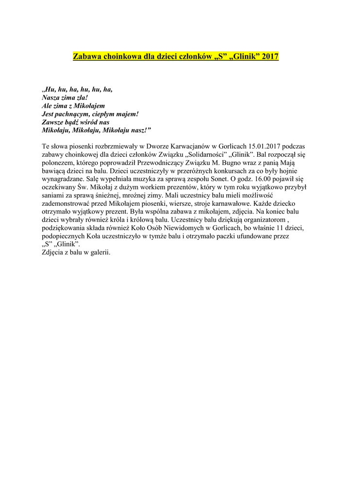 Zabawa choinkowa dla dzieci członków „S” „Glinik” 2017 „Hu, hu, ha, hu, hu, ha, Nasza zima zła! Ale zima z Mikołajem Jest pachnącym, ciepłym majem! Zawsze bądź wśród nas Mikołaju, Mikołaju, Mikołaju nasz!” Te słowa piosenki rozbrzmiewały w Dworze Karwacjanów w Gorlicach 15.01.2017 podczas zabawy choinkowej dla dzieci członków Związku „Solidarności” „Glinik”. Bal rozpoczął się polonezem, którego poprowadził Przewodniczący Związku M. Bugno wraz z panią Mają bawiącą dzieci na balu. Dzieci uczestniczyły w przeróżnych konkursach za co były hojnie wynagradzane. Salę wypełniała muzyka za sprawą zespołu Sonet. O godz. 16.00 pojawił się oczekiwany Św. Mikołaj z dużym workiem prezentów, który w tym roku wyjątkowo przybył saniami za sprawą śnieżnej, mroźnej zimy. Mali uczestnicy balu mieli możliwość zademonstrować przed Mikołajem piosenki, wiersze, stroje karnawałowe. Każde dziecko otrzymało wyjątkowy prezent. Była wspólna zabawa z mikołajem, zdjęcia. Na koniec balu dzieci wybrały również króla i królową balu. Uczestnicy balu dziękują organizatorom , podziękowania składa również Koło Osób Niewidomych w Gorlicach, bo właśnie 11 dzieci, podopiecznych Koła uczestniczyło w tymże balu i otrzymało paczki ufundowane przez „S” „Glinik”. Zdjęcia z balu w galerii.