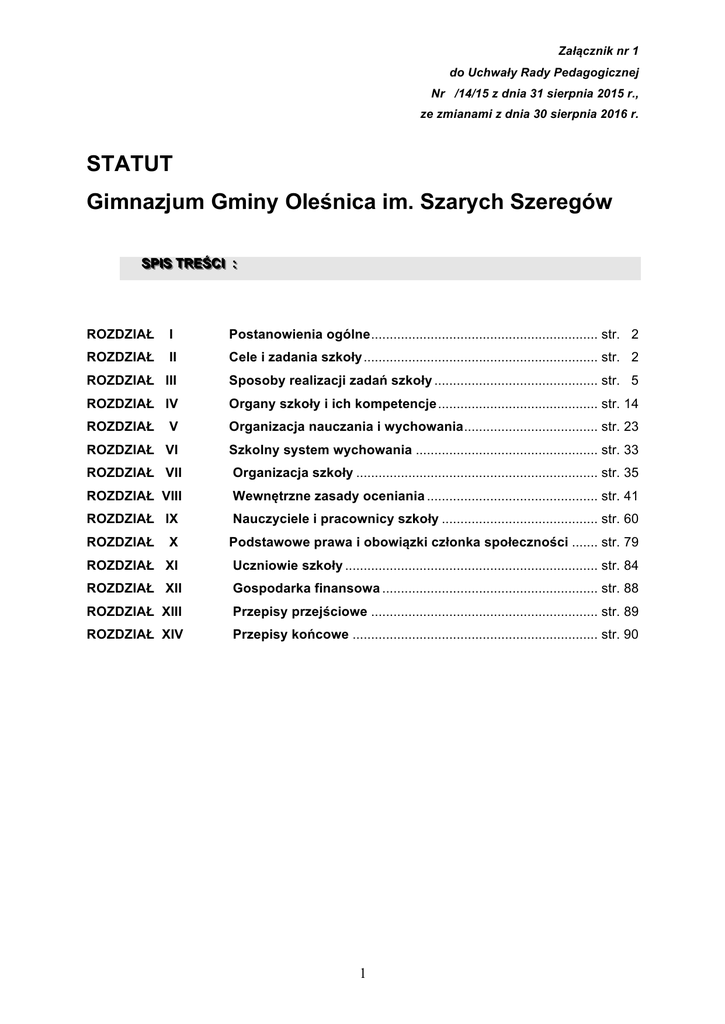 Załącznik nr 1 do Uchwały Rady Pedagogicznej Nr /14/15 z dnia 31 sierpnia 2015 r., ze zmianami z dnia 30 sierpnia 2016 r. STATUT Gimnazjum Gminy Oleśnica im. Szarych Szeregów SSPPIISS TTR REEŚŚC CII :: ROZDZIAŁ I Postanowienia ogólne ............................................................. str. 2 ROZDZIAŁ II Cele i zadania szkoły ............................................................... str. 2 ROZDZIAŁ III Sposoby realizacji zadań szkoły ............................................ str. 5 ROZDZIAŁ IV Organy szkoły i ich kompetencje ........................................... str. 14 ROZDZIAŁ V Organizacja nauczania i wychowania .................................... str. 23 ROZDZIAŁ VI Szkolny system wychowania ................................................. str. 33 ROZDZIAŁ VII Organizacja szkoły ................................................................. str. 35 ROZDZIAŁ VIII Wewnętrzne zasady oceniania .............................................. str. 41 ROZDZIAŁ IX Nauczyciele i pracownicy szkoły .......................................... str. 60 ROZDZIAŁ X Podstawowe prawa i obowiązki członka społeczności ....... str. 79 ROZDZIAŁ XI Uczniowie szkoły .................................................................... str. 84 ROZDZIAŁ XII Gospodarka finansowa .......................................................... str. 88 ROZDZIAŁ XIII Przepisy przejściowe ............................................................. str. 89 ROZDZIAŁ XIV Przepisy końcowe .................................................................. str. 90 1 ROZDZIAŁ I Postanowienia ogólne § 1. 1 Gimnazjum Gminy Oleśnica zwane dalej szkołą jest placówką publiczną. 1) prowadzi bezpłatne nauczanie i wychowanie w zakresie co najmniej podstawy programowej kształcenia ogólnego; 2) Gimnazjum przeprowadza rekrutację dzieci w oparciu o zasadę powszechnej dostępności; 3) zatrudnia nauczycieli posiadających kwalifikacje określone w odrębnych przepisach. 2. Siedzibą szkoły jest budynek przy ulicy Wileńskiej 32 w Oleśnicy. 3. Organem prowadzącym jest Gmina Oleśnica. 4. Nadzór pedagogiczny nad szkołą sprawuje Dolnośląski Kurator Oświaty. 5. Gimnazjum Gminy Oleśnica używa nazwy: Gimnazjum Gminy Oleśnica im. Szarych Szeregów w Oleśnicy. 6. Ustalona nazwa używana jest w pełnym brzmieniu. 7. Gimnazjum jest jednostką budżetową. ROZDZIAŁ II Cele i zadania szkoły § 2. Szkoła realizuje cele i zadania określone w Ustawie o systemie oświaty oraz w przepisach wydanych na jej podstawie. § 3. Szkoła opracowała Misję Szkoły i Wizję Szkoły. Stanowią one integralną cześć oferty edukacyjnej, a osiągnięcie zawartych w nich założeń jest jednym z głównych celów Szkoły. § 4. MISJA SZKOŁY Nasze działania skupione są wokół stworzenia szkoły bezpiecznej, otwartej i przyjaznej. Naszym celem jest wychowanie i wykształcenie absolwenta będącego człowiekiem prawym, posiadającym rzetelną wiedzę i umiejętności, wrażliwego na drugiego człowieka oraz przygotowanego do mądrego i godnego życia w Polsce i Europie. § 5. Model absolwenta Gimnazjum Gminy Oleśnica Absolwent naszego gimnazjum będzie: 1) wyposażony w gruntowną wiedzę ogólną, umożliwiającą podjęcie nauki na wyższym etapie kształcenia, 2) umiał planować, organizować i oceniać własne uczenie się, 3) dbał o kulturę języka pisanego i mówionego, 4) szanował tradycję i kulturę własnego narodu, 2 5) tolerancyjny wobec innych kultur i tradycji, 6) efektywnie współdziałał w zespole, 7) miał poczucie własnej wartości i szacunek dla innych ludzi, 8) znał 2 języki obce (jeden w stopniu podstawowym, drugi w rozszerzonym) 9) przygotowany do życia w zjednoczonej Europie 10) posiadał wiedzę i umiejętności związane ze zdrowymi stylami życia, profilaktyką uzależnień, 11) miał świadomość ekologiczną i rozumiał sens słów: „Ziemi nie odziedziczyliśmy po naszych przodkach ale pożyczyliśmy ją od naszych dzieci” 12) właściwie odbierał i wykorzystywał media 13) przygotowany do wyszukiwania, porządkowania i wykorzystywania informacji z różnych źródeł z zastosowaniem technologii informacyjnej 14) człowiekiem kulturalnym, uczciwym, wiarygodnym, odpowiedzialnym, wytrwałym, kreatywnym, przedsiębiorczym. § 6. Głównym celem i zadaniem Szkoły jest dbałość o wszechstronny rozwój uczniów. 1. Cele i zadania Szkoły wynikają z przepisów prawa oraz uwzględniają Program Wychowawczy i Program Profilaktyki dostosowany do potrzeb rozwojowych uczniów oraz potrzeb danego środowiska, o których mowa w odrębnych przepisach 2. W szczególności Szkoła: 1) umożliwia zdobycie wiedzy ogólnej, zgodnie z aktualnym stanem nauki, na wysokim poziomie merytorycznym określonym w dokumentacji programowej Szkoły; 2) zapewnia uczniom bogaty, autorski program wychowawczy i stwarza środowisko wychowawcze sprzyjające rozwojowi własnych zainteresowań; 3) z należytą troską dba o rozwój umysłowy, moralno - emocjonalny i fizyczny uczniów, między innymi poprzez: a) organizowanie różnorodnych imprez kulturalnych, artystycznych, działalności turystyczno- krajoznawczej; b) stawianie wysokich wymagań dotyczących kultury bycia; c) przekazywanie wiedzy i kształcenie umiejętności funkcjonowania w rodzinie i środowisku, państwie, narodzie i społeczeństwie; d) zapewnianie poszanowania uczniom, ich godności osobistej, wolności światopoglądowej i wyznaniowej; e) umożliwianie podtrzymania poczucia tożsamości narodowej, etnicznej dalszego kierunku i językowej. 4) umożliwia absolwentom dokonanie świadomego kształcenia; 3 wyboru 5) kształci w duchu tolerancji, humanizmu i patriotyzmu, przekazuje wiedzę o społeczeństwie, problemach społecznych, ekonomicznych kraju, świata, kulturze i środowisku naturalnym; 6) kształtuje i rozwija wśród uczniów cechy osobowości: przedsiębiorczość, kreatywność, s