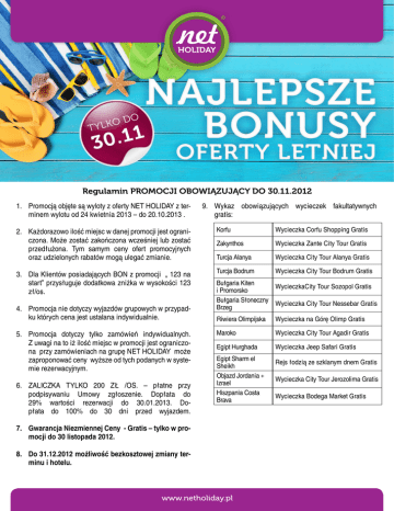 Regulamin PROMOCJI OBOWIĄZUJĄCY DO 30.11.2012 1. Promocją objęte są wyloty z oferty NET HOLIDAY z terminem wylotu od 24 kwietnia 2013 – do 20.10.2013 . 9. Wykaz obowiązujących wycieczek fakultatywnych gratis: 2. Każdorazowo ilość miejsc w danej promocji jest ograniczona. Może zostać zakończona wcześniej lub zostać przedłużona. Tym samym ceny ofert promocyjnych oraz udzielonych rabatów mogą ulegać zmianie. Korfu Wycieczka Corfu Shopping Gratis Zakynthos Wycieczka Zante City Tour Gratis Turcja Alanya Wycieczka City Tour Alanya Gratis 3. Dla Klientów posiadających BON z promocji „ 123 na start” przysługuje dodatkowa zniżka w wysokości 123 zł/os. Turcja Bodrum Wycieczka City Tour Bodrum Gratis 4. Promocja nie dotyczy wyjazdów grupowych w przypadku których cena jest ustalana indywidualnie. 5. Promocja dotyczy tylko zamówień indywidualnych. Z uwagi na to iż ilość miejsc w promocji jest ograniczona przy zamówieniach na grupę NET HOLIDAY może zaproponować ceny wyższe od tych podanych w systemie rezerwacyjnym. 6. ZALICZKA TYLKO 200 ZŁ /OS. – płatne przy podpisywaniu Umowy zgłoszenie. Dopłata do 29% wartości rezerwacji do 30.01.2013. Dopłata do 100% do 30 dni przed wyjazdem. Bułgaria Kiten WycieczkaCity Tour Sozopol Gratis i Promorsko Bułgaria Słoneczny Wycieczka City Tour Nessebar Gratis Brzeg Riwiera Olimpijska Wycieczka na Górę Olimp Gratis Maroko Wycieczka City Tour Agadir Gratis Egipt Hurghada Wycieczka Jeep Safari Gratis Egipt Sharm el Sheikh Objazd Jordania + Izrael Hiszpania Costa Brava 7. Gwarancja Niezmiennej Ceny - Gratis – tylko w promocji do 30 listopada 2012. 8. Do 31.12.2012 możliwość bezkosztowej zmiany terminu i hotelu. www.netholiday.pl Rejs łodzią ze szklanym dnem Gratis Wycieczka City Tour Jerozolima Gratis Wycieczka Bodega Market Gratis