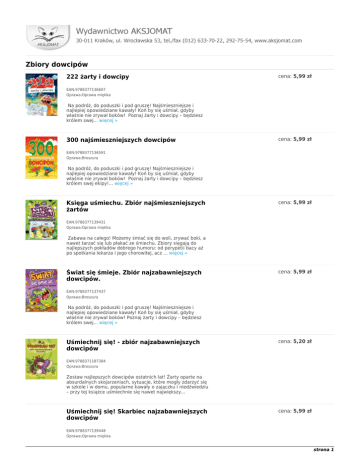 Zbiory dowcipów 222 żarty i dowcipy cena: 5,99 zł EAN:9788377136607 Oprawa:Oprawa miękka Na podróż, do poduszki i pod gruszę! Najśmieszniejsze i najlepiej opowiedziane kawały! Koń by się uśmiał, gdyby właśnie nie zrywał boków! Poznaj żarty i dowcipy – będziesz królem swej... więcej » 300 najśmieszniejszych dowcipów cena: 5,99 zł EAN:9788377136591 Oprawa:Broszura Na podróż, do poduszki i pod gruszę! Najśmieszniejsze i najlepiej opowiedziane kawały! Koń by się uśmiał, gdyby właśnie nie zrywał boków! Poznaj żarty i dowcipy – będziesz królem swej ekipy!... więcej » Księga uśmiechu. Zbiór najśmieszniejszych żartów cena: 5,99 zł EAN:9788377139431 Oprawa:Oprawa miękka Zabawa na całego! Możemy śmiać się do woli, zrywać boki, a nawet tarzać się lub płakać ze śmiechu. Zbiory sięgają do najlepszych pokładów dobrego humoru: od perypetii bacy aż po spotkania lekarza i jego chorowitej, acz ... więcej » Świat się śmieje. Zbiór najzabawniejszych dowcipów. cena: 5,99 zł EAN:9788377137437 Oprawa:Broszura Na podróż, do poduszki i pod gruszę! Najśmieszniejsze i najlepiej opowiedziane kawały! Koń by się uśmiał, gdyby właśnie nie zrywał boków! Poznaj żarty i dowcipy – będziesz królem swej... więcej » Uśmiechnij się! - zbiór najzabawniejszych dowcipów cena: 5,20 zł EAN:9788371187384 Oprawa:Broszura Zestaw najlepszych dowcipów ostatnich lat! Żarty oparte na absurdalnych skojarzeniach, sytuacje, które mogły zdarzyć się w szkole i w domu, popularne kawały o zajączku i niedźwiedziu – przy tej książce uśmiechnie się nawet największy... Uśmiechnij się! Skarbiec najzabawniejszych dowcipów cena: 5,99 zł EAN:9788377139448 Oprawa:Oprawa miękka strona 1 Zabawa na całego! Możemy śmiać się do woli, zrywać boki, a nawet tarzać się lub płakać ze śmiechu. Zbiory sięgają do najlepszych pokładów dobrego humoru: od perypetii bacy aż po spotkania lekarza i jego chorowitej, acz... Wielka księga żartów cena: 5,99 zł EAN:9788377137444 Oprawa:Oprawa miękka Na podróż, do poduszki i pod gruszę! Najśmieszniejsze i najlepiej opowiedziane kawały! Koń by się uśmiał, gdyby właśnie nie zrywał boków! Poznaj żarty i dowcipy – będziesz królem swej... więcej » Powyższa lista nie stanowi oferty w rozumieniu prawa. Ceny mogą zawierać rabaty dla zalogowanego użytkownika. Data wygenerowania: 04.03.2017 02:52:22. strona 2