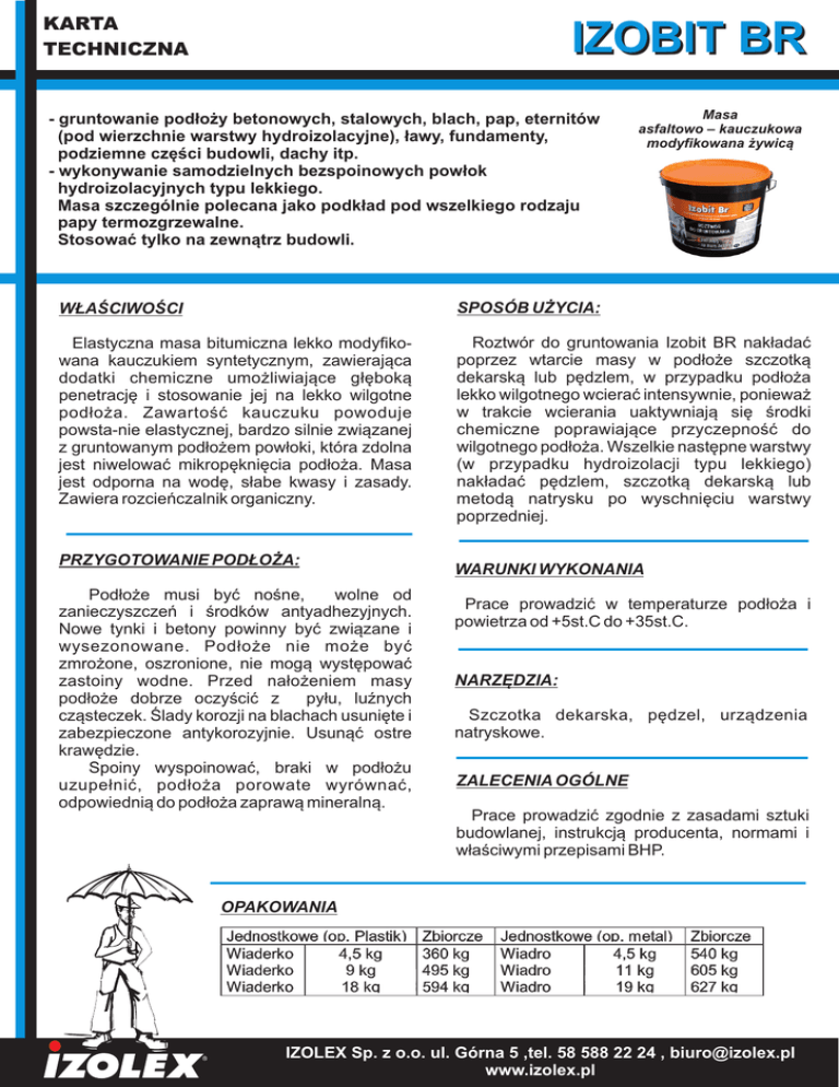KARTA TECHNICZNA IZOBIT BR - gruntowanie pod³o¿y betonowych, stalowych, blach, pap, eternitów (pod wierzchnie warstwy hydroizolacyjne), ³awy, fundamenty, podziemne czêœci budowli, dachy itp. - wykonywanie samodzielnych bezspoinowych pow³ok hydroizolacyjnych typu lekkiego. Masa szczególnie polecana jako podk³ad pod wszelkiego rodzaju papy termozgrzewalne. Stosowaæ tylko na zewn¹trz budowli. Masa asfaltowo – kauczukowa modyfikowana ¿ywic¹ W£AŒCIWOŒCI SPOSÓB U¯YCIA: Elastyczna masa bitumiczna lekko modyfikowana kauczukiem syntetycznym, zawieraj¹ca dodatki chemiczne umo¿liwiaj¹ce g³êbok¹ penetracjê i stosowanie jej na lekko wilgotne pod³o¿a. Zawartoœæ kauczuku powoduje powsta-nie elastycznej, bardzo silnie zwi¹zanej z gruntowanym pod³o¿em pow³oki, która zdolna jest niwelowaæ mikropêkniêcia pod³o¿a. Masa jest odporna na wodê, s³abe kwasy i zasady. Zawiera rozcieñczalnik organiczny. Roztwór do gruntowania Izobit BR nak³adaæ poprzez wtarcie masy w pod³o¿e szczotk¹ dekarsk¹ lub pêdzlem, w przypadku pod³o¿a lekko wilgotnego wcieraæ intensywnie, poniewa¿ w trakcie wcierania uaktywniaj¹ siê œrodki chemiczne poprawiaj¹ce przyczepnoœæ do wilgotnego pod³o¿a. Wszelkie nastêpne warstwy (w przypadku hydroizolacji typu lekkiego) nak³adaæ pêdzlem, szczotk¹ dekarsk¹ lub metod¹ natrysku po wyschniêciu warstwy poprzedniej. PRZYGOTOWANIE POD£O¯A: Pod³o¿e musi byæ noœne, wolne od zanieczyszczeñ i œrodków antyadhezyjnych. Nowe tynki i betony powinny byæ zwi¹zane i wysezonowane. Pod³o¿e nie mo¿e byæ zmro¿one, oszronione, nie mog¹ wystêpowaæ zastoiny wodne. Przed na³o¿eniem masy pod³o¿e dobrze oczyœciæ z py³u, luŸnych cz¹steczek. Œlady korozji na blachach usuniête i zabezpieczone antykorozyjnie. Usun¹æ ostre krawêdzie. Spoiny wyspoinowaæ, braki w pod³o¿u uzupe³niæ, pod³o¿a porowate wyrównaæ, odpowiedni¹ do pod³o¿a zapraw¹ mineraln¹. WARUNKI WYKONANIA Prace prowadziæ w temperaturze pod³o¿a i powietrza od +5st.C do +35st.C. NARZÊDZIA: Szczotka dekarska, pêdzel, urz¹dzenia natryskowe. ZALECENIA OGÓLNE Prace prowadziæ zgodnie z zasadami sztuki budowlanej, instrukcj¹ producenta, normami i w³aœciwymi przepisami BHP. OPAKOWANIA IZOLEX Sp. z o.o. ul. Górna 5 ,tel. 58 588 22 24 , [email protected] www.izolex.pl DANE TECHNICZNE: - barwa - gruboœæ pojedynczej warstwy - czas schniêcia warstwy - iloœæ warstw - pozosta³oœæ suchej masy - zu¿ycie - temperatura pod³o¿a i powietrza podczas stosowania - metoda nak³adania - warunki przechowywania i transportu - okres przydatnoœci (od daty produkcji) - mycie narzêdzi - referencje czarna 0,2 – 0,3 mm dla hydroizolacji lekkiej py³osuchoœæ: 6 godzin suchoœæ w³aœciwa: 12 godzin gruntowanie: 1 pow³oki hydroizolacyjne typu lekkiego: 3 oko³o 60% 2 0,2 – 0,3 kg/m /warstwê 0 +5 - +35 C pêdzel, szczotka, natrysk 0 w suchych i ch³odnych pomieszczeniach, w temperaturze powy¿ej +5 C do 12 miesiêcy benzyna lakowa, rozpuszczalnik organiczny PN-B 24620:1998/Az1:2004 UWAGI: PRZECHOWYWANIE Dane techniczne i informacje o sposobie stosowania podane s¹ dla temperatury 23st.C ± 2st.C. W innych warunkach czas schniêcia mo¿e ulec zmianie. Izobit BR zawiera rozcieñczalnik organiczny, podczas stosowania przestrzegaæ stosownych przepisów BHP. W szczególnoœci zadbaæ o bardzo intensywne przewietrzanie miejsca wykonywania robót. Nie stosowaæ wewn¹trz budynków. Produkt chroniæ przed dzieæmi. W razie zabrudzenia oczu nale¿y natychmiast przemyæ je du¿¹ iloœci¹ wody i skontaktowaæ siê z lekarzem. Producent nie odpowiada za szkody wynik³e z nieumiejêtnego lub niezgodnego z przeznaczeniem u¿ycia wyrobu. Przechowywaæ w ch³odnym i suchym pomieszczeniu. Produkt nie jest wra¿liwy na temperatury ujemne. Niniejsza karta techniczna produktu jest obowi¹zuj¹ca i zastêpuje wszystkie poprzednie. Wyrób dopuszczony do obrotu i powszechnego stosowania w budownictwie. Skarszewy, dnia 21.03.2011. IZOLEX Sp. z o.o. ul. Górna 5 ,tel. 58 588 22 24 , [email protected] www.izolex.pl