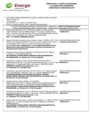 Ogłoszenie o wyniku przetargów na wykonanie projektów budowlano-wykonawczych ENERGA – OPERATOR SA. Oddział w Koszalinie Zamawiający: ENERGA-OPERATOR SA z siedzibą w Gdańsku Oddział w Koszalinie adres: ul. Morska 10, 75-950 Koszalin NIP 583-000-11-90; REGON: 190275904-00050 internet: energa-operator.pl e-mail : [email protected] 1 W wyniku rozstrzygnięć przetargów zamieszczonych w ogłoszeniu nr 290/P/16/Oddział Koszalin wybrano najkorzystniejsze oferty z cenami brutto – złożone przez następujących Wykonawców: Budowa linii kablowej 15 kV nr 627/10 na odcinku od mufy na kablu ZN/2233/505MZI/2016/16236 wyprowadzonym ze stacji 30088 Gołogóra TV do nowo projektowanego 31980,00 zł. słupa w odcinku linii napowietrznej 15 kV nr 627/007/03 (przęsło od słupa nr 6 do 7) w m. Gołogóra, gm. Polanów OBMBS/53/16236 PRO - EL POPIEL MARIUSZ Koszalin 2 Zegrze Pomorskie Świeszyno gmina wiejska nr dział.: 320908_2.0077-43/41 ZN/2234/505MZI/2016/16258 Wymiana linii kablowej SN15kV nr 313 od st 31197 Zegrze ST1 do slupa nr przetarg unieważniony 17 linii napow.15kV nr 313 w m. Zegrze Pomorskie gm Swiszyno Art. 16 pkt 2 ust 1 Regulaminu - cena najkorzystniejszej oferty przekracza kwotę jaka Zamawiający zamierza przeznaczyć na sfinansowanie Zamówienia 3 Wykonanie dokumentacji projektowej na przyłączenie hotelu "Baltivia", m. Mielno ul. Cicha OBI/53/1601104 SEP ODDZIAŁ KOSZALIŃSKI OŚRODEK RZECZOZNAWSTWA W KOSZALINIE, ul. Morska 10, 75-221 Koszalin 4 Wymiana linii kablowej 15kV od stacji transformatorowej 15kV nr ZN/2236/505MZI/2016/16267 30305"Bonin Kotłownia I" do stacji transformatorowej 15kV nr 31101 "Bonin 8548,50 zł. Kotłownia II" w miejscowości Bonin, gm.Manowo. OBMBS/53/16267 ENERGIA Projektowanie Group Sp. z o.o., ul. Otolińska 27c, 09-400 Płock 5 Przebudowa napowietrznego odg. linii SN 373 kier. st. tr. Hibnera Garaże wraz z powiązaniem z linią SN nr 332 w m. Koszalin OBMBS/53/16301 STOWARZYSZENIE ELEKTRYKÓW POLSKICH ODDZIAŁ KOSZALIŃSKI OŚRODEK RZECZOZNAWSTWA W KOSZALINIE, ul. Morska 10, 75-221 Koszalin ZN/2237/505MZI/2016/16301 35793,00 zł. 6 Koszalin Koszalin gmina miejska ul. Szczecińska Modernizacja linii SN 392 w zakresie zasilania stacji transformatorowej nr 31439 Szczecińska Makro w miejscowosci Koszalin OBMBS/53/16302 SEP ODDZIAŁ KOSZALIŃSKI OŚRODEK RZECZOZNAWSTWA W KOSZALINIE, ul. Morska 10, 75-221 Koszalin ZN/2238/505MZI/2016/16302 8007,30 zł. 7 Wymiana linii kablowej SN 15 kV nr 387 Bonin Przechowalnia Ziemniaka do linii napowietrznej15 kV nr 304 w m. Bonin gm. Manowo OBMBS/53/16303 ENERGIA Projektowanie Group Sp. z o.o., ul. Otolińska 27c, 09-400 Płock ZN/2239/505MZI/2016/16303 9963,00 zł. 8 Modernizacja linii SN nr 601 w zakresie zasilaniastacji tr. nr 30157 Darłówko ZN/2240/505MZI/2016/16304 Poldan i st tr. nr. 30103 Darłówko Agromet w miejscowosci Darłówko 10467,30 zł. OBMBS/53/16304 SEP ODDZIAŁ KOSZALIŃSKI OŚRODEK RZECZOZNAWSTWA W KOSZALINIE, ul. Morska 10, 75-221 Koszalin ZN/2235/505MZI/2016/1601104 8733,00 zł. Ogłoszenie o wyniku przetargów na wykonanie projektów budowlano-wykonawczych ENERGA – OPERATOR SA. Oddział w Koszalinie 9 Budowa linii kablowej 15kV w zamian linii napowietrznej 15kV nr 147/000 ZN/2241/505MZI/2016/15776 „Połczyn - Grzmiąca (kołacz Tartak)” na odcinku od „GPZ Połczyn Zdrój” do 34317,00 zł. istniejącego kabla 15kV nr 147/000/09 oraz przebudowa stacji transformatorowych 15/0,4kV nr 10629 „Dziwogóra Połczyńska” i nr 10911 „Połczyn Baseny”, gm. Połczyn - Zdrój OBMBS/51/15776 ENERGIA Projektowanie Group Sp. z o.o., ul. Otolińska 27c, 09-400 Płock 10 Przyłączenie obiektu magazynowo - biurowego w miejscowości Stojkowo 8, ZN/2242/505MZI/2016/1600753 dz. nr 207, gmina Dygowo OBI/55/1600753 15276,60 zł. ENERGIA Projektowanie Group Sp. z o.o., ul. Otolińska 27c, 09-400 Płock 11 Budowa słupowej stacji transformatorowej 15/0,4 kV typu STSku 20/250 ZN/2243/505MZI/2016/16266 stara Korytnica nr T520508 odg. z magistrali linii 15 kV nr 255 oraz powiązań 12100,00 zł. 0,4 kV OBMBS/52/16266 3 PROJEKTY NORBERT KUNDERA ul. Królewiecka 21, 78-500 Drawsko Pomorskie 12 Budowa słupowej stacji transformatorowej 15/0,4kV typu STEPr11-20/100/1 ZN/2244/505MZI/2016/16237 Zagórzyce I nr T-520908 w odgałęzieniu linii 15kV nr 211 oraz powiązań 10500,01 zł. 0,4kV w miejscowości Zagórzyce, gm. Łobez OBMBS/52/16237 3PROJEKTY Norbert Kundera, ul. Królewiecka 21, 78-500 Drawsko Pomorskie 13 Budowa słupowej stacji transformatorowej 15/0,4 kV typu STNku 20/100 ZN/2245/505MZI/2016/16036 Śmidzięcino nr T520797 na odgałęzieniu linii 15 kV nr 263 oraz powiązań 0,4 6200,00 zł. kV, gmina Ostrowice 3PROJEKTY Norbert Kundera, ul. Królewiecka 21, 78-500 Drawsko Pomorskie 14 Budowa słupowej stacji transformatorowej 15/0,4kV zamiast istniejącej stacji ZN/2246/505MZI/2016/16006 wieżowej nr 50614 "Wrzosowo PKP" ze zmianą lokalizacji, przebudowa linii przetarg unieważniony napowietrznych 15kV i 0,4kV oraz linii kablowej 0,4kV w m. Wrzosowo, gm. Dygowo Art. 16 pkt 2 ust 3Regulaminu Sporządził(a): Joanna Kucharska Koszalin, dnia 06-06-2016