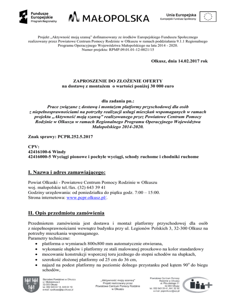 Projekt „Aktywność moją szansą” dofinansowany ze środków Europejskiego Funduszu Społecznego realizowany przez Powiatowe Centrum Pomocy Rodzinie w Olkuszu w ramach poddziałania 9.1.1 Regionalnego Programu Operacyjnego Województwa Małopolskiego na lata 2014 - 2020. Numer projektu: RPMP.09.01.01-12-0021/15 Olkusz, dnia 14.02.2017 rok ZAPROSZENIE DO ZŁOŻENIE OFERTY na dostawę z montażem o wartości poniżej 30 000 euro dla zadania pn.: Prace związane z dostawą i montażem platformy przyschodowej dla osób z niepełnosprawnościami na potrzeby realizacji usługi mieszkań wspomaganych w ramach projektu „Aktywność moją szansą” realizowanego przez Powiatowe Centrum Pomocy Rodzinie w Olkuszu w ramach Regionalnego Programu Operacyjnego Województwa Małopolskiego 2014-2020. Znak sprawy: PCPR.252.5.2017 CPV: 42416100-6 Windy 42416000-5 Wyciągi pionowe i pochyłe wyciągi, schody ruchome i chodniki ruchome I. Nazwa i adres zamawiającego: Powiat Olkuski - Powiatowe Centrum Pomocy Rodzinie w Olkuszu woj. małopolskie tel./fax. (32) 643 39 41 Godziny urzędowania: od poniedziałku do piątku godz. 7:00 – 15:00. Strona internetowa: www.pcpr.olkusz.pl/. II. Opis przedmiotu zamówienia Przedmiotem zamówienia jest dostawa i montaż platformy przyschodowej dla osób z niepełnosprawnościami wewnątrz budynku przy ul. Legionów Polskich 3, 32-300 Olkusz na potrzeby mieszkania wspomaganego. Parametry techniczne: platforma o wymiarach 800x800 mm automatycznie otwierana, wykonanie słupków i platformy ze stali malowanej proszkowo na kolor standardowy mocowanie konstrukcji wsporczej toru jezdnego do stopni schodów na słupkach, szerokość złożonej platformy od 25 cm do 36 cm, najazd na podest platformy na poziomie dolnego przystanku pod kątem 90o do biegu schodów, ,,Aktywność moją szansą" Projekt „Aktywność moją szansą” dofinansowany ze środków Europejskiego Funduszu Społecznego realizowany przez Powiatowe Centrum Pomocy Rodzinie w Olkuszu w ramach poddziałania 9.1.1 Regionalnego Programu Operacyjnego Województwa Małopolskiego na lata 2014 - 2020. Numer projektu: RPMP.09.01.01-12-0021/15 tor jezdny krzywolinijny (klataka schodowa podwójnie załamywana) 8 m., 2 przystanki, 1 zakret 90o, 2 zakręty 180o, prędkość jazdy 15 m/s, bezpieczny system sterowania na platformie, 2 kasety przywoławcze, udźwig min. 200 kg sposób składania i rozkładania podestu platformy: ręczny lub automatyczny, opis toru jazdy: dolny przystanek pod kątem 90o do biegu schodów, 5 schodów, zakręt 180o, 13 schodów, zakręt 180o ,5 schodów, górny przystanek do poziomu podestu, zasilanie 230 V, platforma powinna posiadać system przeciwzgnieceniowy, podest antypoślizgowy, rampy najazdów po obu krawędziach podestu, barierki i rampy zabezpieczające przed zjechaniem, blokada kluczykowa na platformie i kasetach przywoławczych, przycisk awaryjny STOP na platformie, poręcz na ścianie platformy ułatwiajaca wjazd gwarancja min 24 miesiace, komplet dokumentacji w języku polskim, badania dopuszczające urządzenie do eksploatacji dla potrzeb rejestracji urządzenia w Urzędzie Dozoru Technicznego W załączeniu rysunek z orientacyjnymi wymiarami klatki schodowej. Informujemy, że pomiary te zostały wykonane przez pracowników Powiatowego Centrum Pomocy Rodzinie w Olkuszu, wobec tego nie dajemy gwarancji ich poprawności ( pracownicy nie posiadają uprawnień do dokonywania takich pomiarów). Zaleca się aby oferent dokonał wizji lokalnej, po wcześniejszym ustaleniu terminu, w miejscu opisanym w przedmiocie zamówienia oraz uzyskał na swoją odpowiedzialność i ryzyko wszelkie istotne informacje, które mogą być konieczne do przygotowania oferty. Wizja lokalna zostanie dokonana na koszt własny Wykonawcy. Termin wykonania zamówienia: do dnia 31.05.2017 roku. Załączniki: - formularz ofertowy - oświadczenie o spełnianiu warunków udziału w postępowaniu - rysunek orientacjny klatki schodowej. III. Zakres wykluczenia W celu uniknięcia konfliktu interesów zamówienia publiczne, z wyjątkiem zamówień sektorowych, udzielane przez beneficjenta nie będącego podmiotem zobowiązanym do stosowania ustawy Pzp zgodnie z art. 3 ustawy Pzp, nie mogą być udzielane podmiotom powiązanym z nim osobowo lub kapitałowo. Przez powiązania kapitałowe lub osobowe rozumie się wzajemne powiązania między beneficjentem lub osobami upoważnionymi do zaciągania zobowiązań w imieniu beneficjenta lub osobami wykonującymi w imieniu beneficjenta czynności związane z przygotowaniem i przeprowadzeniem procedury wyboru wykonawcy a wykonawcą, polegające w szczególności na: ,,Aktywność moją szansą" Projekt „Aktywność moją szansą” dofinansowany ze środków Europejskiego Funduszu Społecznego realizowany przez Powiatowe Centrum Pomocy Rodzinie w Olkuszu w ramach poddziałania 9.1.1 Regionalnego Programu Operacyjnego Województwa Małopolskiego na lata 2014 - 2020. Numer projektu: RPMP.09.01.01-12-0021/15 a) uczestniczeniu w spółce jako wspólnik spółki cywilnej lub spółki osobowej, b) posiadaniu co najmniej 10 % udziałów lub akcji, c) pełnieniu funkcji członka organu nadzorczego lub zarządzającego, prokurenta, pełnomocnika, d) pozostawaniu w związku małżeńskim, w stosunku pokrewieństwa lub powinowactwa w linii prostej, pokrewieństwa drugiego stopnia lub powinowactwa drugiego stopnia w linii bocznej lub w stosunku przysposobienia, opieki lub kurateli. IV. Forma złożenia oferty Ofertę na formularzu (wg załącznika) należy składać w siedzibie Zamawiającego –sekretariat, Powiatowego Centrum Pomocy Rodzinie, ul. Piłsudskiego 21, 32 – 300 Olkusz do dnia 23.02.2017 r do godz. 15 00. Ofertę należy umieścić w zaklejonym, nieprzezroczystym opakowaniu (np. koperta) zaadresowanym i opisanym w poniższy sposób: Nadawca: Pełna nazwa i dokładny adres Wykonawcy (ulica, numer lokalu, miejscowość, numer kodu pocztowego) – (dopuszcza się cz