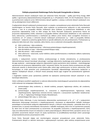 Polityka prywatności Rodzinnego Parku Rozrywki Energylandia w Zatorze Administratorem danych osobowych Gości jest właściciel Parku Rozrywki – spółka pod firmą Energy 2000 spółka z ograniczoną odpowiedzialnością Energylandia sp. k. (Przytkowice 532A, 34-141 Przytkowice). Dane te są przetwarzane wyłączne przez Administratora danych zgodnie z ustawą o ochronie danych osobowych oraz nie są udostępniane innym odbiorcom. Z wyłączeniem danych osobowych przetwarzanych, w związku z prowadzonym przez właściciela Parku Rozrywki monitoringiem na terenie Parku Rozrywki, dane osobowe są przetwarzane wyłącznie w celu wystawienia faktury, z tym że w przypadku biletów zniżkowych dane osobowe są przetwarzane dodatkowo w celu przyznania odpowiedniej zniżki na bilet wstępu do Parku Rozrywki (wykazania uprawnienia Gościa do przyznania odpowiedniej zniżki), natomiast w przypadku biletów całorocznych dodatkowo w celu wykonania karty całorocznej i poinformowania o możliwości jej odbioru przez Gościa. Dane szczególnie chronione w rozumieniu art. 27 ustawy o ochronie danych osobowych przetwarzane są – tylko w przypadku biletów zniżkowych – wyłącznie za pisemną zgodą Gościa w sposób adekwatny do celu przetwarzania. Przetwarzane są wyłącznie takie dane jak: imię i nazwisko, adres Gościa, oraz w zależności od przypadku odpowiednio: a) b) c) d) e) bilet urodzinowy – data urodzenia; bilet dla osoby niepełnosprawnej – informacja potwierdzająca niepełnosprawność; bilet dla kobiety w ciąży – informacja potwierdzająca ciążę; bilet dla seniora – data urodzenia; bilet całoroczny – wizerunek, numer telefonu celem poinformowania o możliwości odbioru wykonanej karty całorocznej, zawarte, z wyłączeniem numeru telefonu przekazywanego w drodze oświadczenia, w przekazywanej Administratorowi danych kserokopii aktualnego i ważnego dokumentu (wydanego przez podmiot uprawniony do jego wydania) – zawierającego wyłącznie odpowiednie wyżej wymienione dane osobowe – stwierdzającego uprawnienie do przyznania odpowiedniej zniżki i tożsamość Gościa. Na życzenie Gościa przetwarzany jest jego wizerunek zawarty w dostarczonym przez Gościa pliku celem jego zamieszczenia na karcie całorocznej. Gość korzystający ze zniżki powinien przy przekazywaniu kserokopii odpowiedniego dokumentu (wyłącznie w zakresie niezbędnych danych, o których mowa powyżej) okazać jego oryginał lub poświadczenie zgodności odpisu z oryginałem wydane przez uprawniony podmiot do wykazania autentyczności danych zawartych w ww. kserokopii dokumentu. Celem uniknięcia wszelkich wątpliwości w zakresie dokumentów stwierdzających uprawnienie do odpowiedniej zniżki wskazuje się następujące dokumenty: a) potwierdzające datę urodzenia, tj.: dowód osobisty, paszport, legitymacja szkolna, akt urodzenia, prawo jazdy; b) potwierdzające niepełnosprawność, tj.: orzeczenie o niepełnosprawności, legitymacja osoby niepełnosprawnej, legitymacja emeryta-rencisty wyłącznie z oznaczeniem (symbolem świadczenia): „S” lub „I”; legitymacja Polskiego Związku Niewidomych; c) potwierdzające fakt ciąży, tj.: karta ciąży. Właściciel Parku informuje, iż przy kserowaniu dokumentów wymienionych w lit. „a” i „b” z wyłączeniem dokumentu dotyczącego orzeczenia o niepełnosprawności: stosowane są odpowiednie nakładki maskujące pozwalające na kserowanie wyłącznie odpowiednich danych, o których mowa powyżej – pozostałe dane nie są przetwarzane; w sytuacji niemożliwości skorzystania z nakładki maskującej, dane inne niż wymienione powyżej (tj. dane inne niż dane przetwarzane) są zaczerniane. W przypadku orzeczenia o niepełnosprawności, karty ciąży oraz dokumentów innych niż wskazane w zdaniu poprzedzającym, Właściciel Parku uprzejmie zwraca się o uprzednie zaczernienie danych innych niż wyżej wymienione na przedkładanej kserokopii celem sprawnego przeprowadzenia procesu przyznawania zniżki. Teren Parku Rozrywki objęty jest monitoringiem wizyjnym prowadzonym przez właściciela Parku. Przetwarzanie danych w zakresie wizerunku i wykonywanych czynności, jakie zostaną zarejestrowane przez kamery tego systemu następuje, stosownie do przepisów ustawy o ochronie danych osobowych (art. 23 ust. 1 pkt 5), ze względu na bezpieczeństwo ochrony życia i zdrowia Gości oraz ochronę mienia (cel przetwarzania). Przetwarzanie danych w zakresie wizerunku Gościa uwidocznionego na zdjęciu, wykonanym wyłącznie z kamery umieszczonej na trasie Roller Coaster’ów (kolejek górskich), obejmującym wizerunek korzystających z tej atrakcji Gości, następuje stosownie do przepisów ustawy o ochronie danych osobowych, ze względu na możliwość zakupienia przez Gościa zdjęcia pamiątkowego z jazdy Roller Coaster’em. Podanie przez Gości ich danych w wyżej wymienionym zakresie jest dobrowolne, jednakże niepodanie tych danych lub niewyrażenie zgody na ich przetwarzanie skutkowałoby brakiem możliwości odpowiednio: wystawienia faktury, przyznania zniżki na bilet wstępu do Parku, wykonania karty całorocznej i poinformowania o możliwości jej odbioru przez Gościa, lub zachowania bezpieczeństwa ochrony życia i zdrowia Gości oraz ochrony mienia w związku z prowadzonym monitoringiem wizyjnym, czy wykonana zdjęcia pamiątkowego z jazdy Roller Coaster’em. Goście mają prawo dostępu do treści swoich danych oraz ich poprawiania. Więcej informacji, w zakresie i w sposób przewidziany ustawą o ochronie danych osobowych, można uzyskać kierując stosowne zapytanie do Administratora danych osobowych.